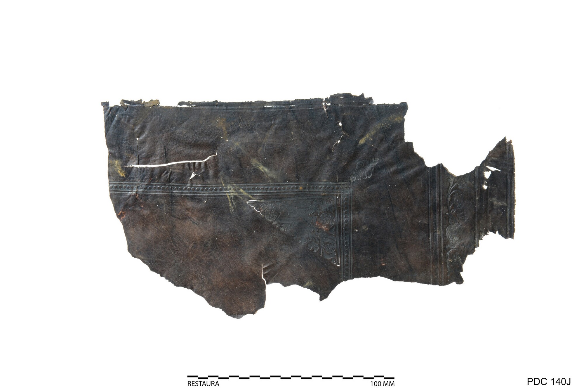 Heel dun fragment van een leren bekleding van een boekband, dat vermoedelijk over een kartonnen plat geplakt is geweest met blind- en zilverdruk decoratie. Waarschijnlijk is dit slechts de afgesplitste, bovenste laag van het leer.