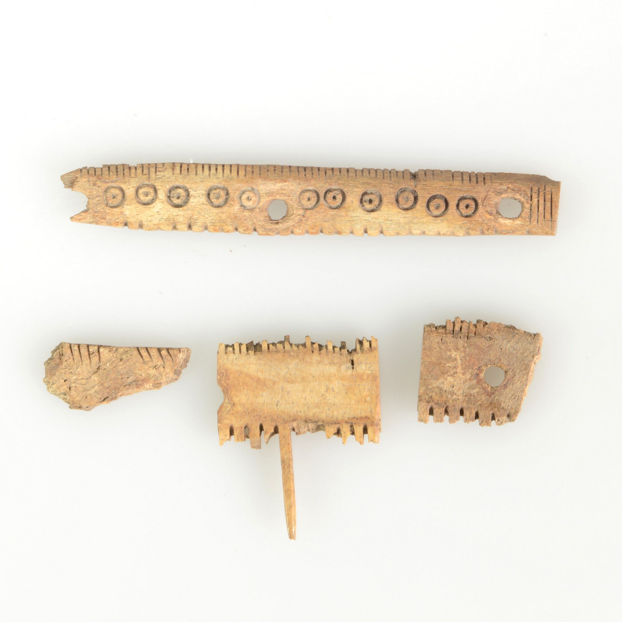 Kam; tweetandig; vier fragmenten; punt-cirkelversiering