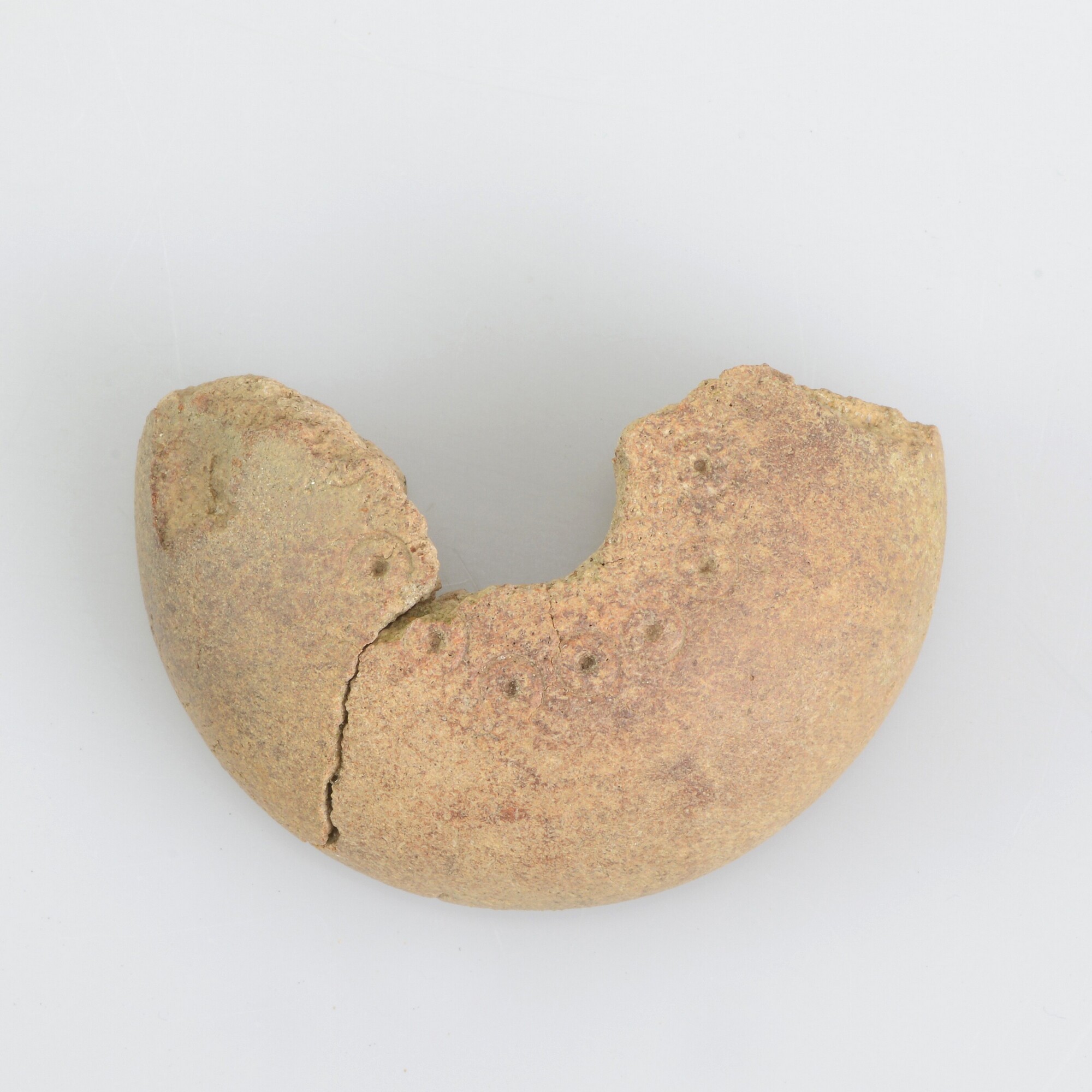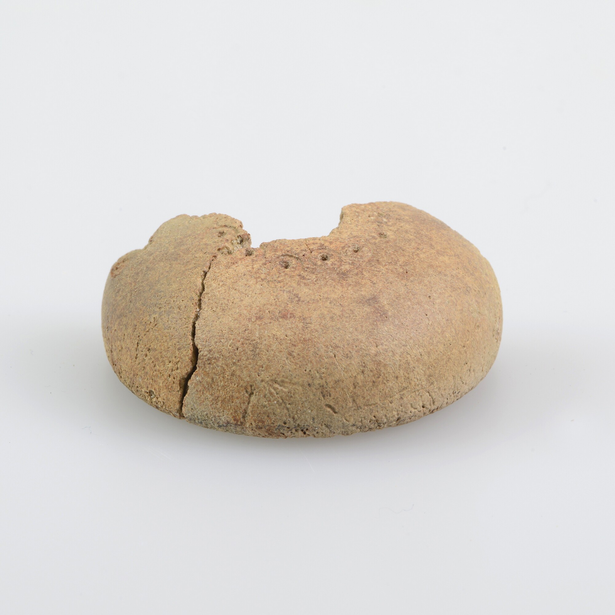 Spinklos; vervaardigd uit de caput femur van een rund?; puntcirkelversiering rondom een centraal gat