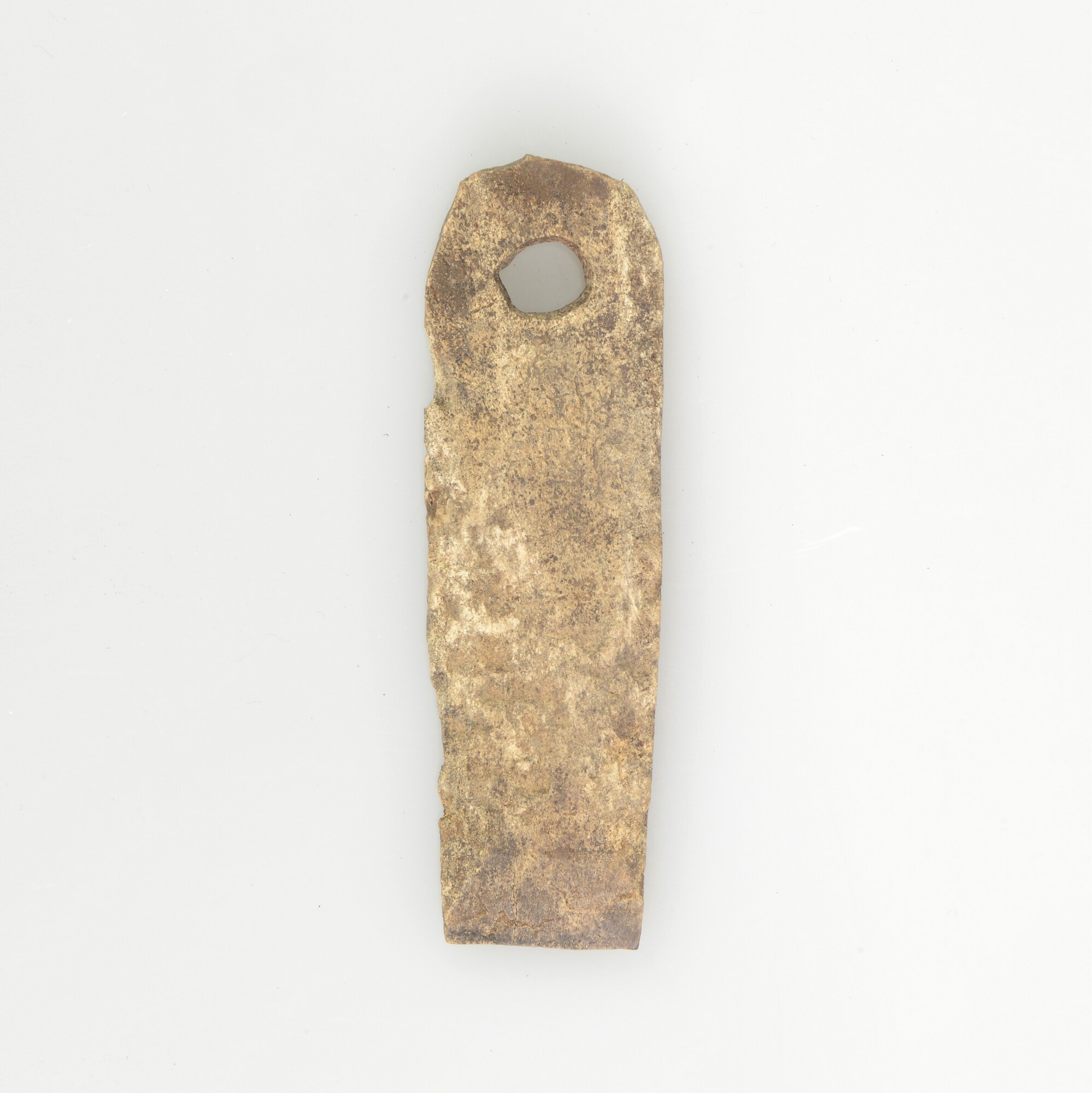 Hanger?; functie onbekend; vervaardigd uit een geweifragment van een edelhert (Cervus elaphus); een zijde voorzien van een oog en de andere zijde is afgeplat beitelvormig