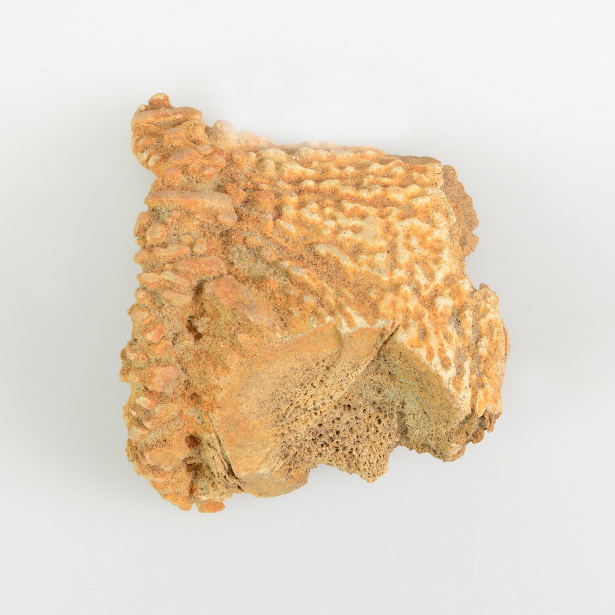 Gewei; fragment van de basis (rozenkrans) van een afgeworpen gewei van een edelhert; aan een zijde zijn haksporen aanwezig