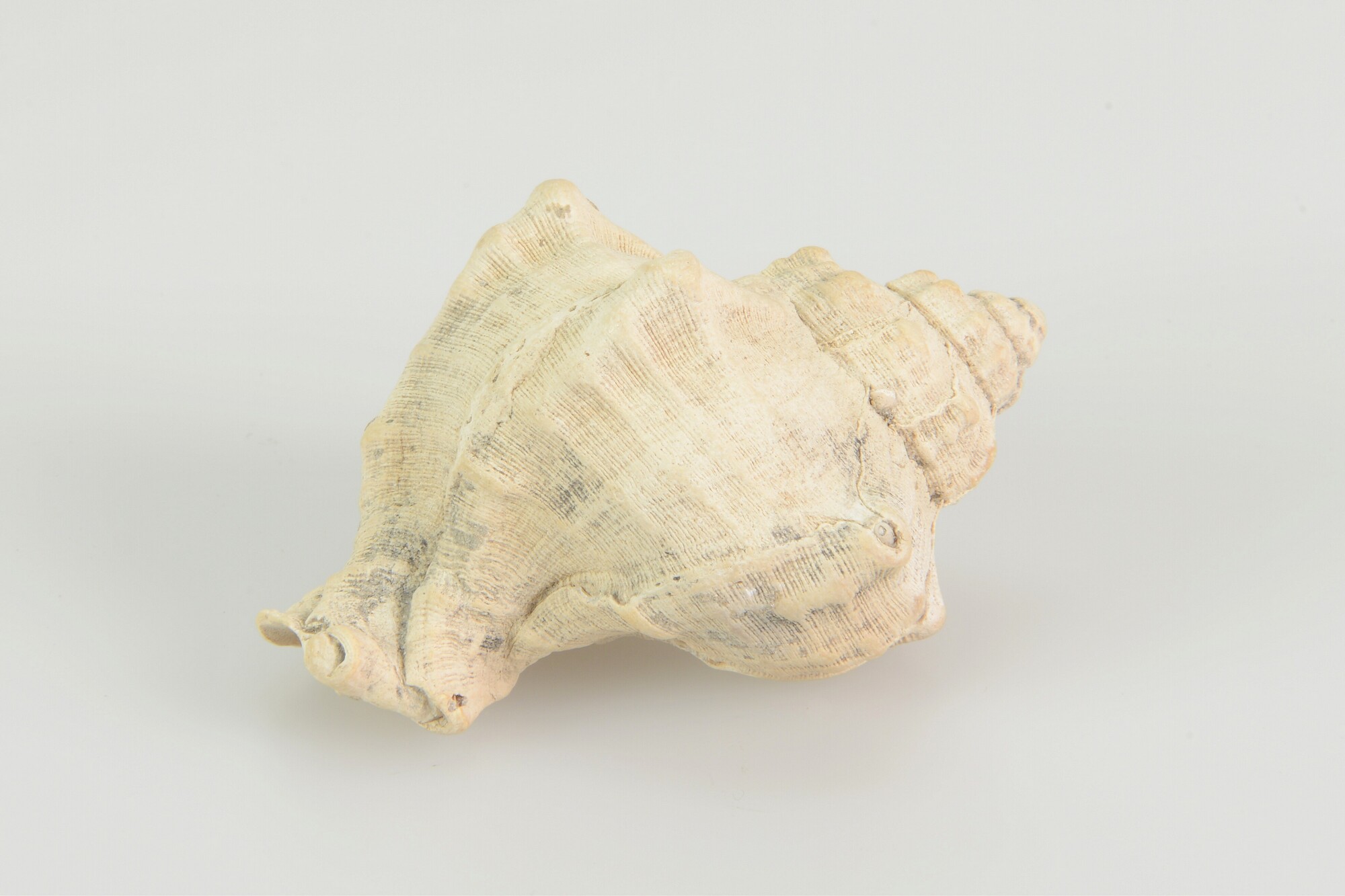 Schelp Hexaplex trunculus (Linnaeus 1758); bruinig grijswit van kleur, met vaag nog zichtbaar de afwisseling van donkere en lichtere banden, in de opening grijzige patronen; middelmatige scherpte in de uiterlijke patronen met door slijtage iets afgeronde punten van de knobbels; opening rechts, in de opening geheel geen mate van doorschijnendheid als teken van fossilisatie. Gewicht: ...
