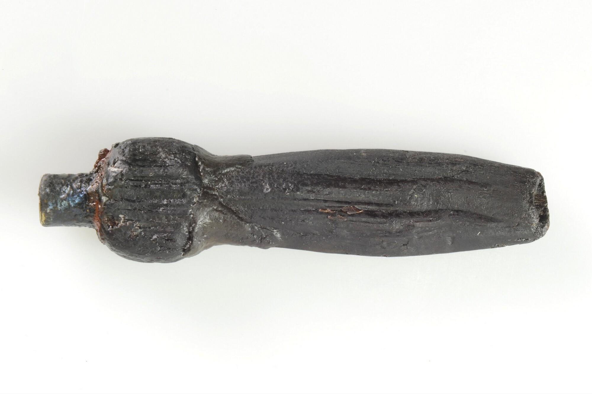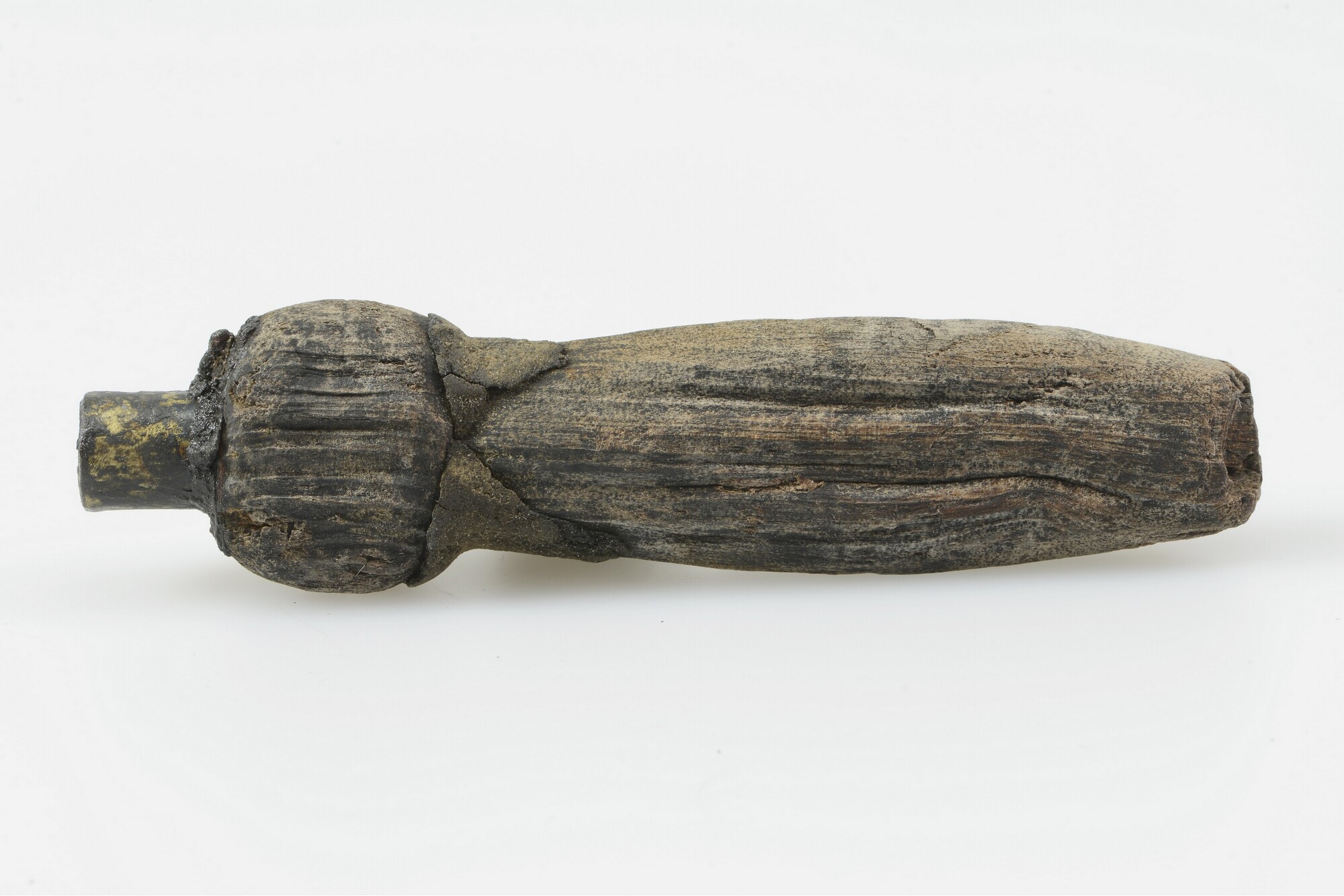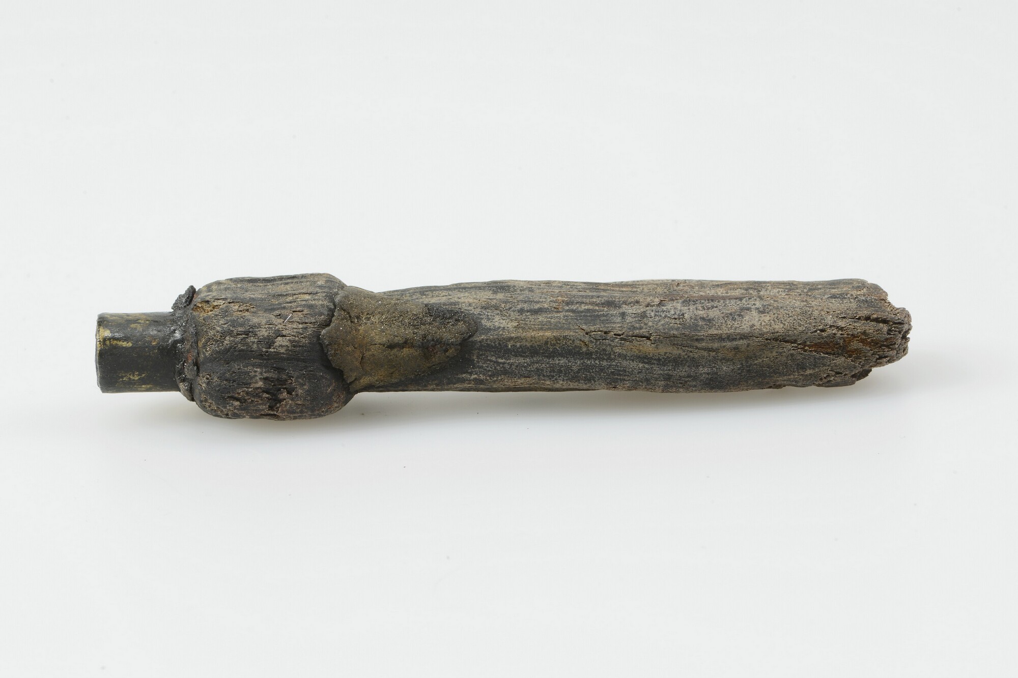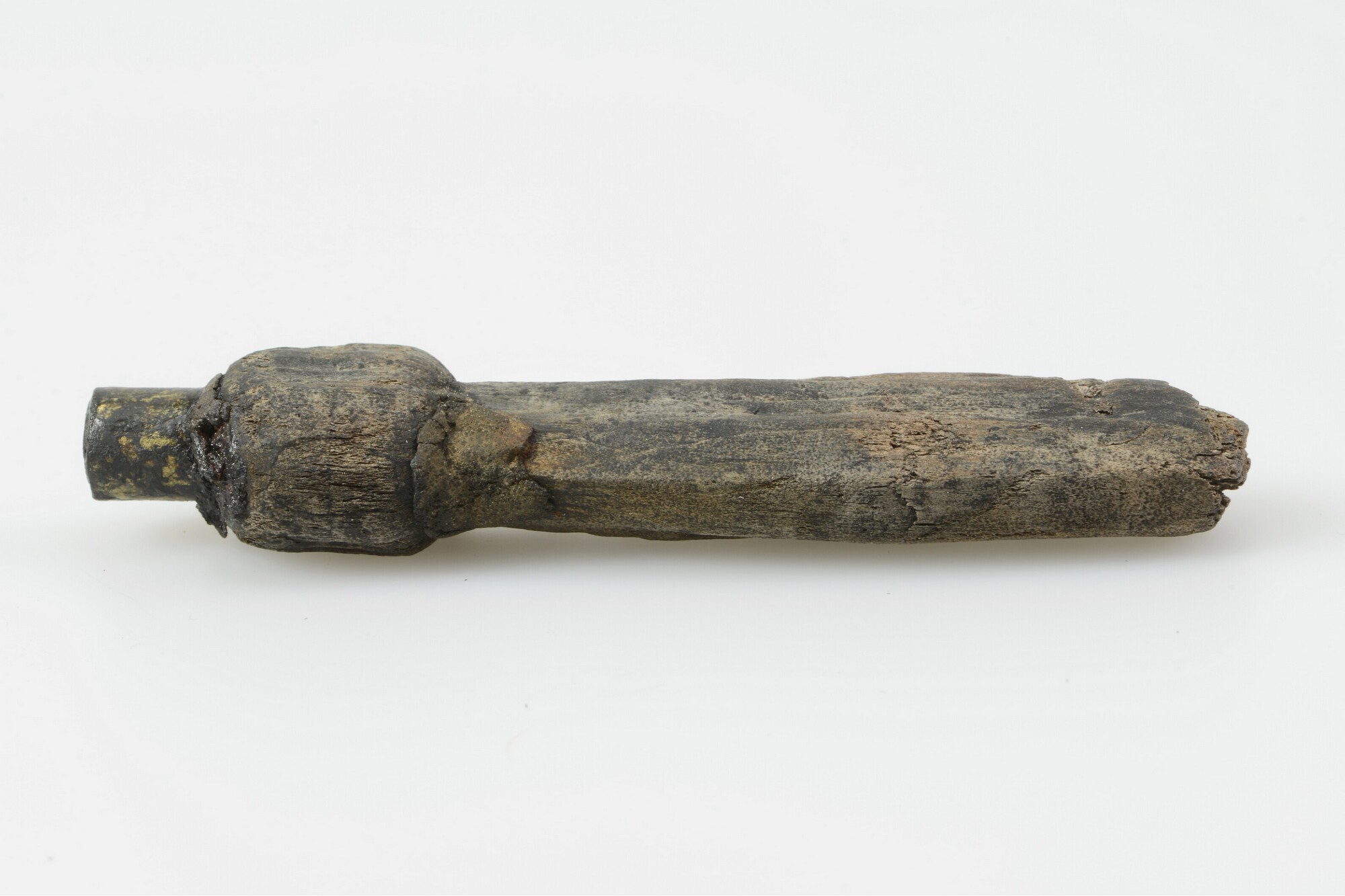 Lontstok; fragment handvat met messing dop op uiteinde; fragment uit gekliefd stamhout; gewicht: 63 gram