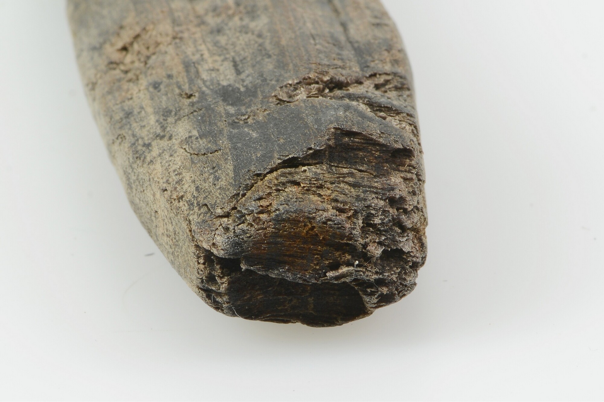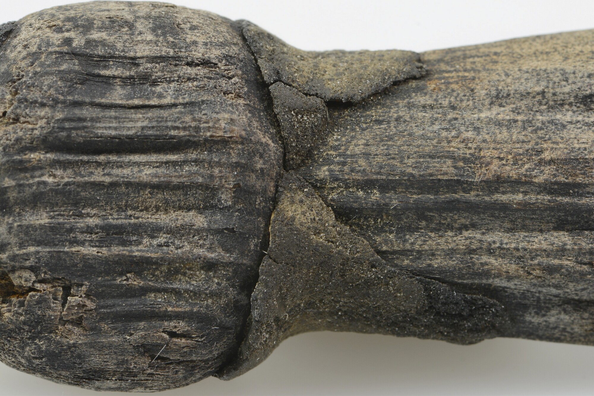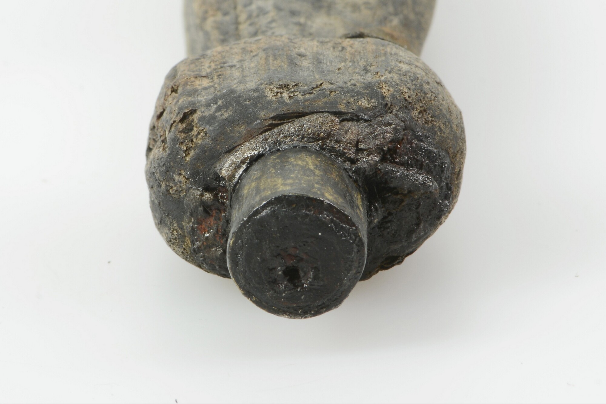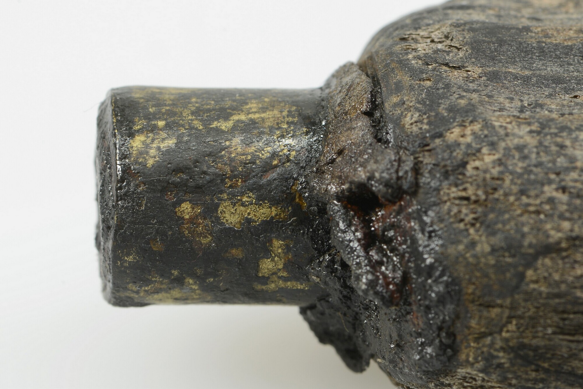 Lontstok; fragment handvat met messing dop op uiteinde; fragment uit gekliefd stamhout; gewicht: 63 gram