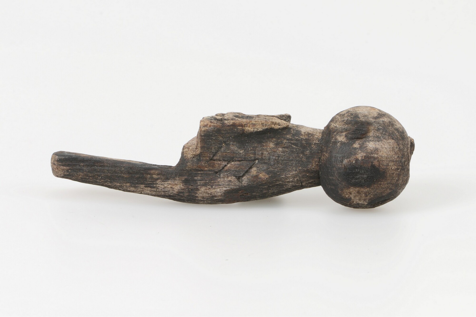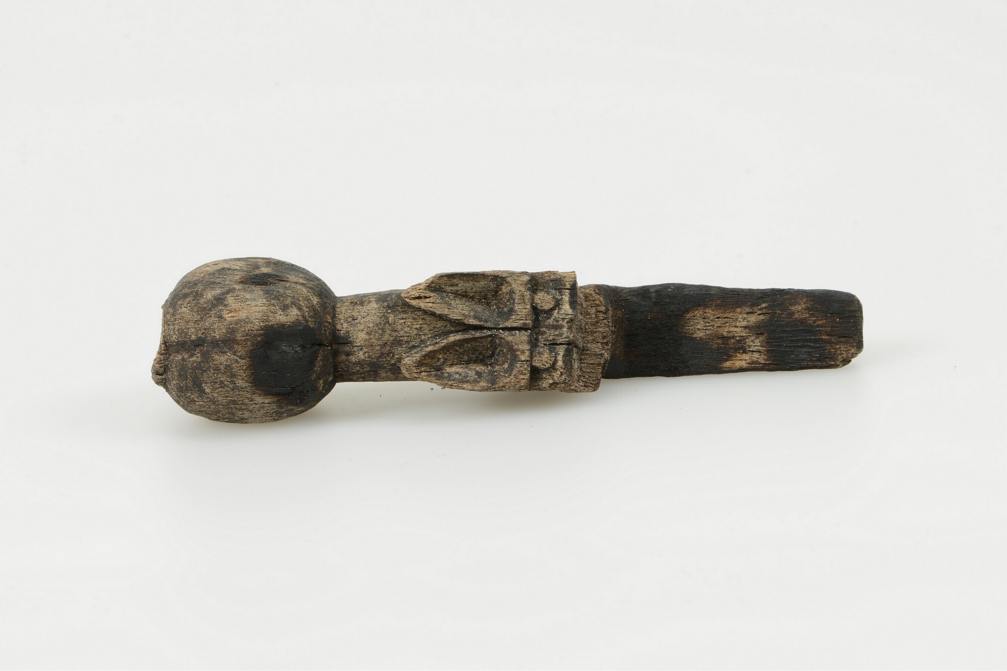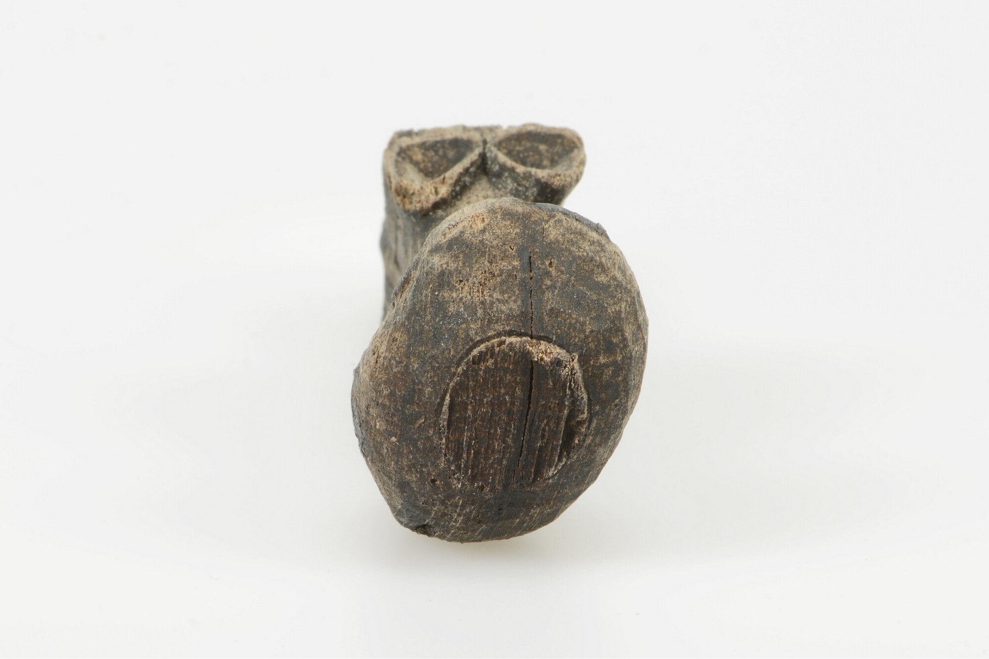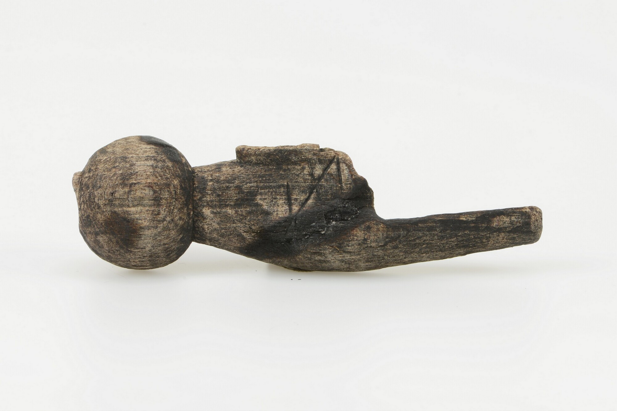 Lontstok; fragment; het lontuiteinde, gesneden in de vorm van een knop met daarvoor een wolfskop, waarvan de bovenkant is weggebroken; de oren zijn herkenbaar en onderkant bek (waarin de lont werd vastgezet) is compleet aanwezig; links en rechts onder de oren een ingekerfd ‘huismerk’, maar beide verschillend; uit gekliefd stamhout; brandsporen; gewicht: 53 gram.