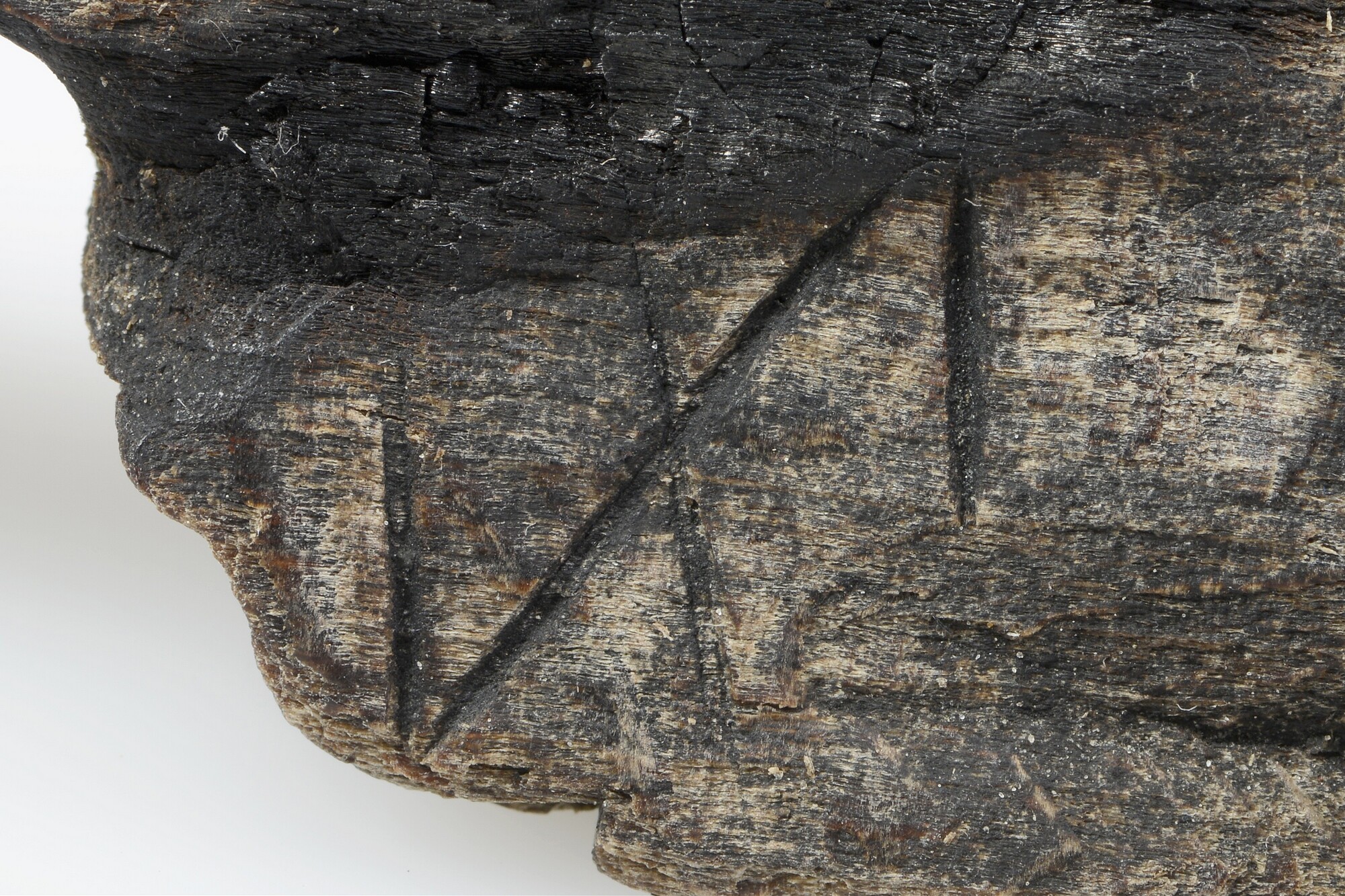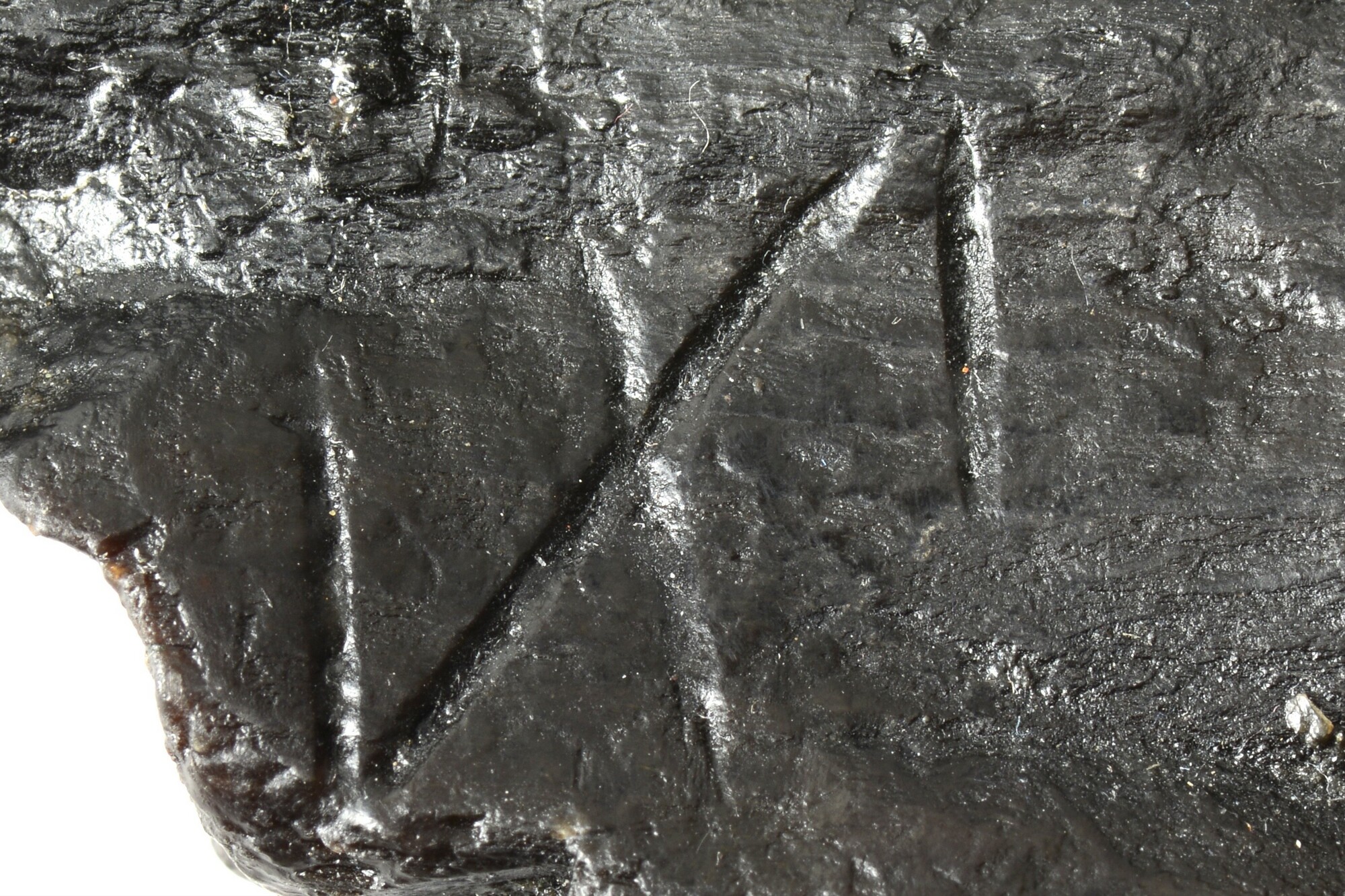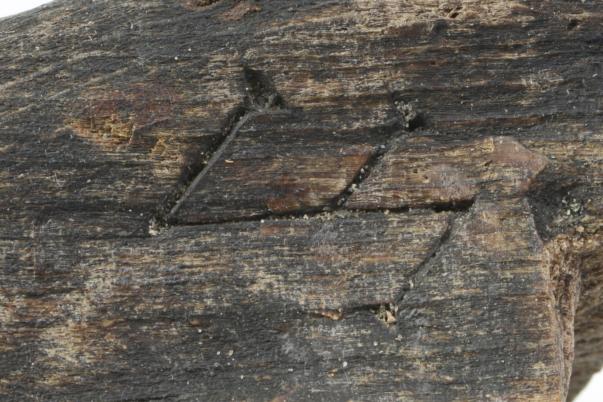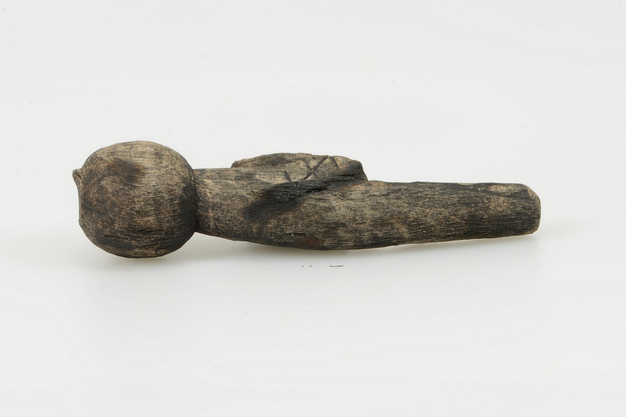 Lontstok; fragment; het lontuiteinde, gesneden in de vorm van een knop met daarvoor een wolfskop, waarvan de bovenkant is weggebroken; de oren zijn herkenbaar en onderkant bek (waarin de lont werd vastgezet) is compleet aanwezig; links en rechts onder de oren een ingekerfd ‘huismerk’, maar beide verschillend; uit gekliefd stamhout; brandsporen; gewicht: 53 gram.