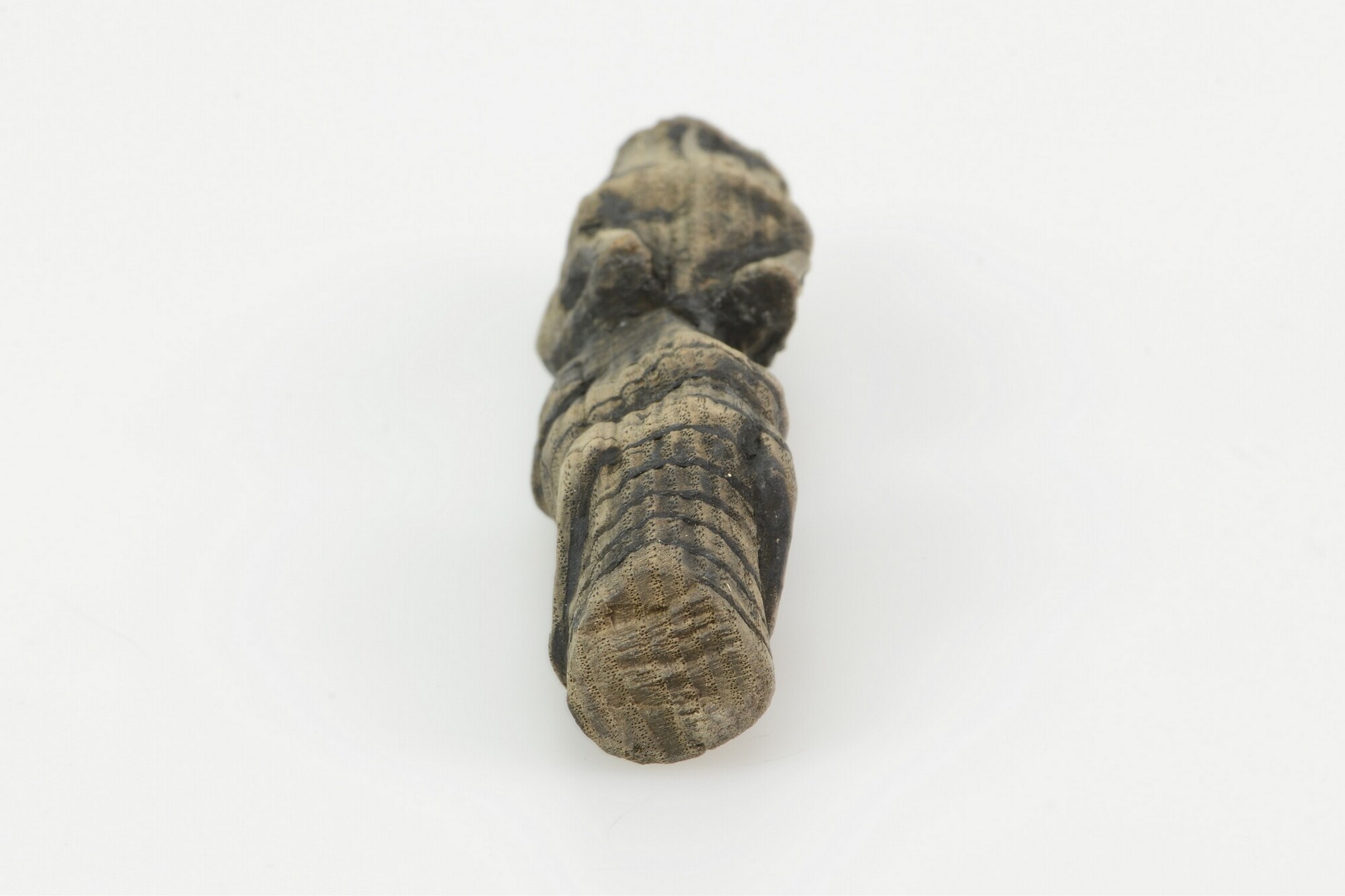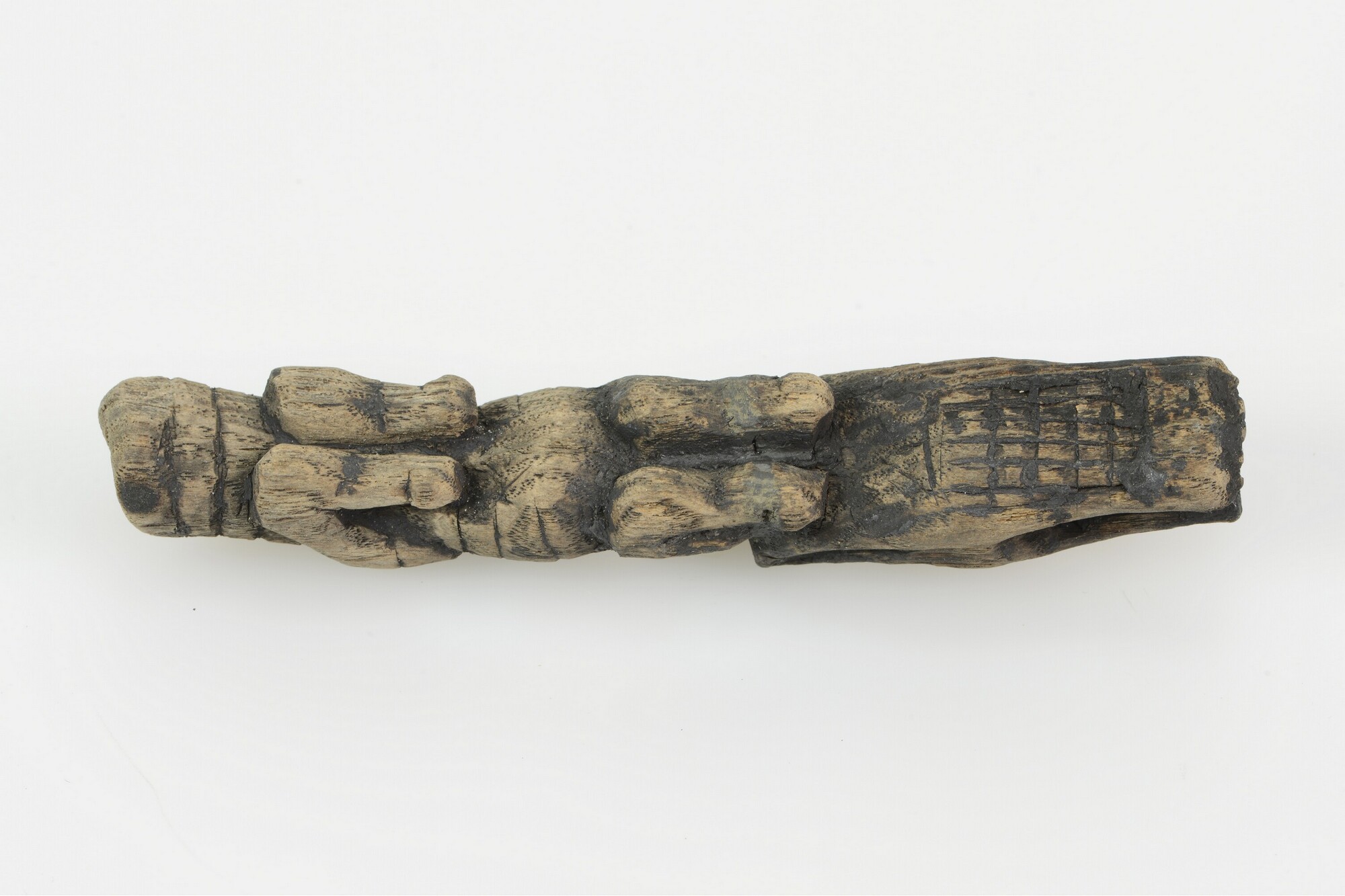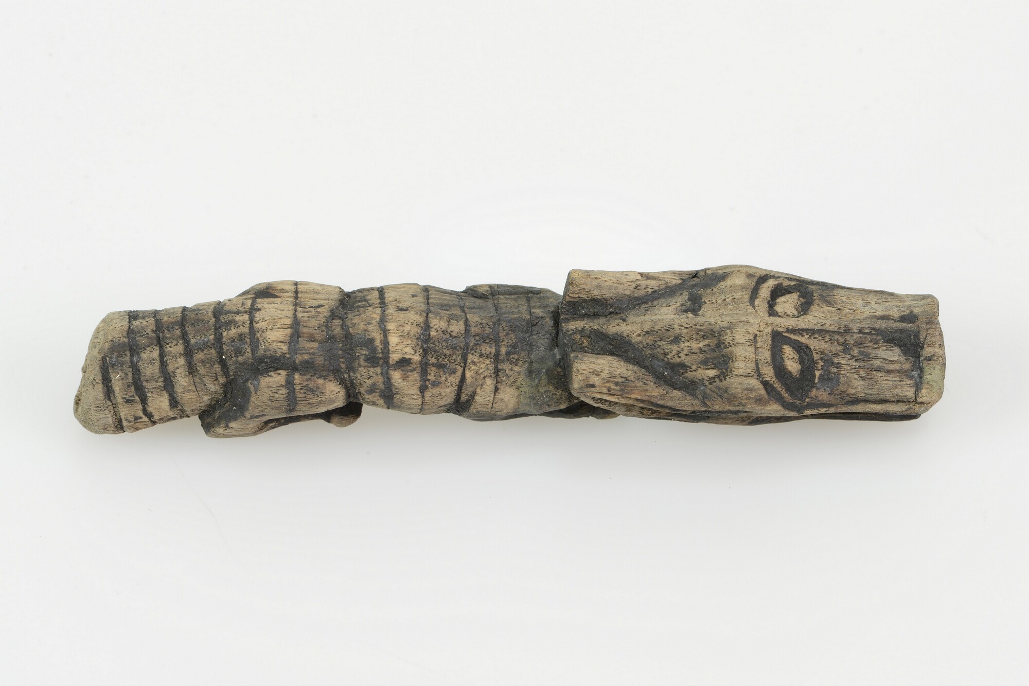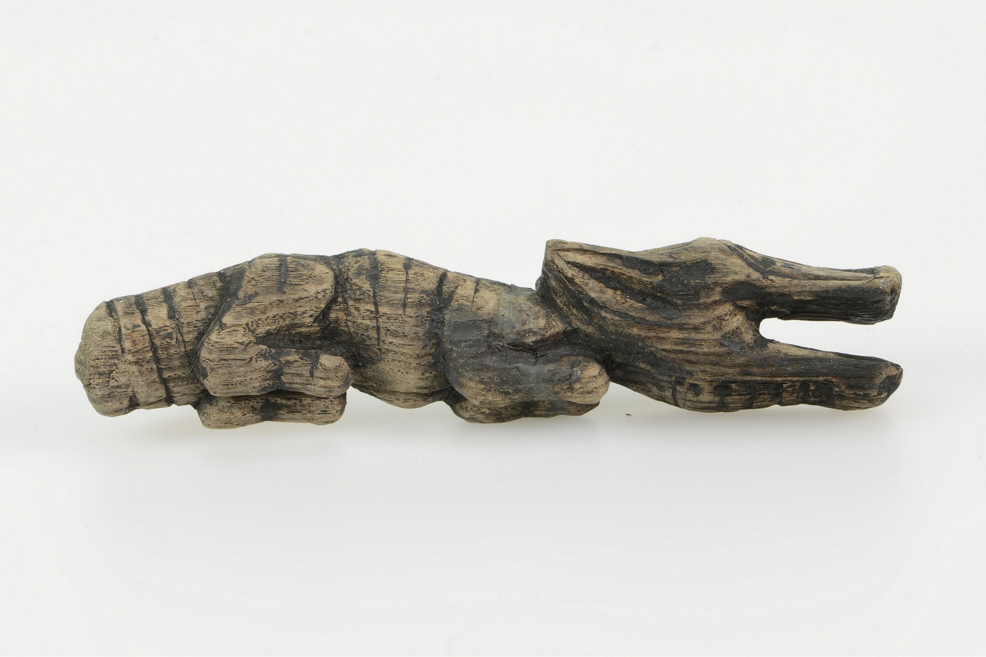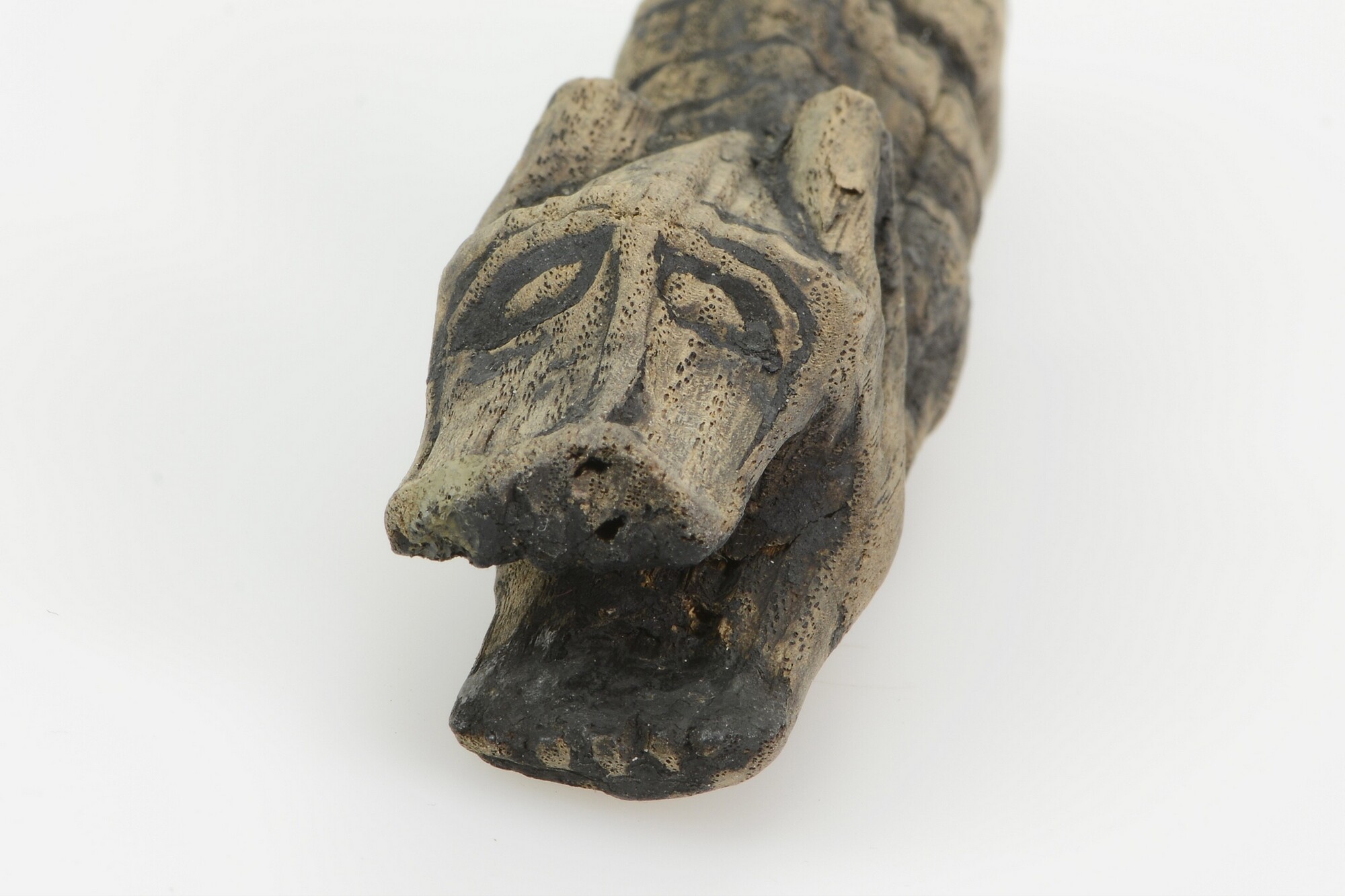 Lontstok; het complete lontuiteinde, gesneden in de vorm van het lichaam van een wolf, massief gesneden, met vier onder het lichaam gevouwen poten en een grote kop met oren, ogen en een geopende bek, waarin de lont werd gevat; van de dunne lont is een fragmentje aanwezig. De lont is een driestrengs rechtsgeslagen eindje vezels ...