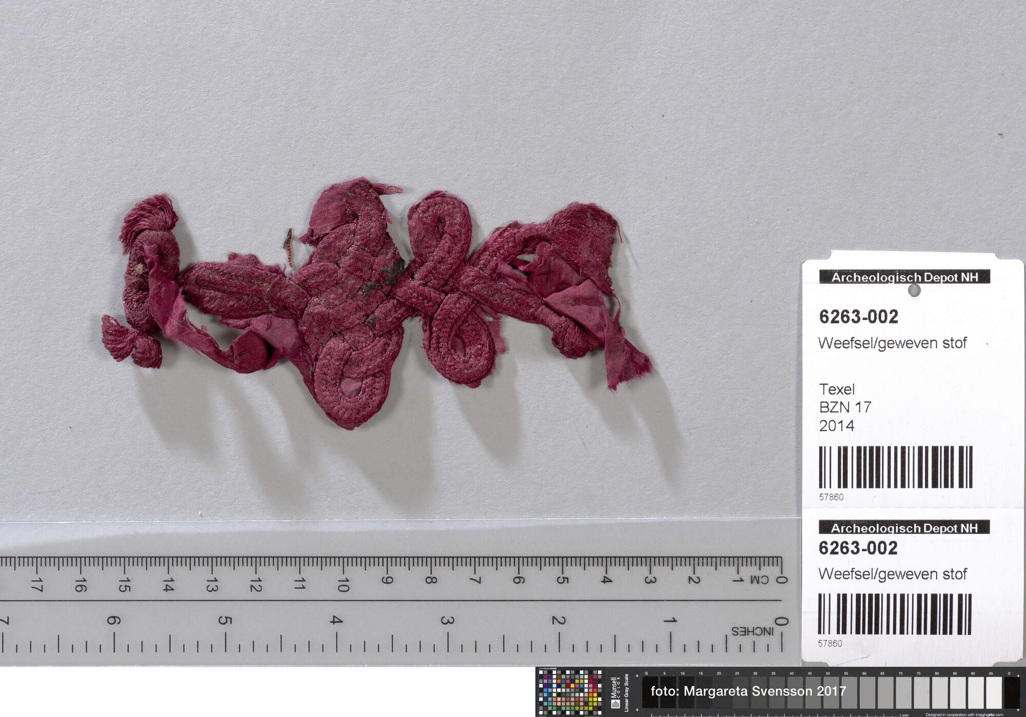 Fragment; deel van sluiting van gevlochten band (knoop); op basisweefsel van zijde; in platbinding