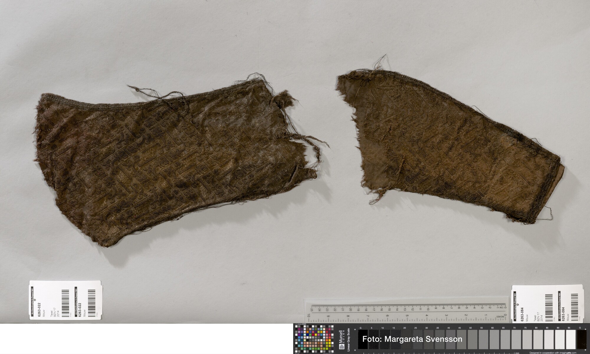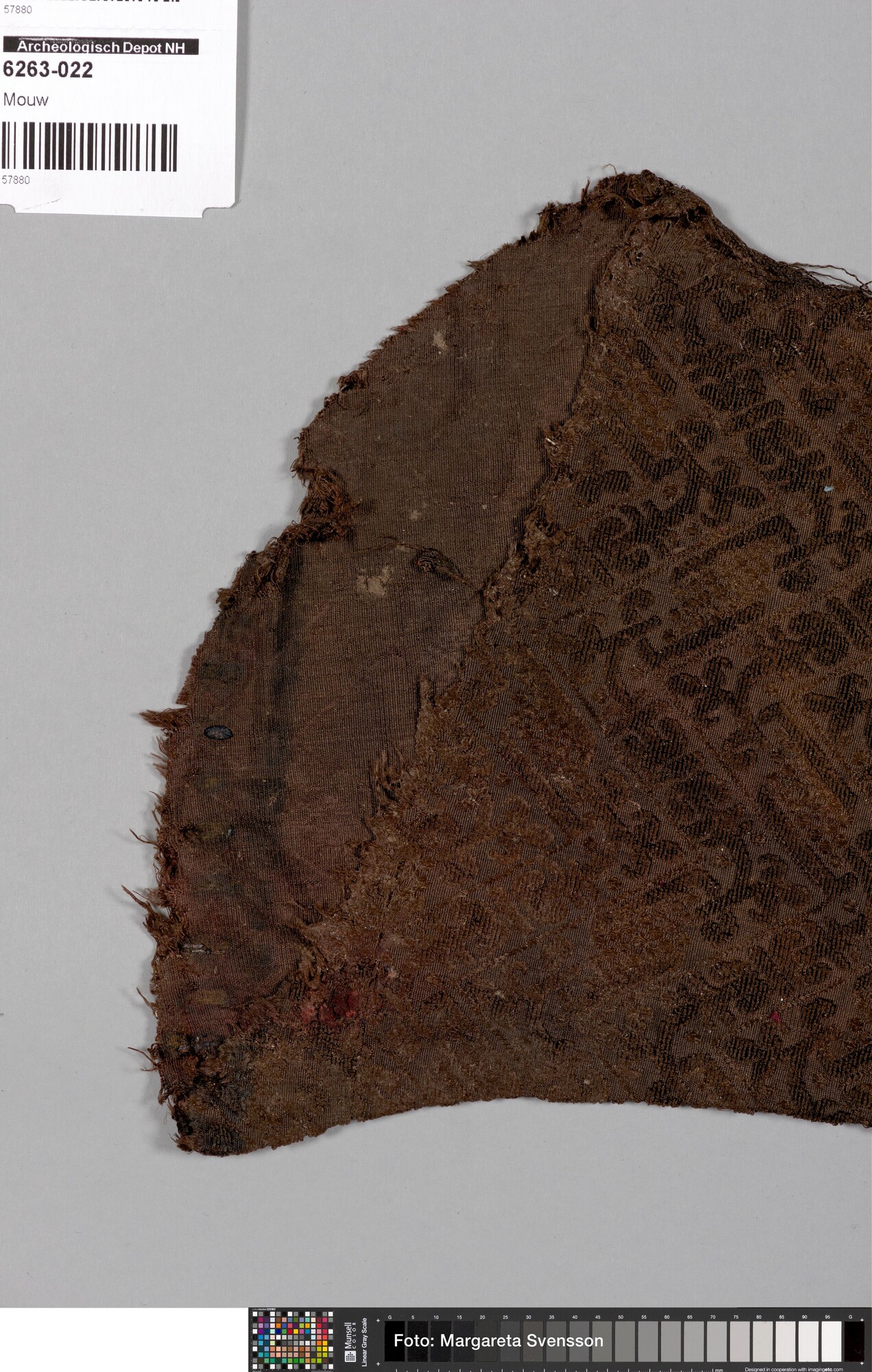 Mouw (L) bovenarm; gestileerd floraal motief in zigzagpatroon, lussenpool; in het passement komt metaaldraad voor