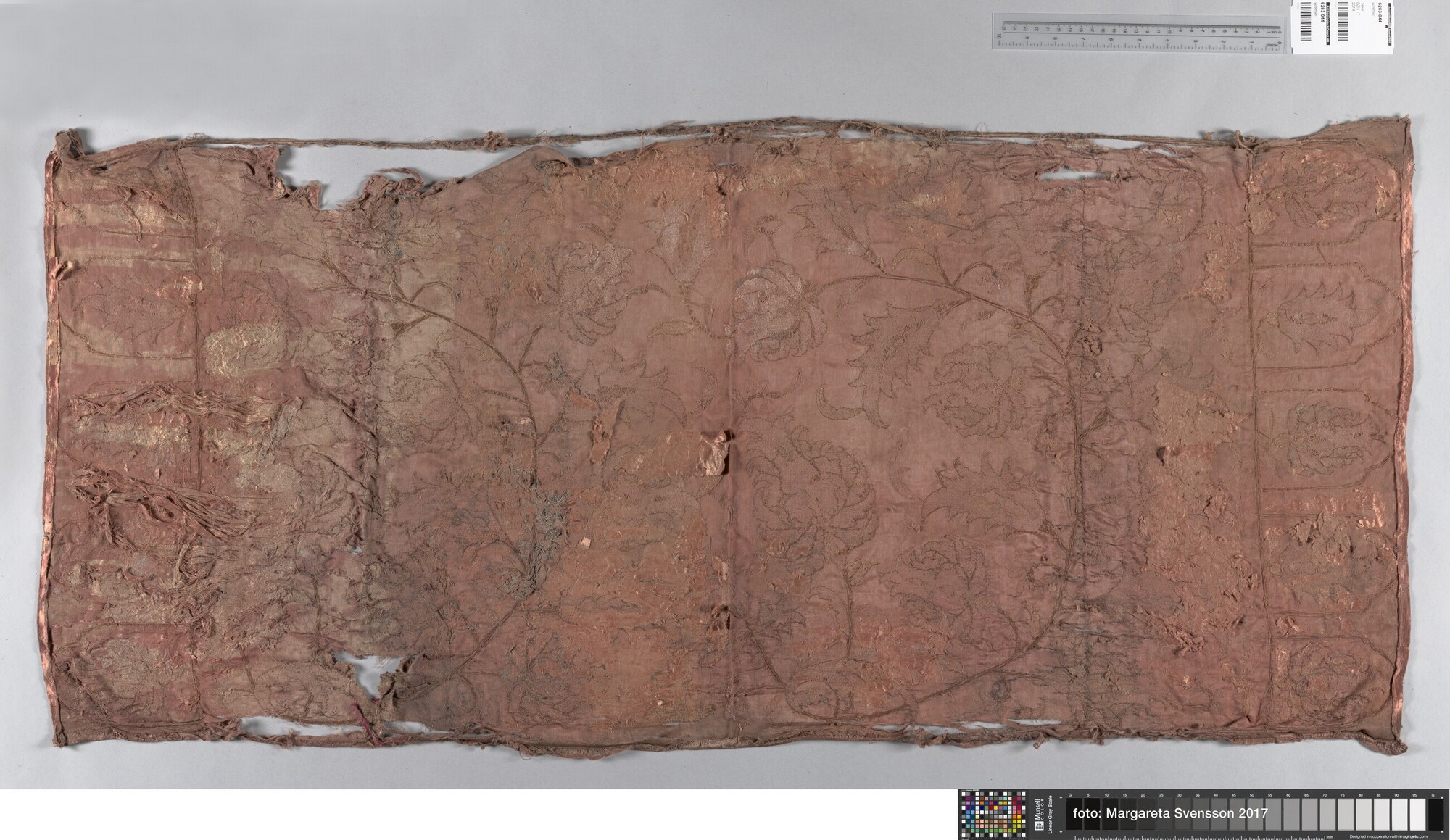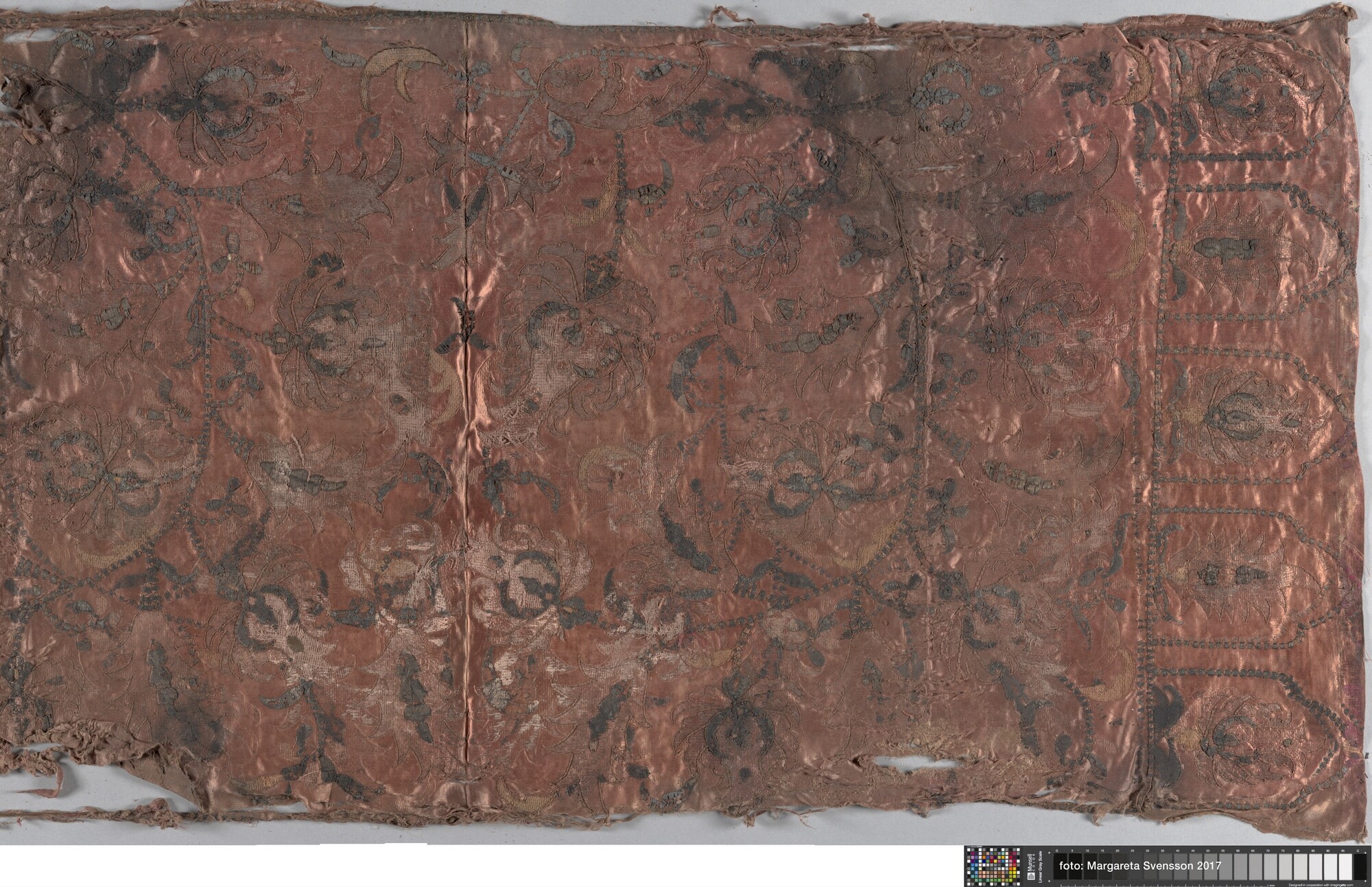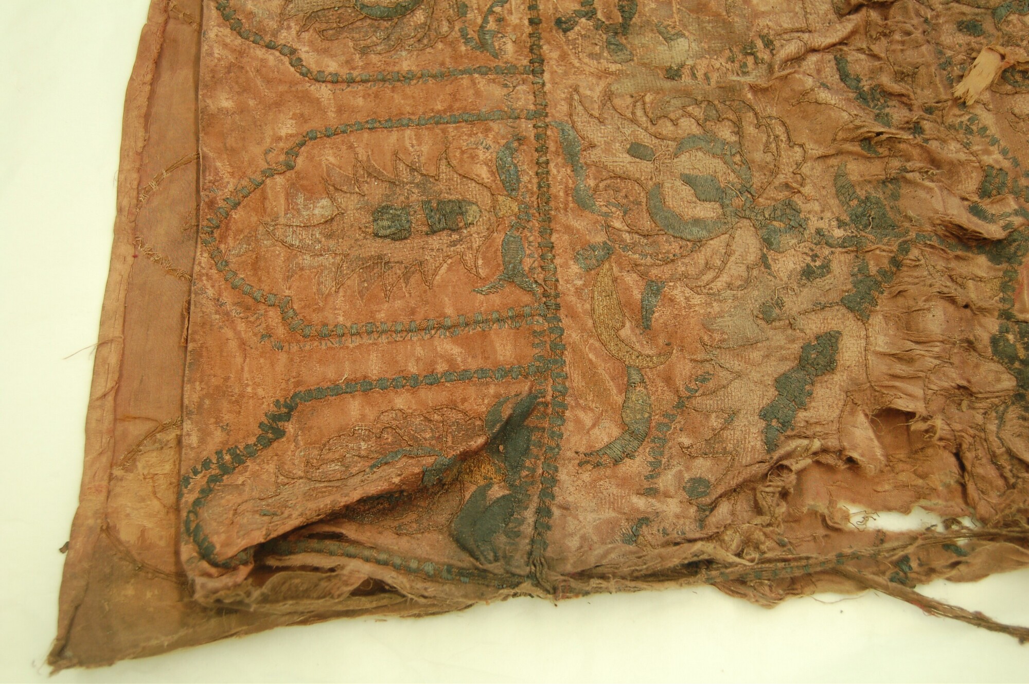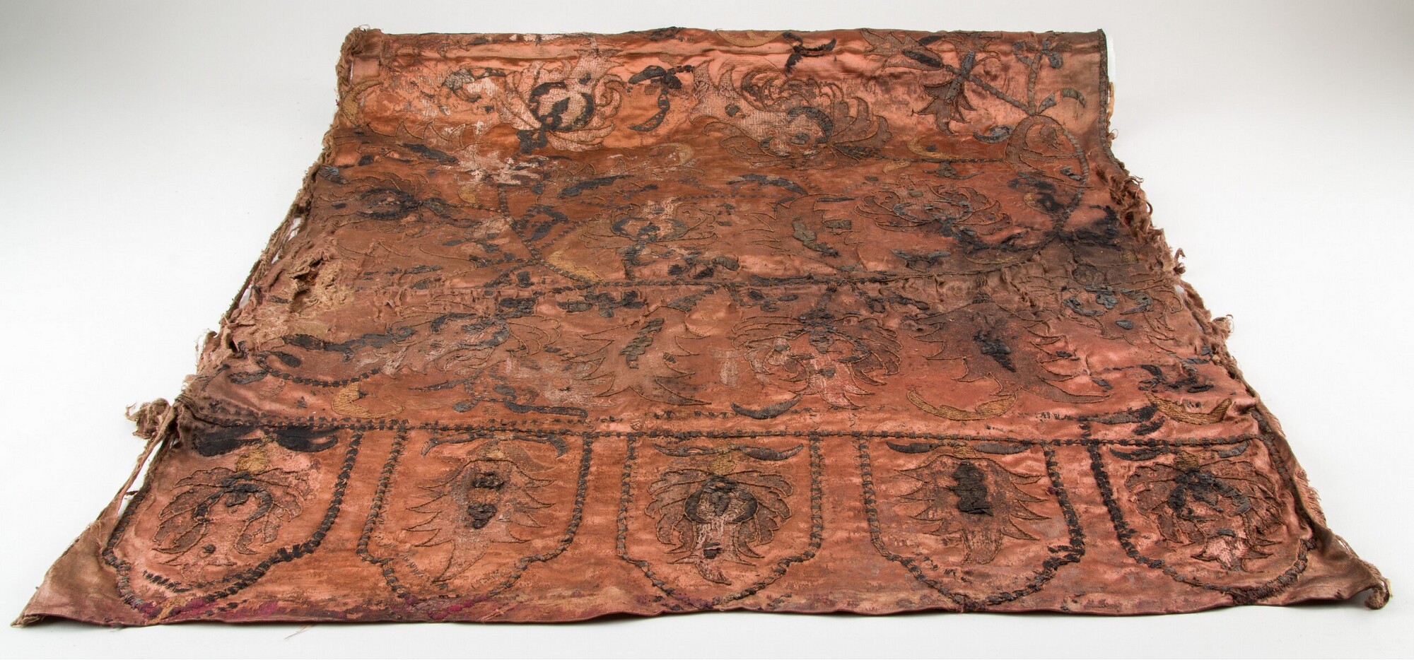 Geborduurde lap; rechthoekig; zijden satijn, geborduurd met garen en verguld zilverdraad; Ottomaans