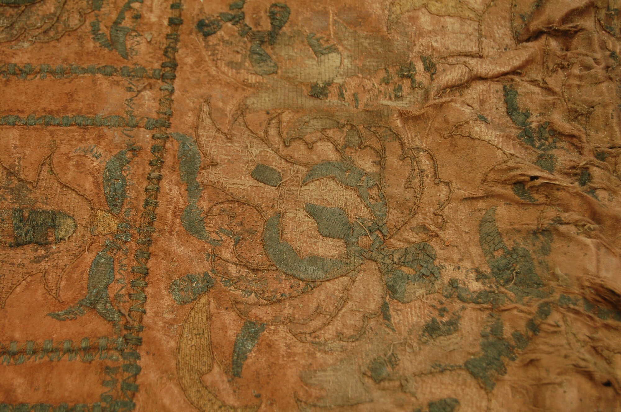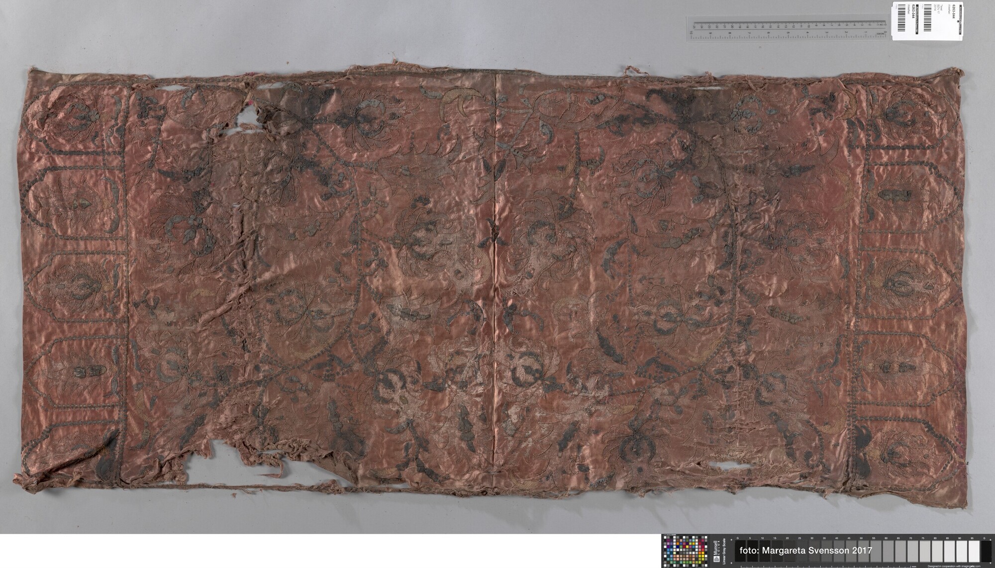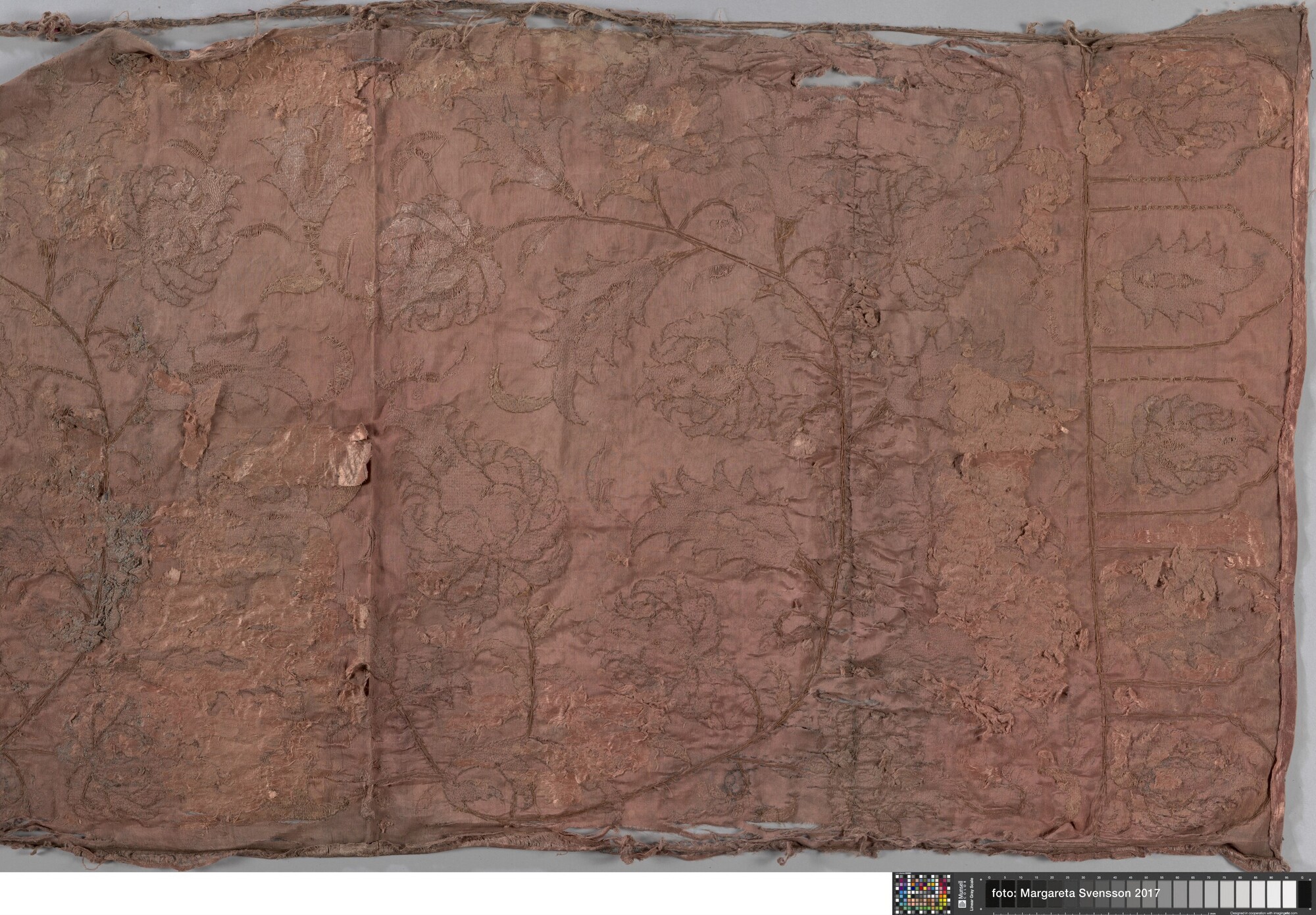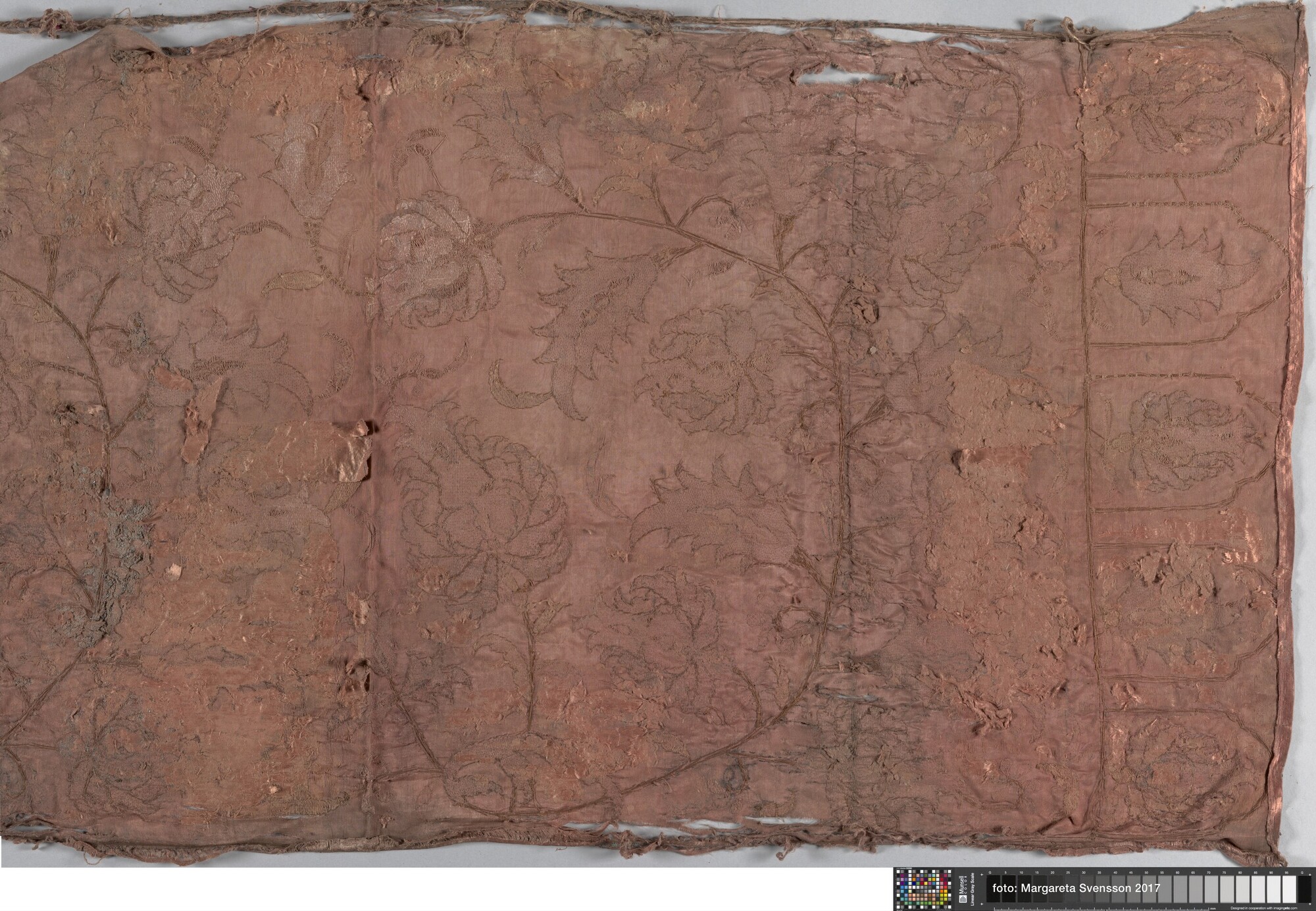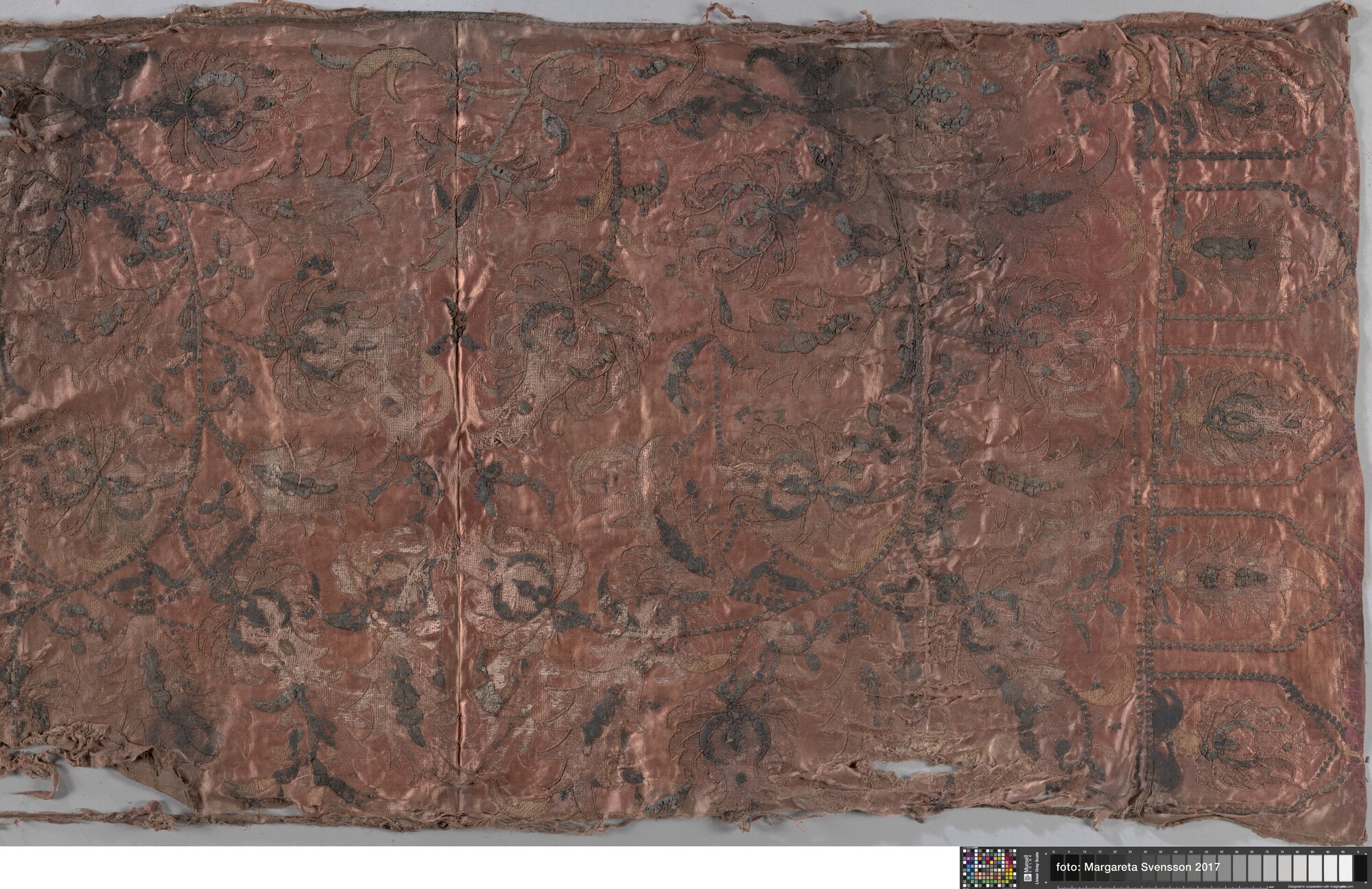 Geborduurde lap; rechthoekig; zijden satijn, geborduurd met garen en verguld zilverdraad; Ottomaans