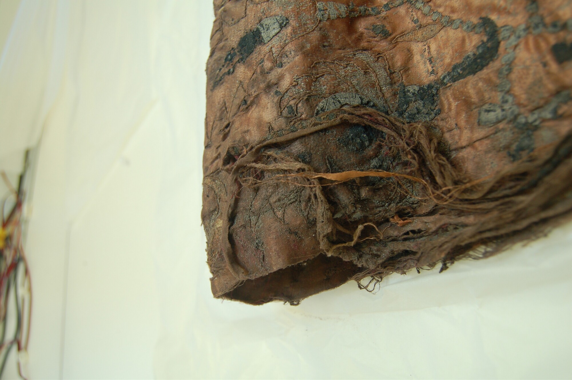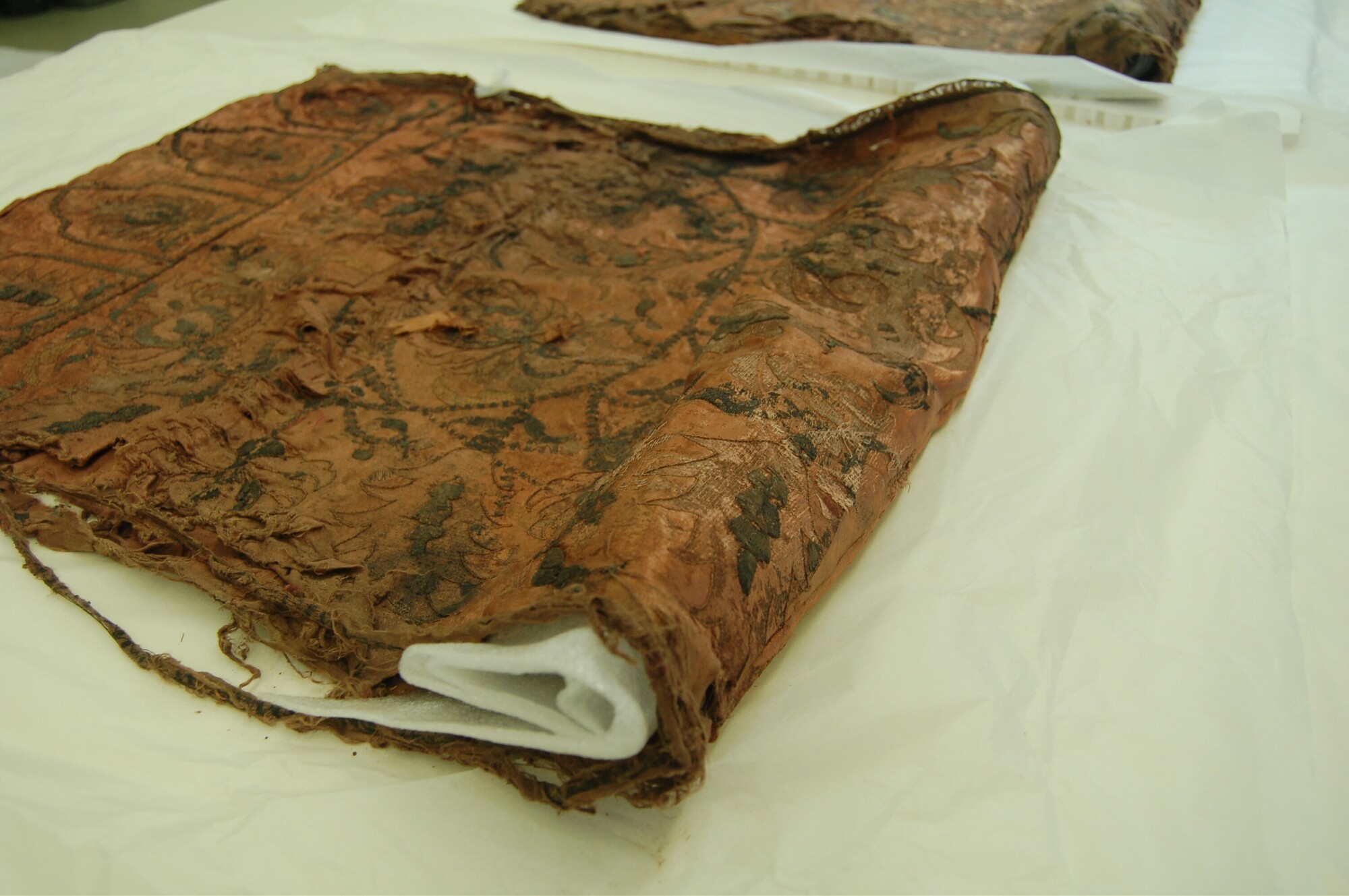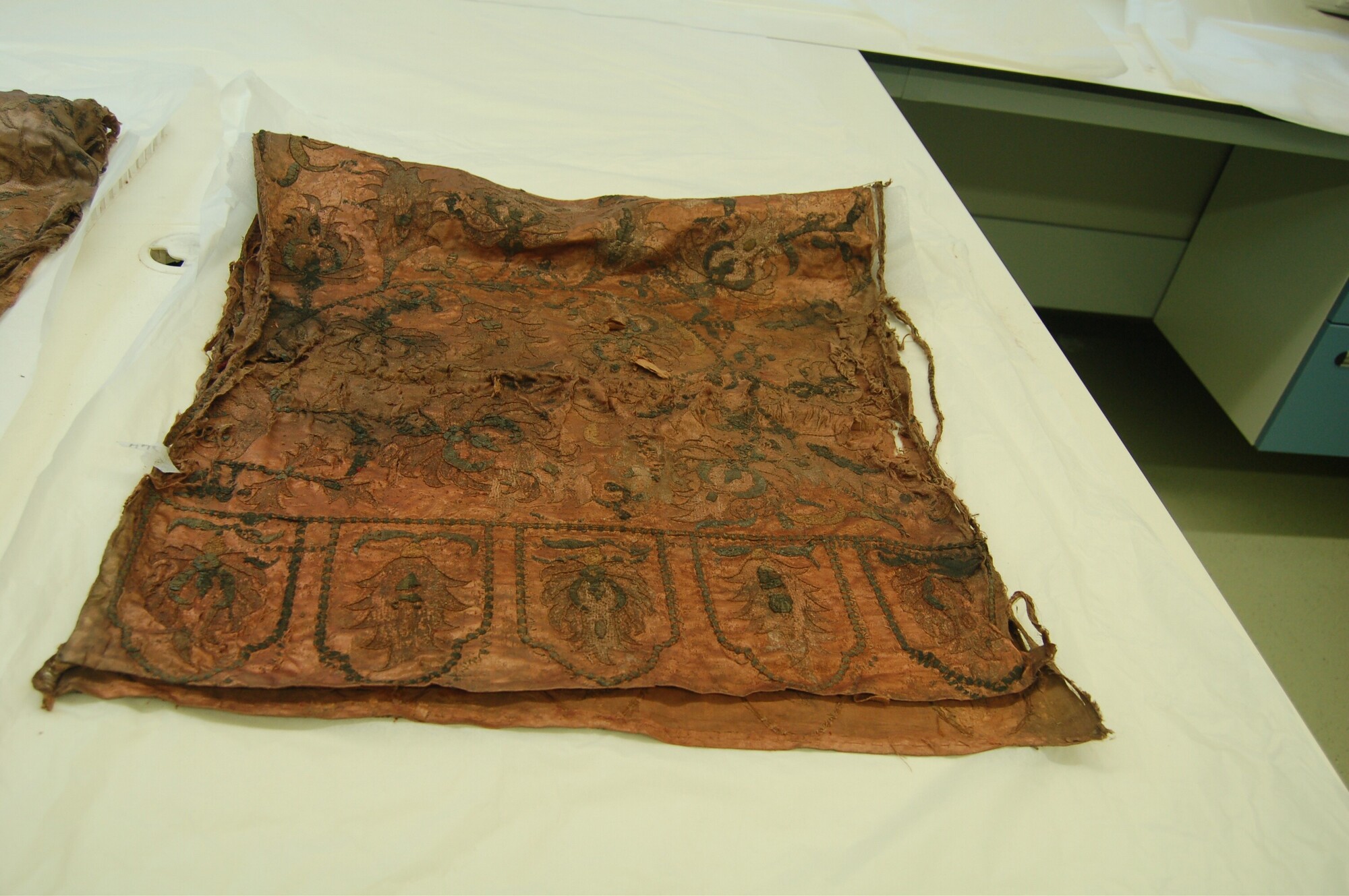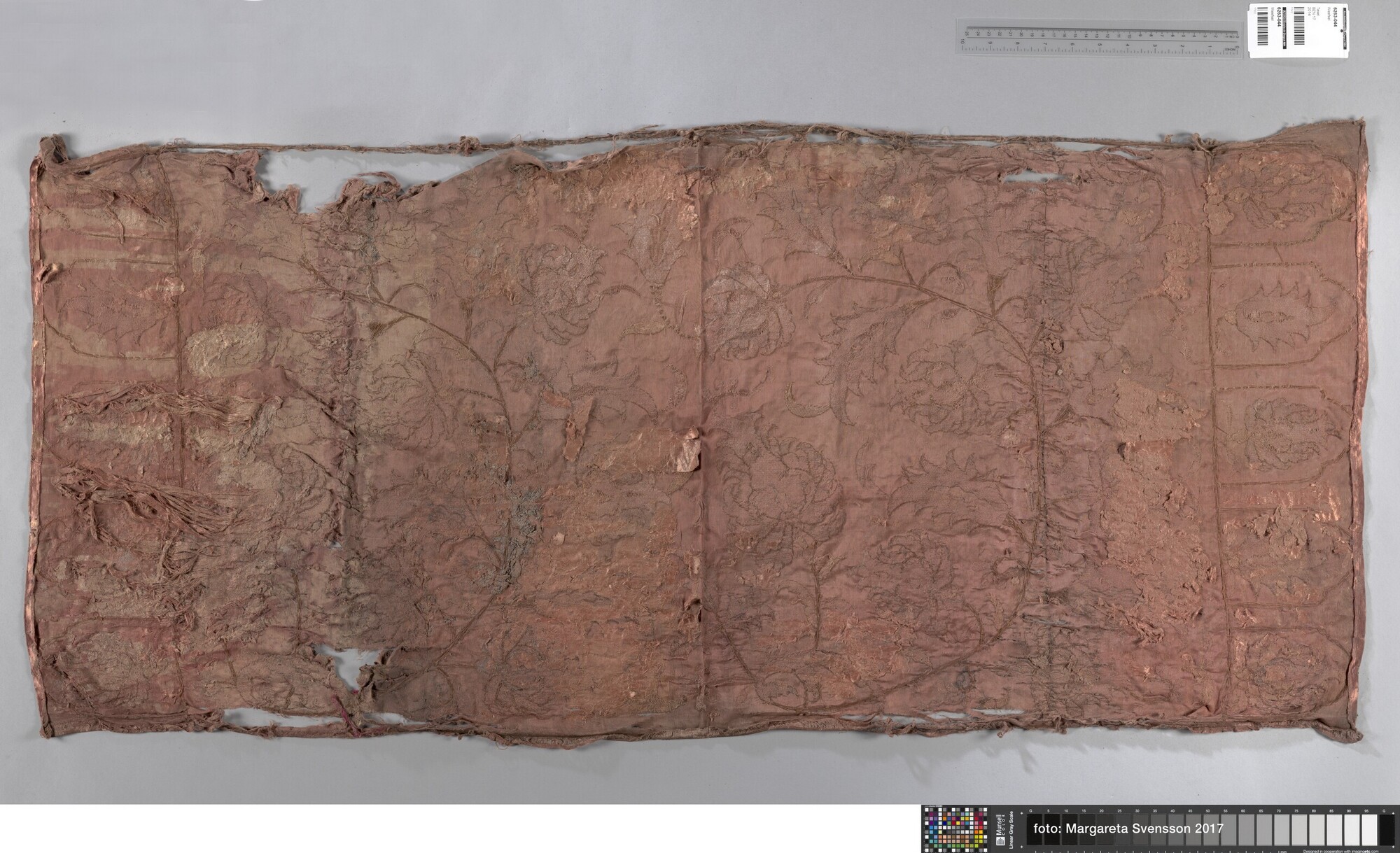 Geborduurde lap; rechthoekig; zijden satijn, geborduurd met garen en verguld zilverdraad; Ottomaans