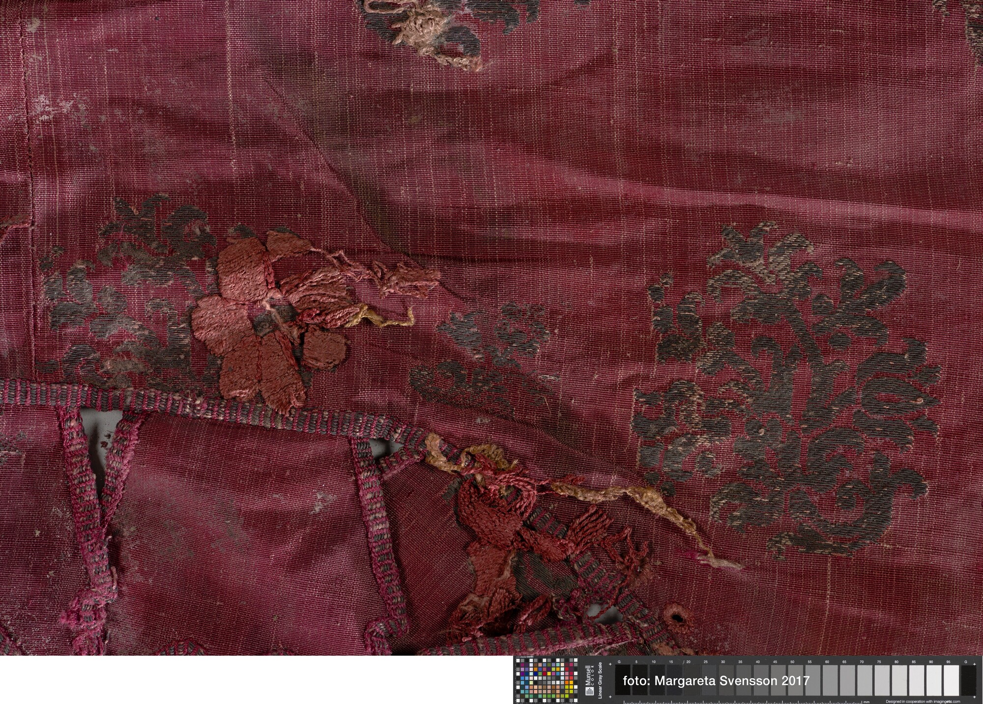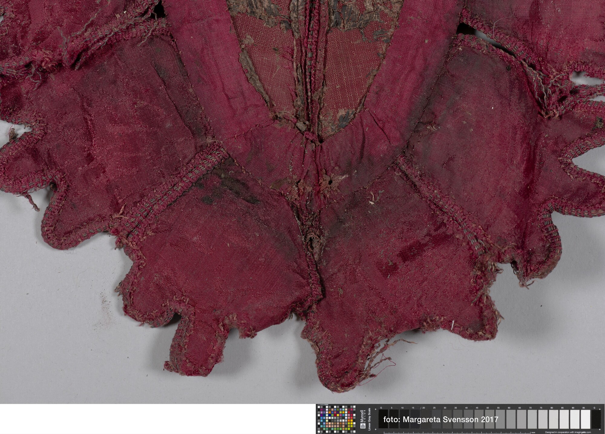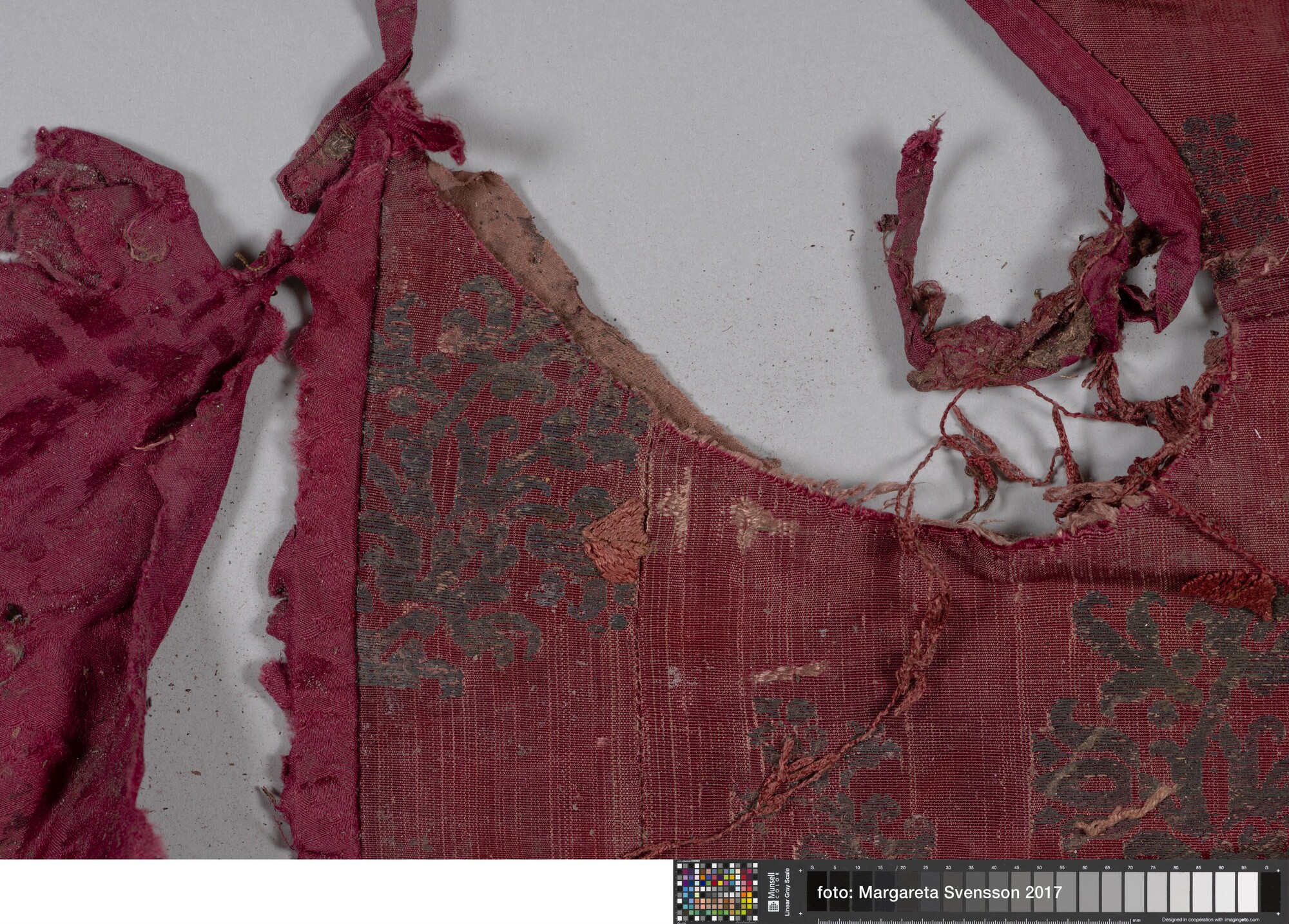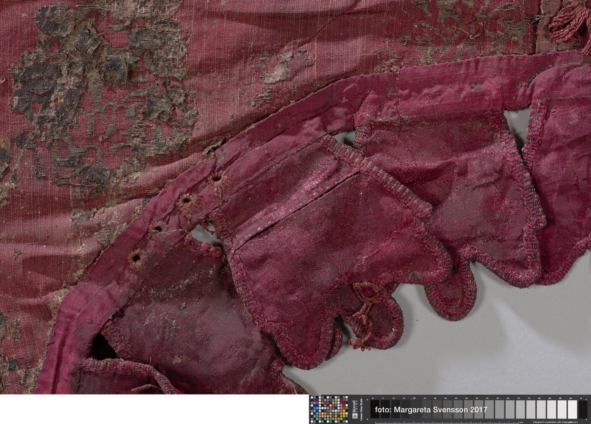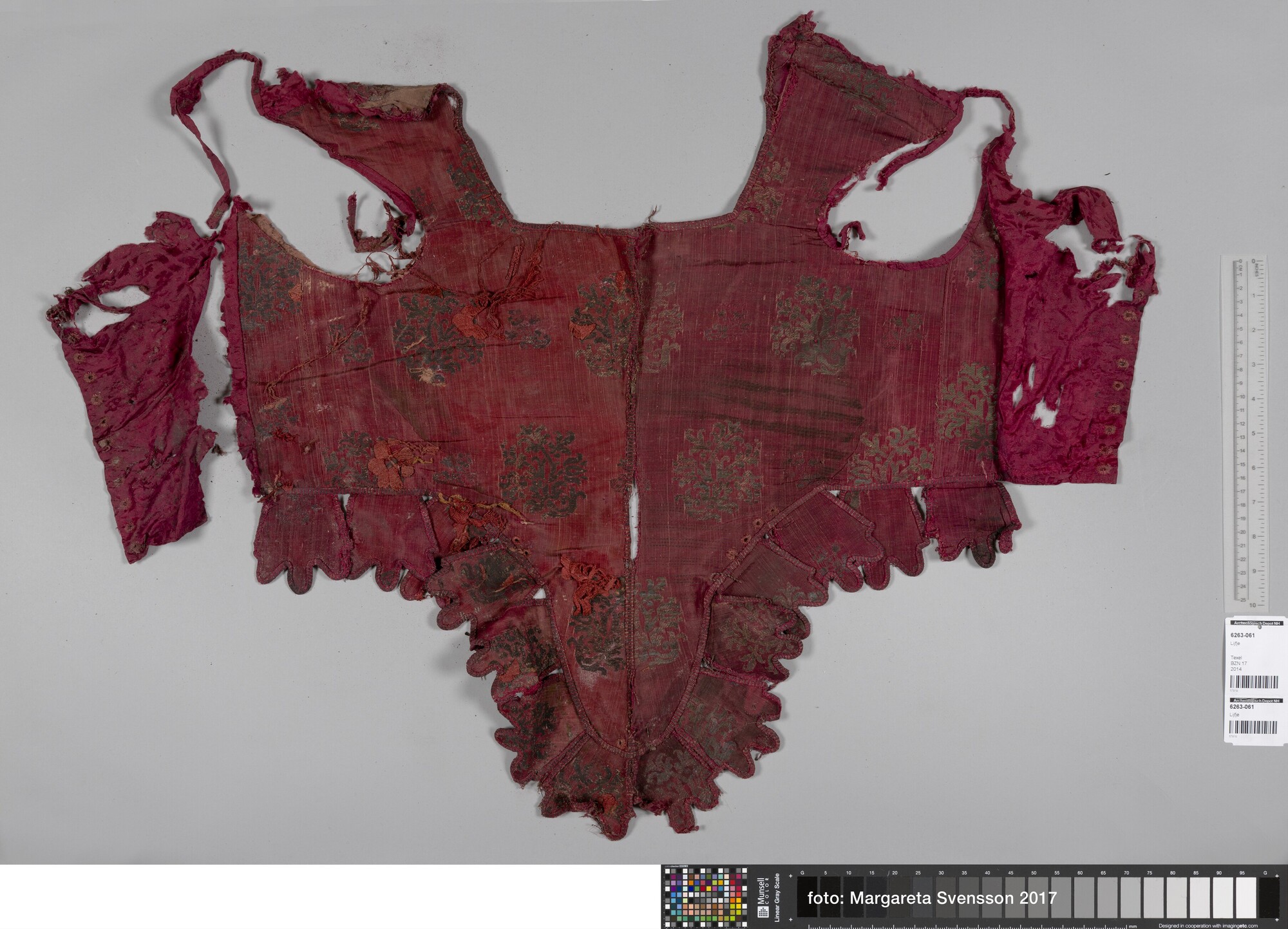 Lijfje van rood brokaat en damast geweven zijde; het lijfje is opgebouwd uit verschillende patroondelen: 2 grote voorpanden, 2 smalle zijpanden, 14 ‘flappen’ ter versiering aan de onderzijde van voor- en zijpanden, alle bestaande uit rood brokaat; 2 rugpanden van donkerrode damast. In de rugpanden vermoedelijk tenminste 13 vetergaten in beide panden, aan de onderzijde ...