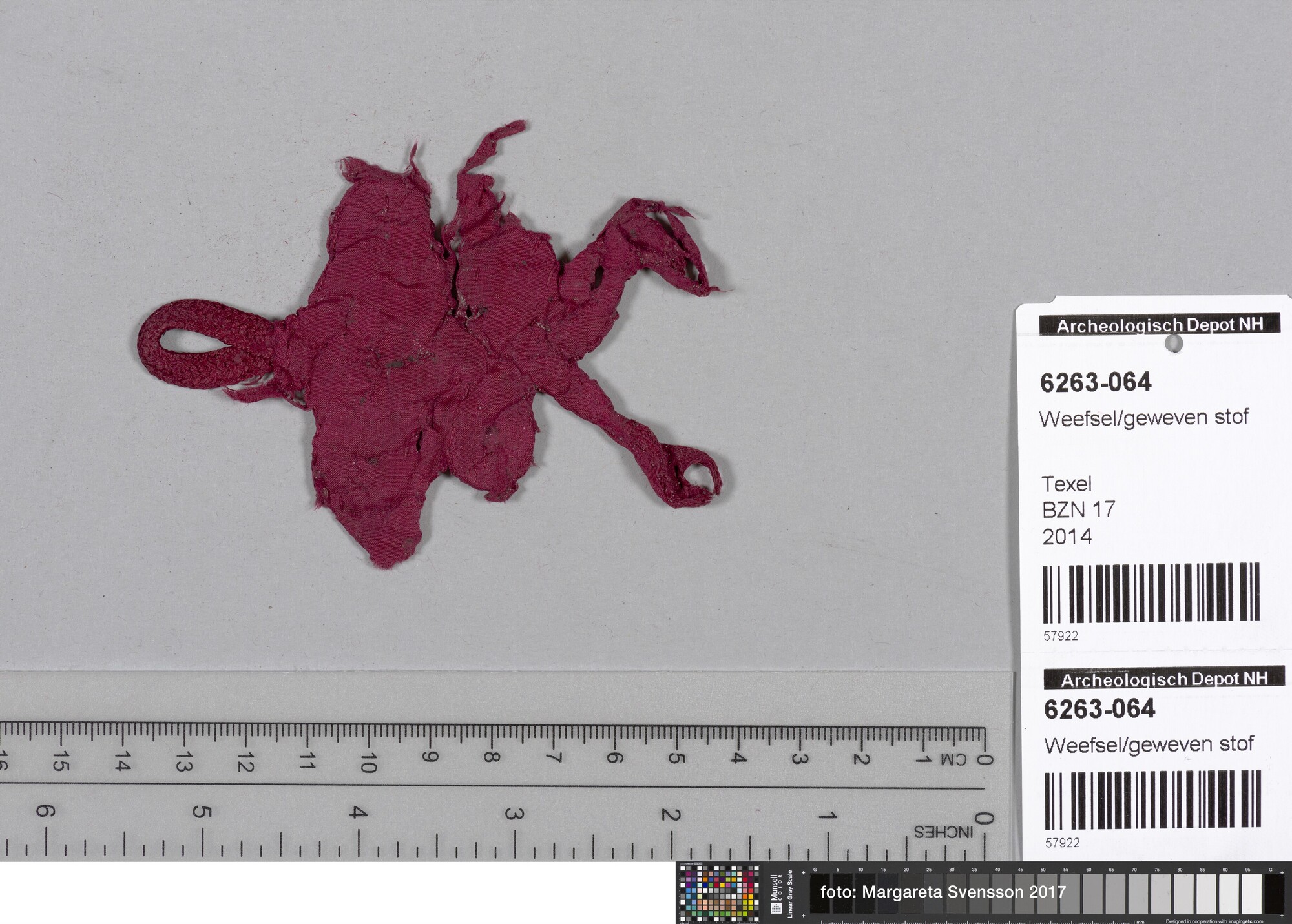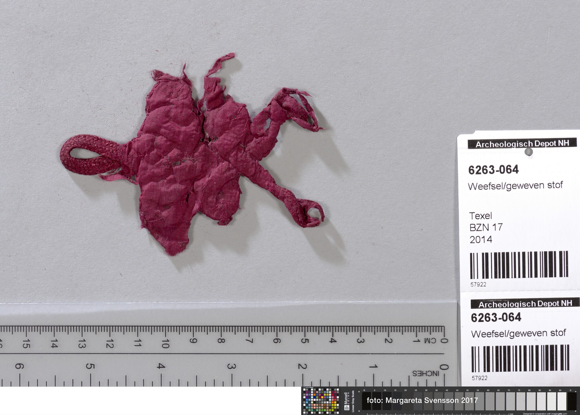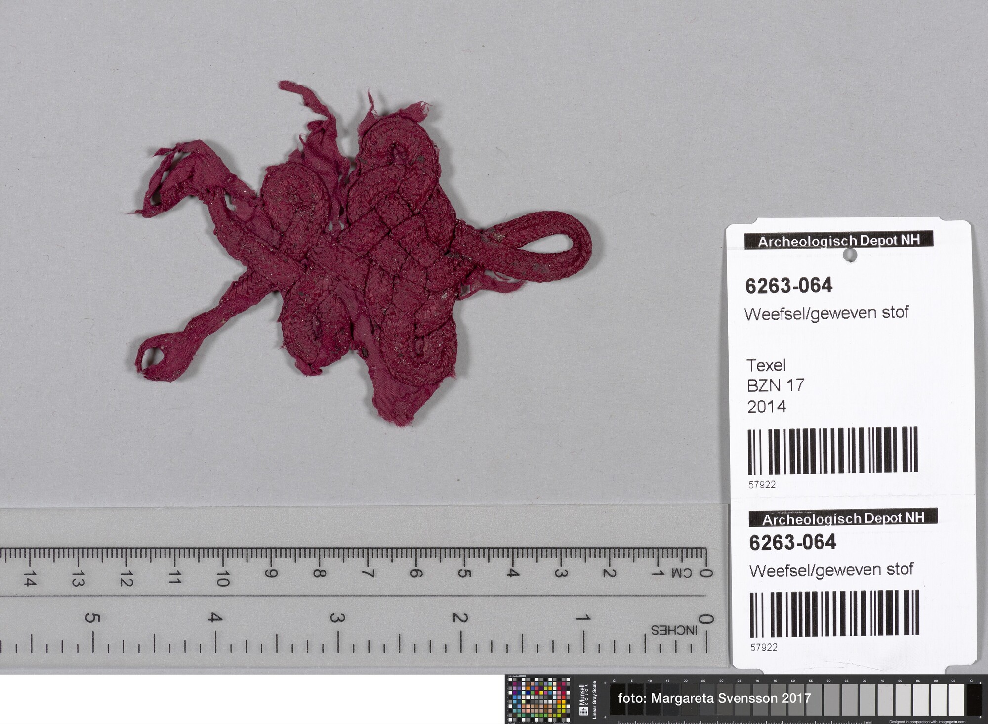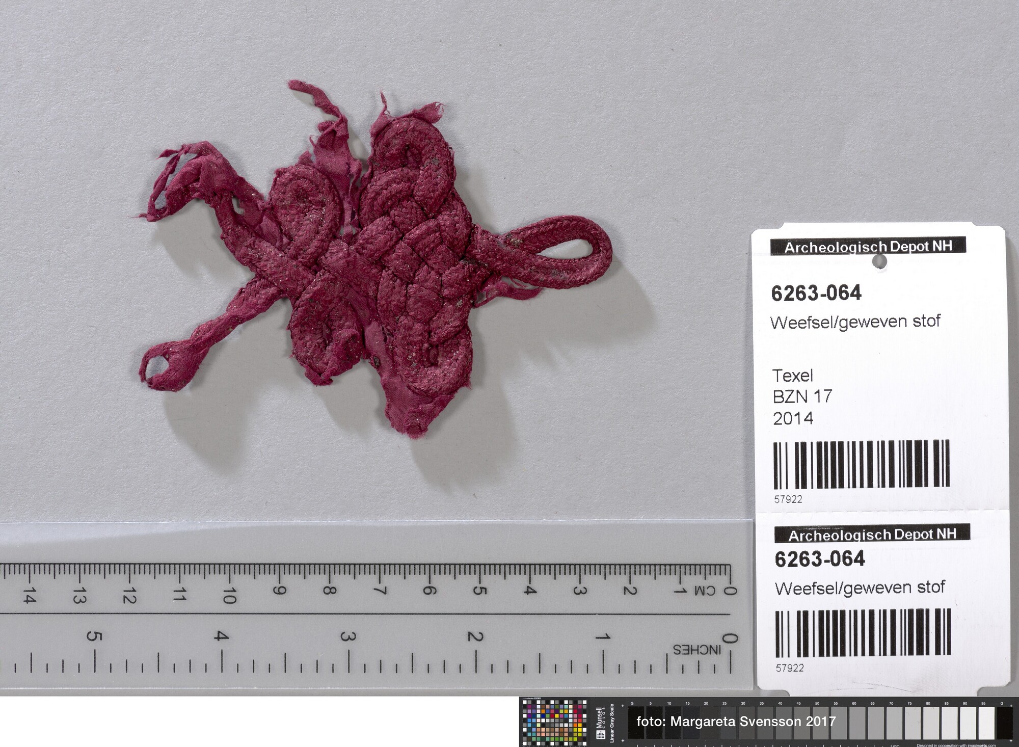 Fragment; deel van sluiting van gevlochten band (lus); op basisweefsel van zijde; in platbinding
