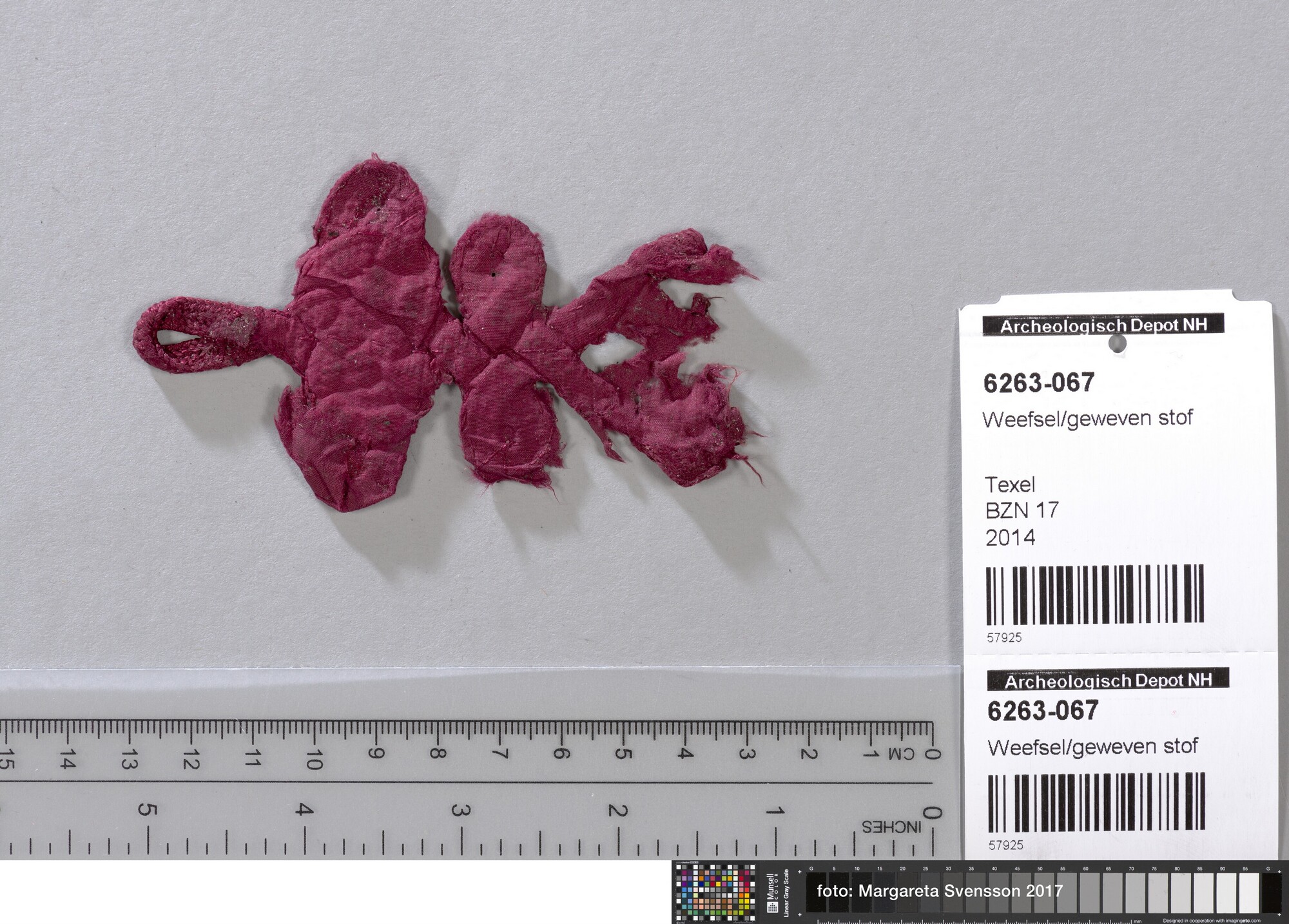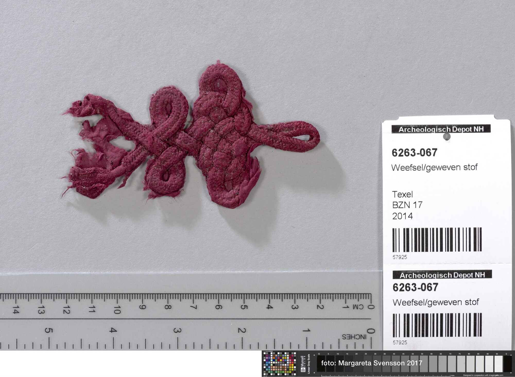 Fragment; deel van sluiting van gevlochten band (lus); op basisweefsel van zijde; in platbinding