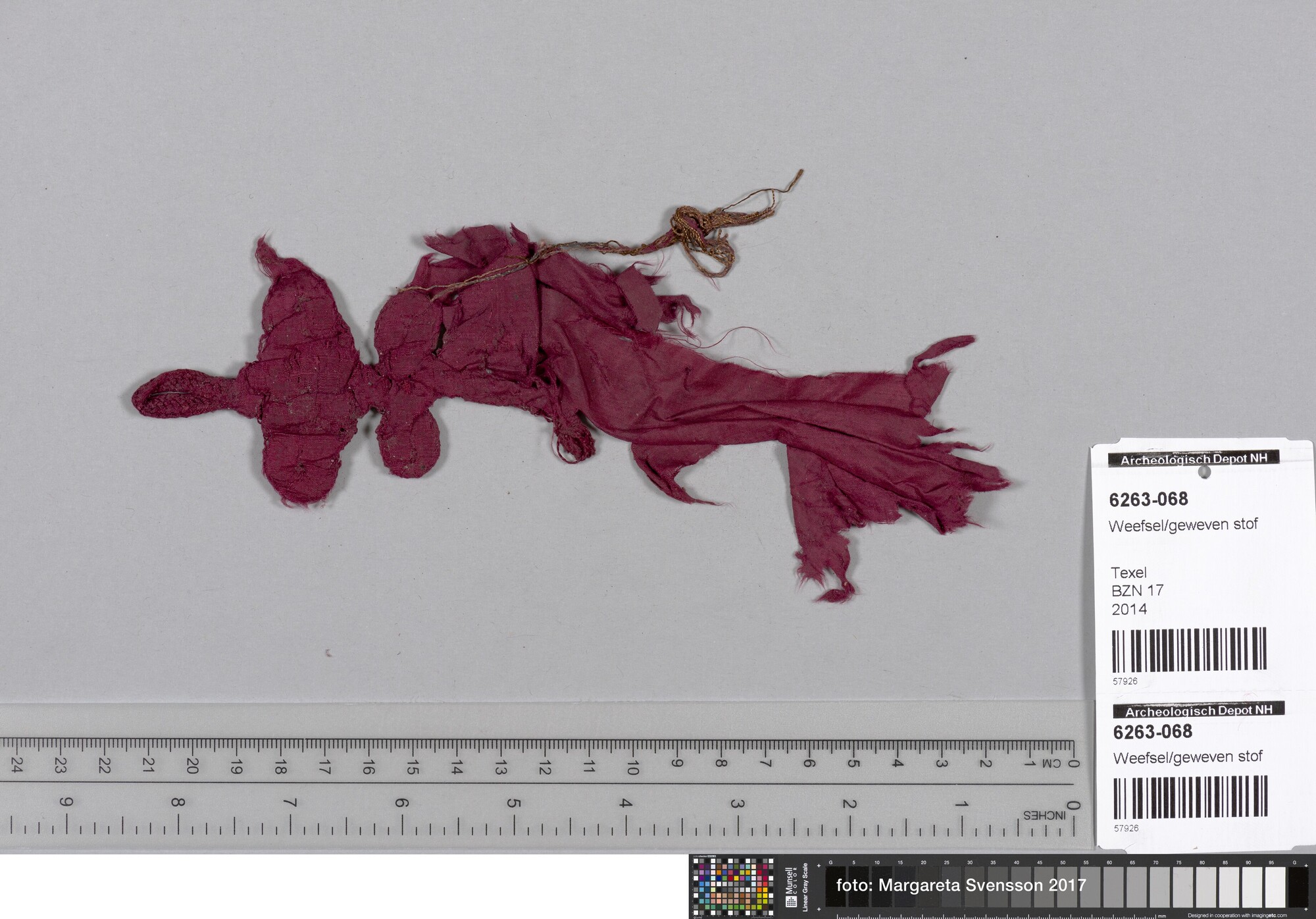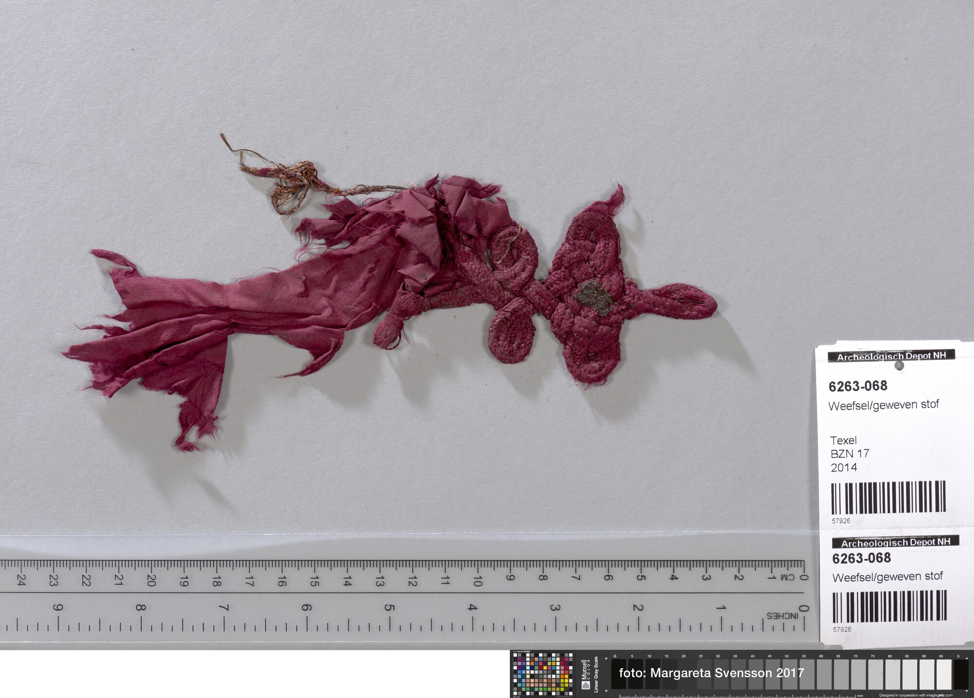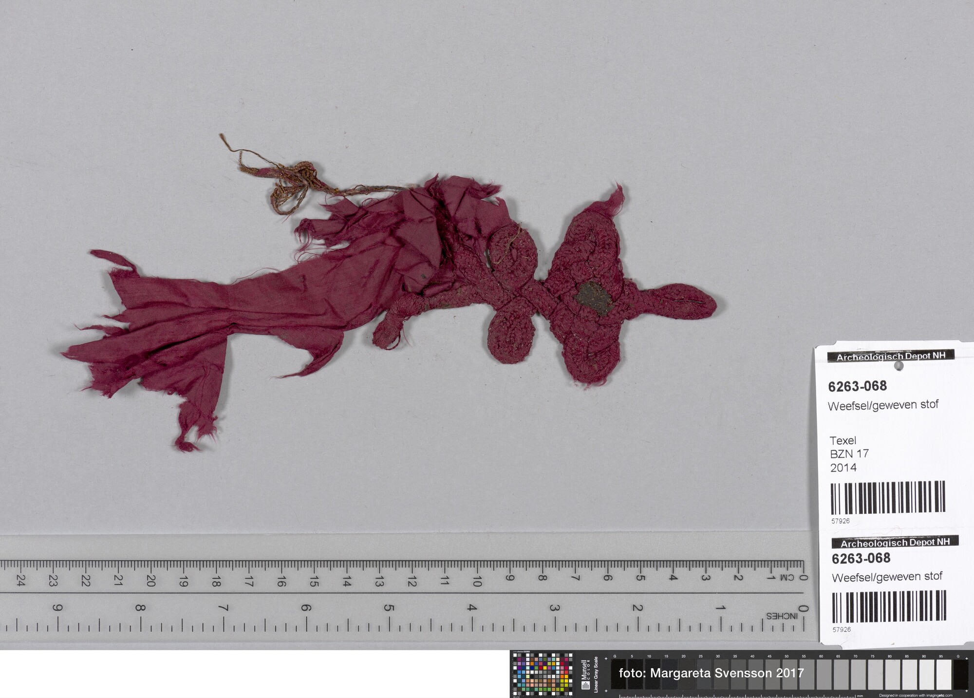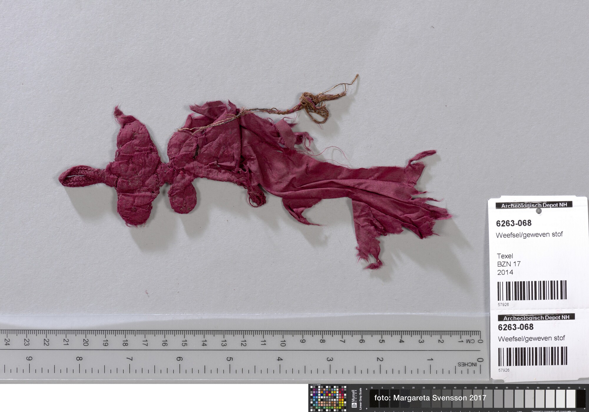 Fragment; deel van sluiting van gevlochten band (lus); op basisweefsel van zijde; in platbinding