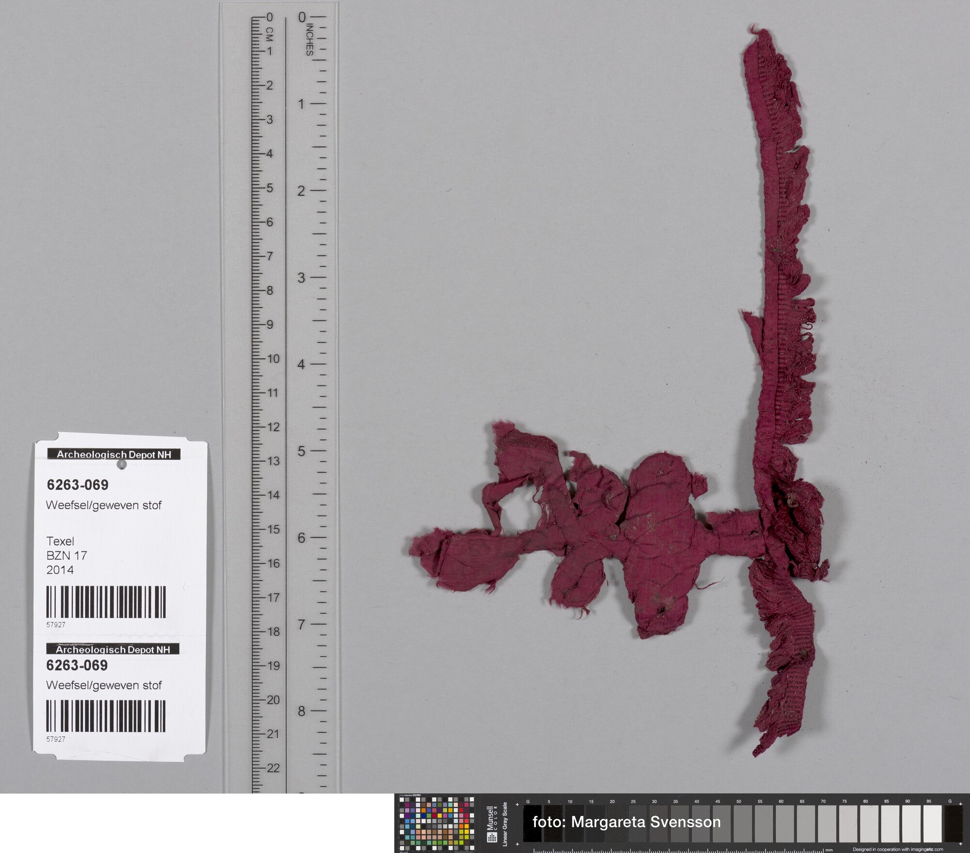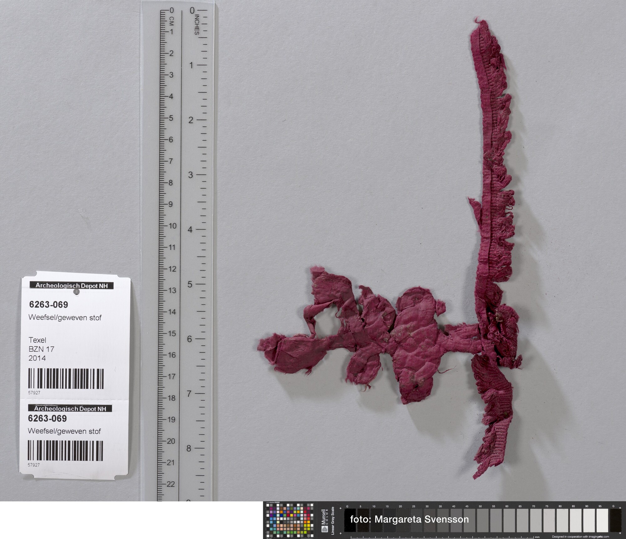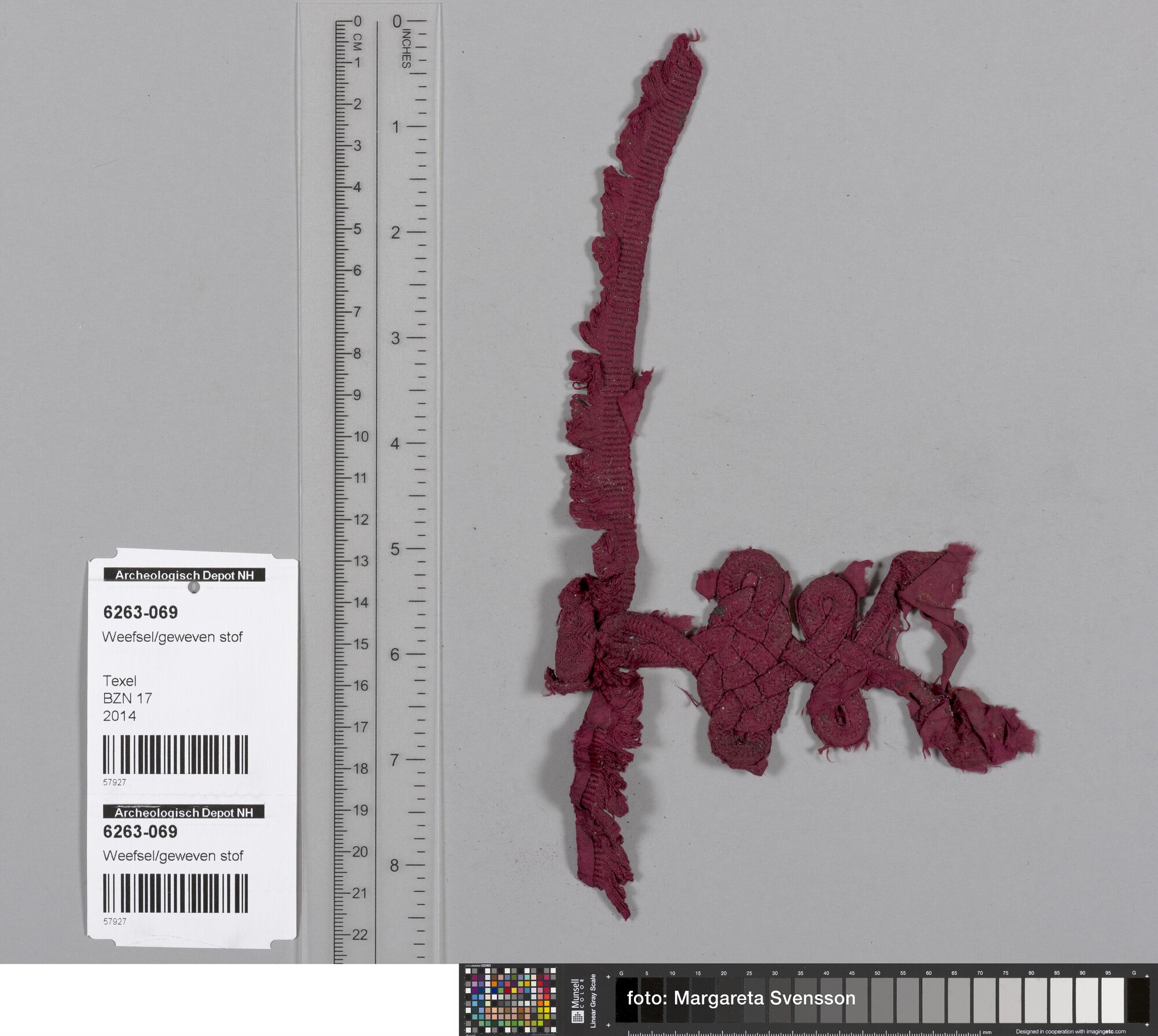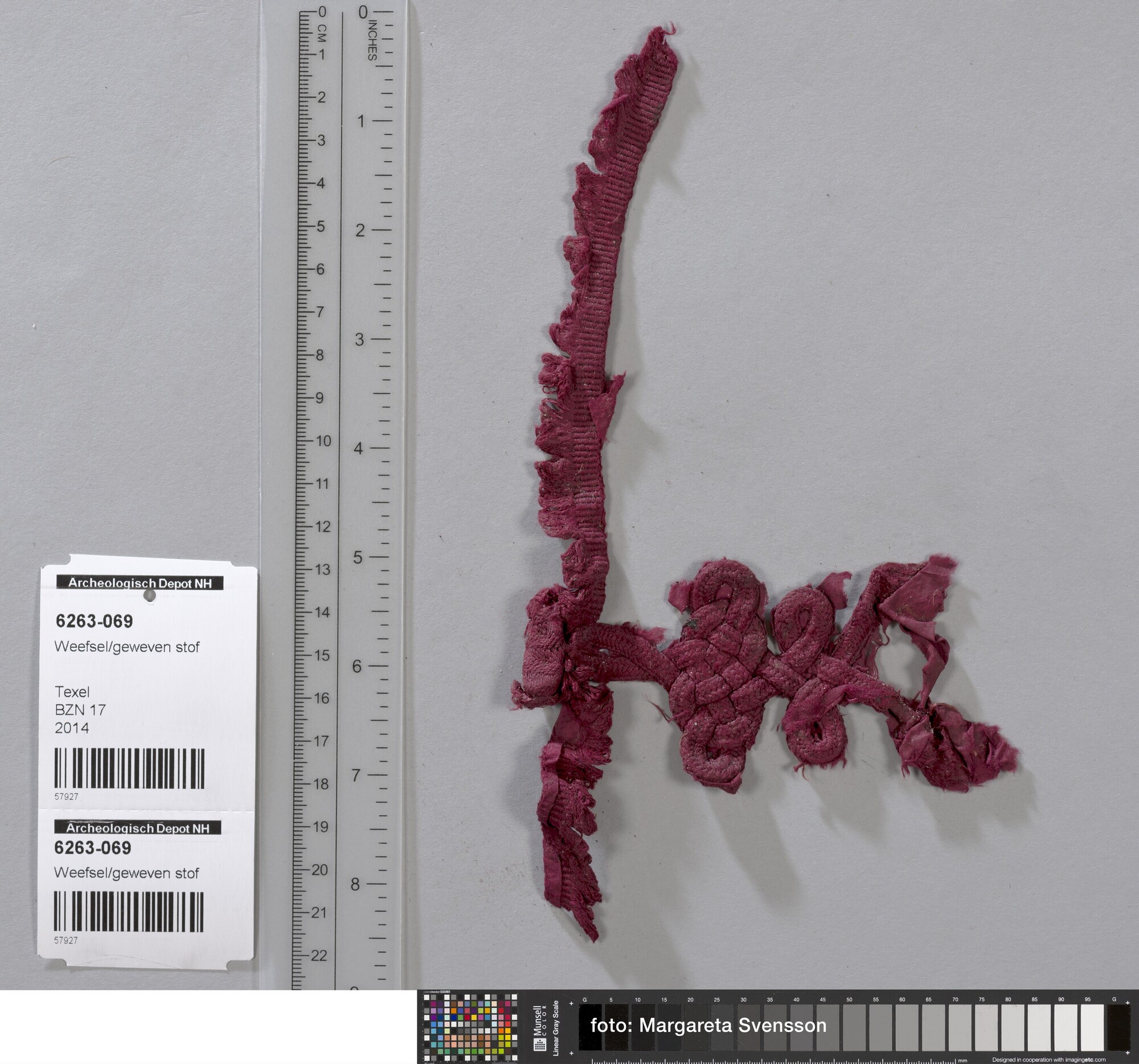 Fragment; deel van sluiting van gevlochten band (knoop); op basisweefsel van zijde; in platbinding met franjebandje