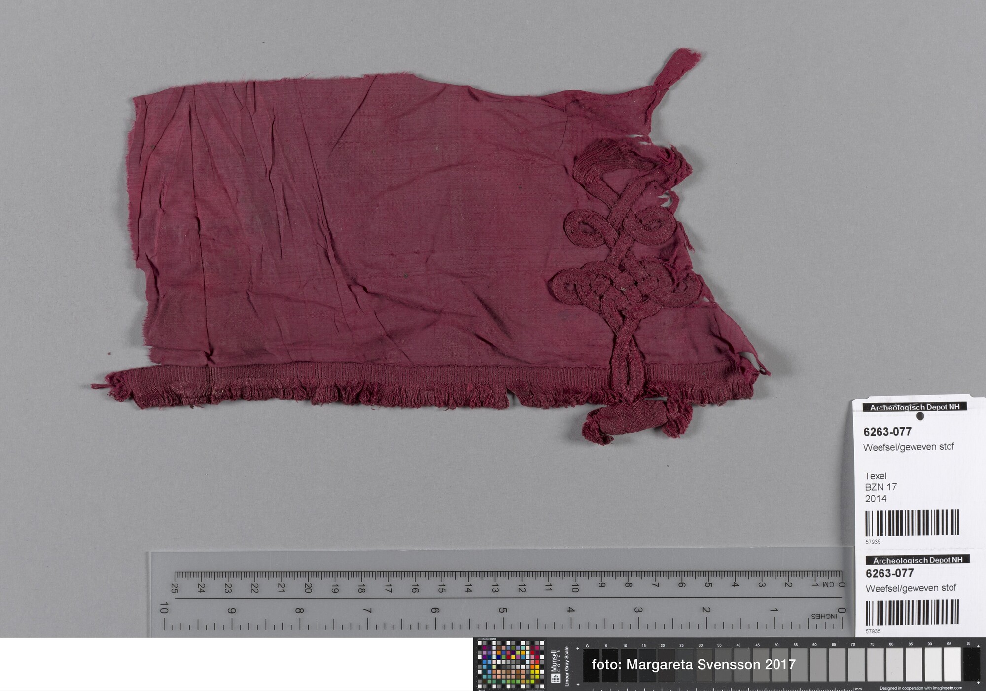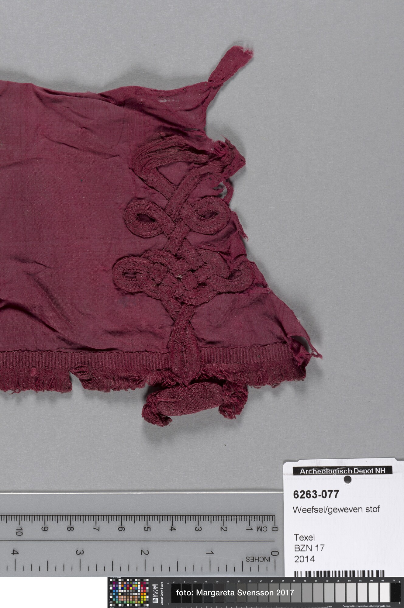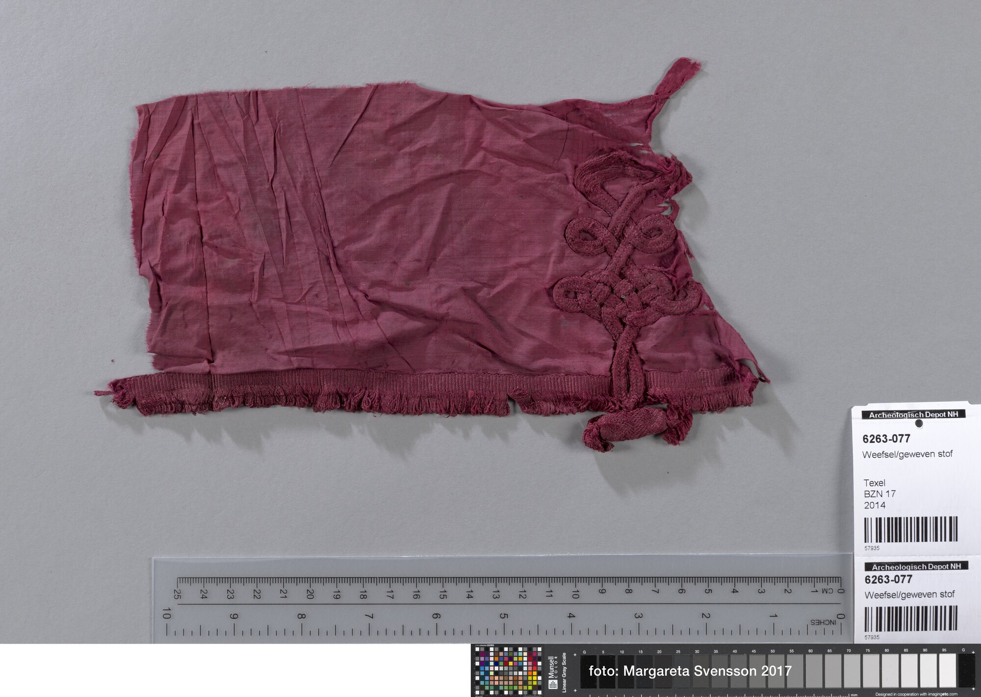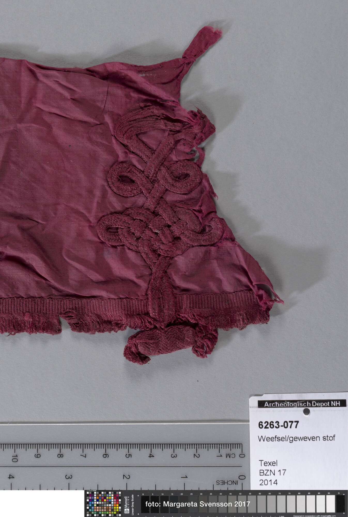 Fragment; weefsel van zijde; in platbinding met deel van sluiting van gevlochten band (knoop); met franjebandje