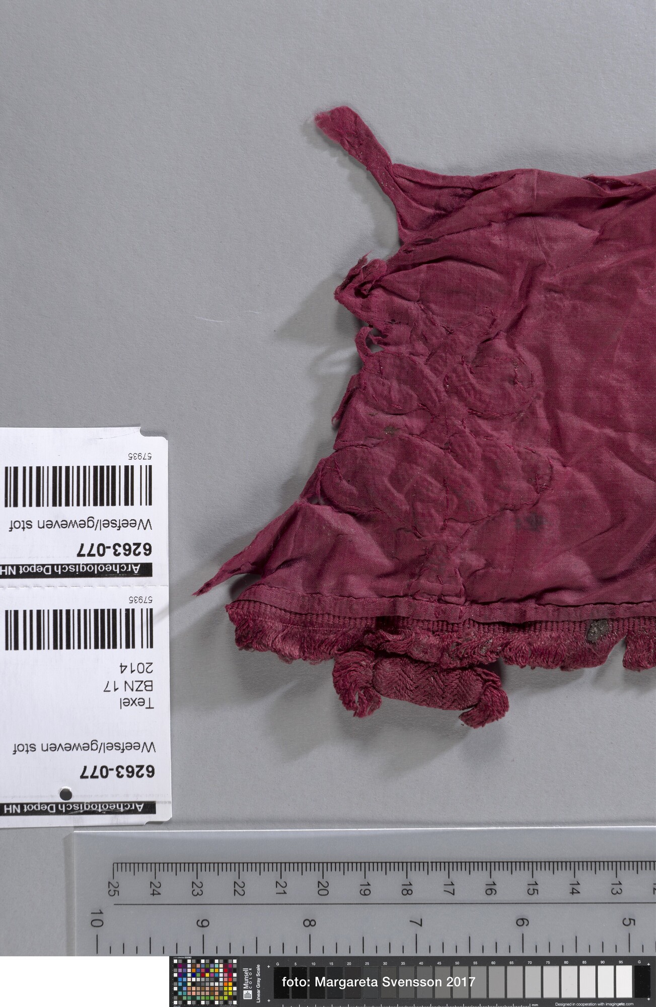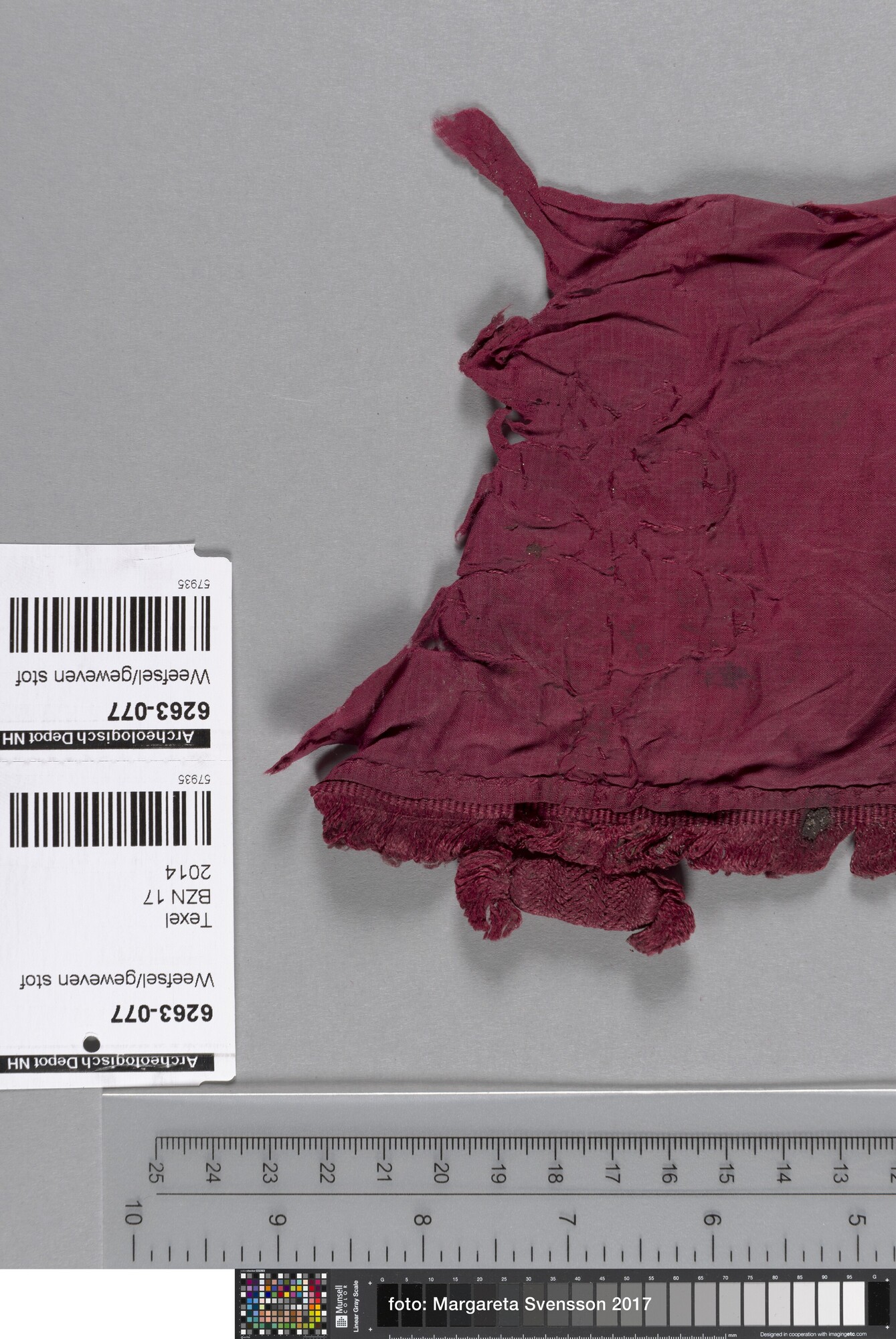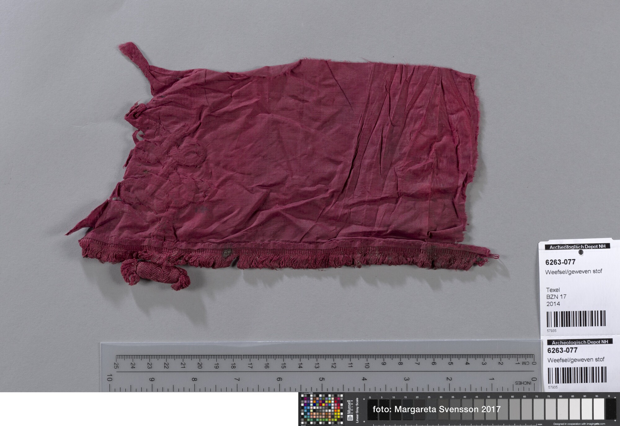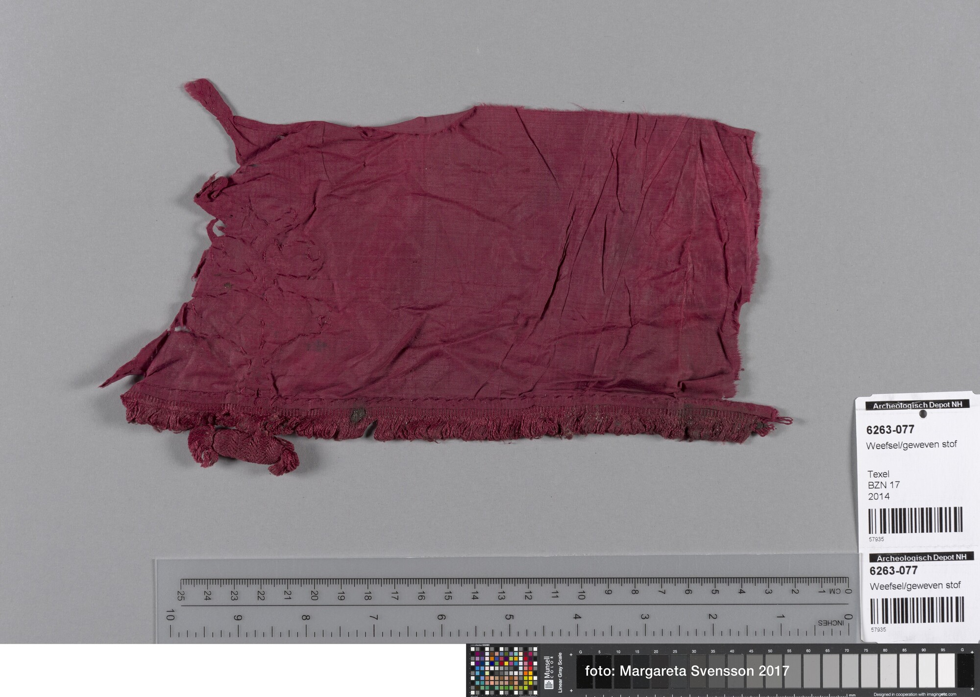 Fragment; weefsel van zijde; in platbinding met deel van sluiting van gevlochten band (knoop); met franjebandje