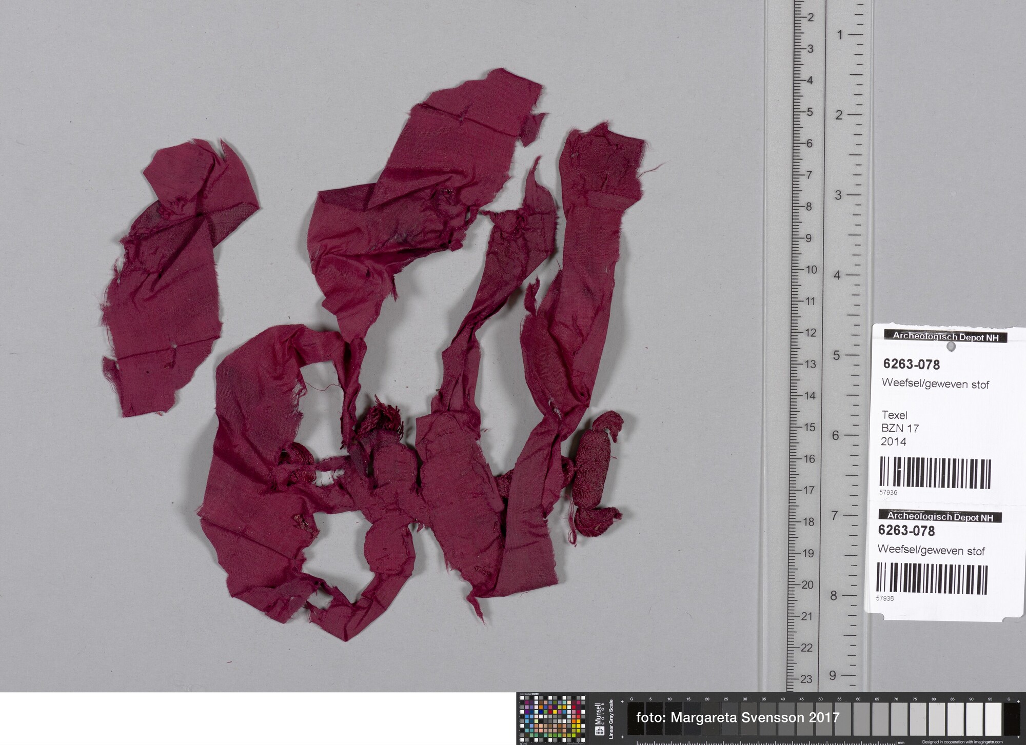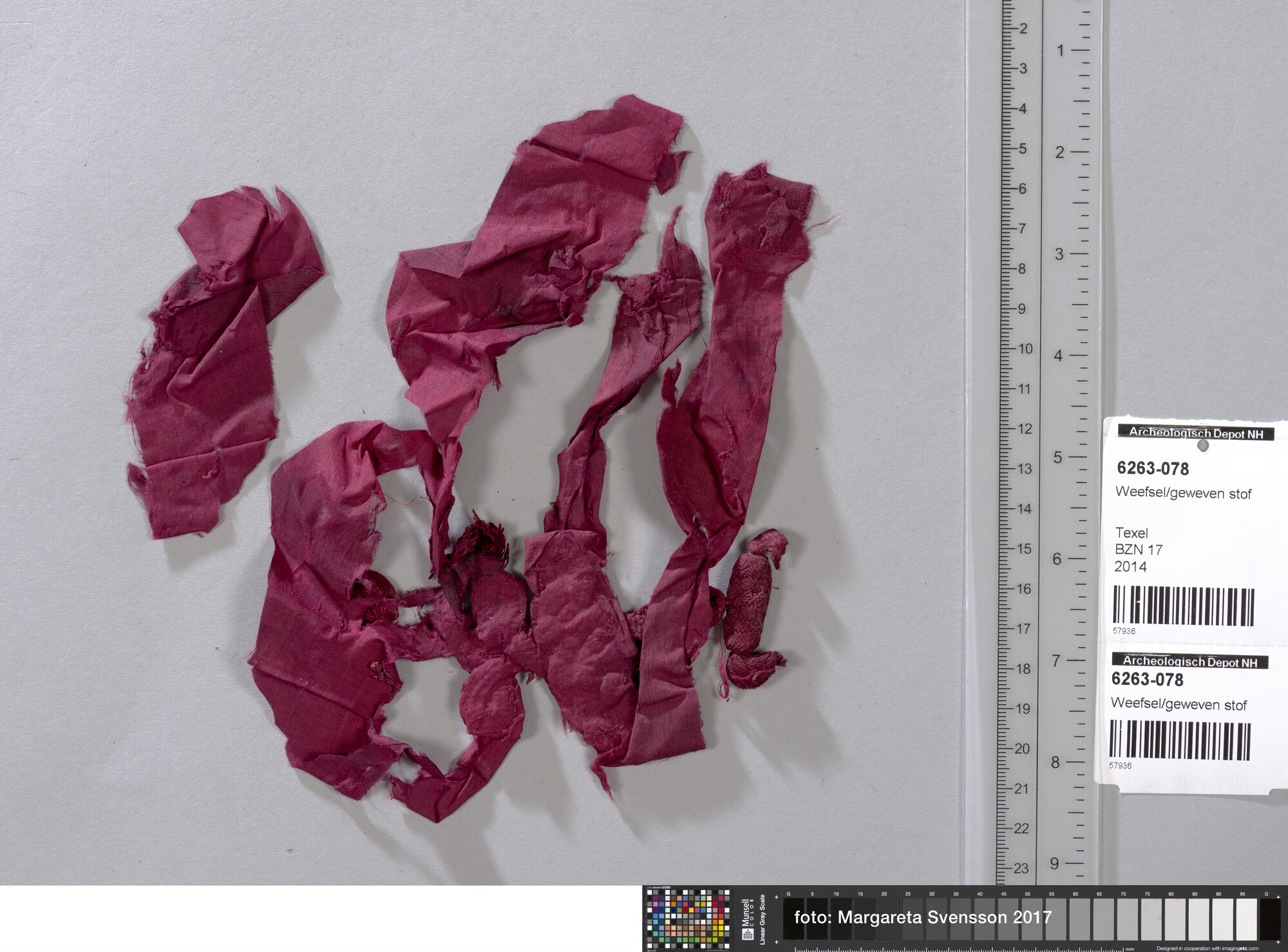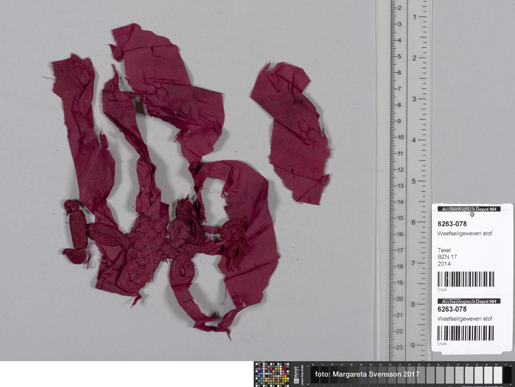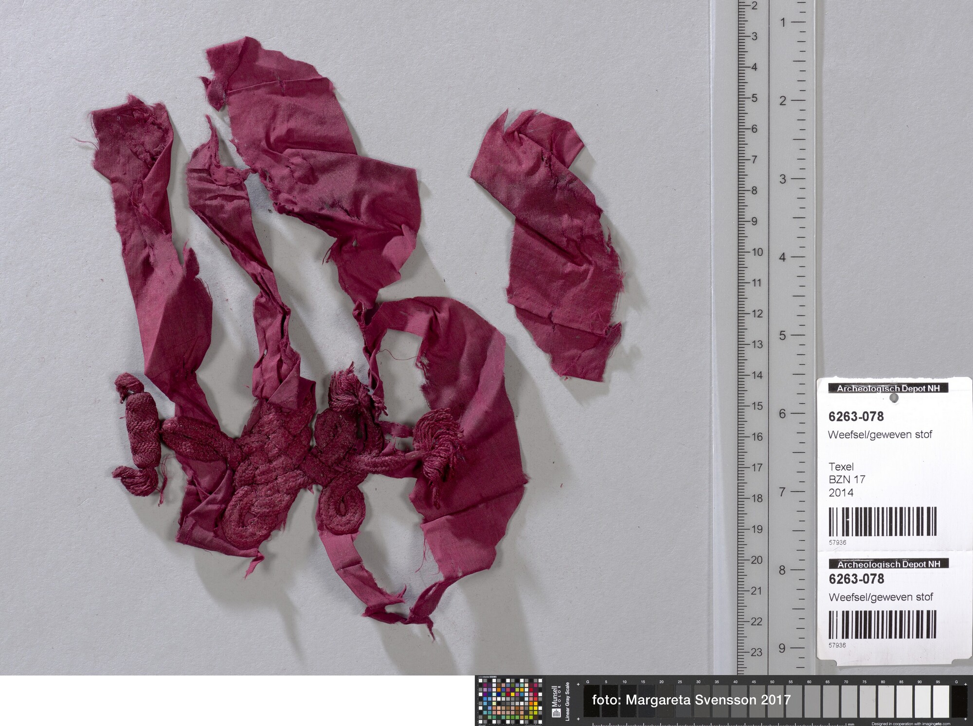 Fragment; weefsel van zijde; in platbinding met deel van sluiting van gevlochten band (knoop)