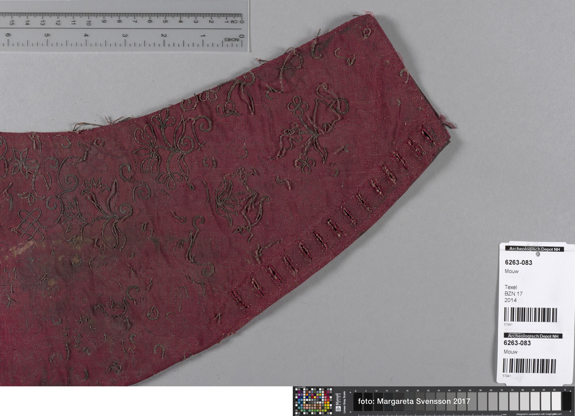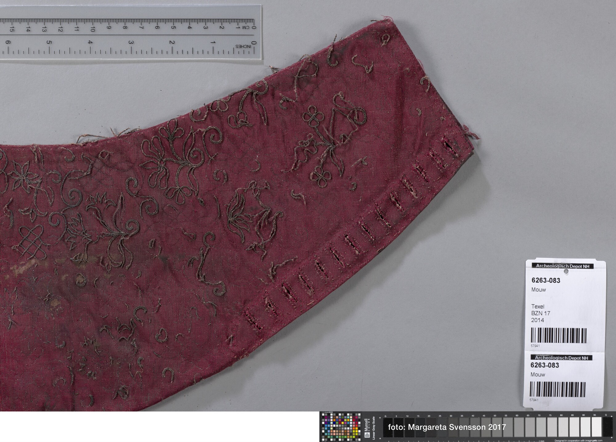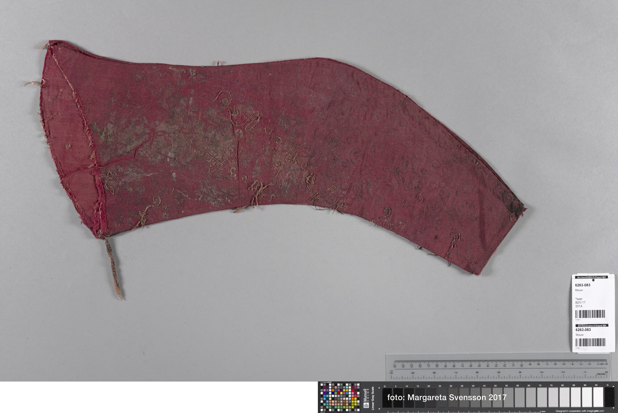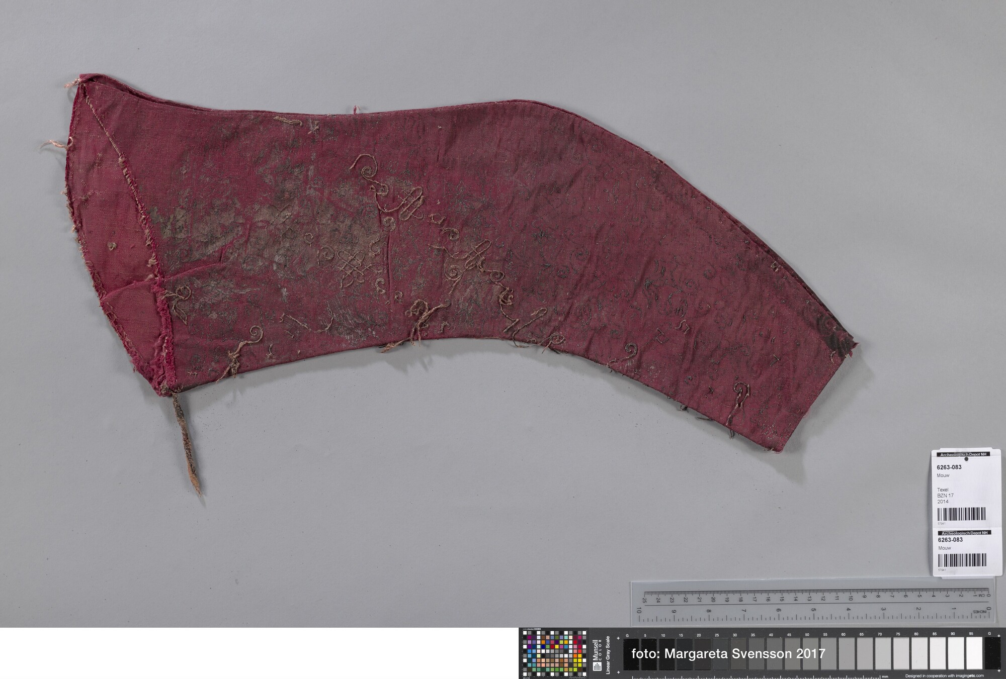 Mouw (R) doorweven met metaaldraad; resten van borduursel van metaaldraad in floraal motief