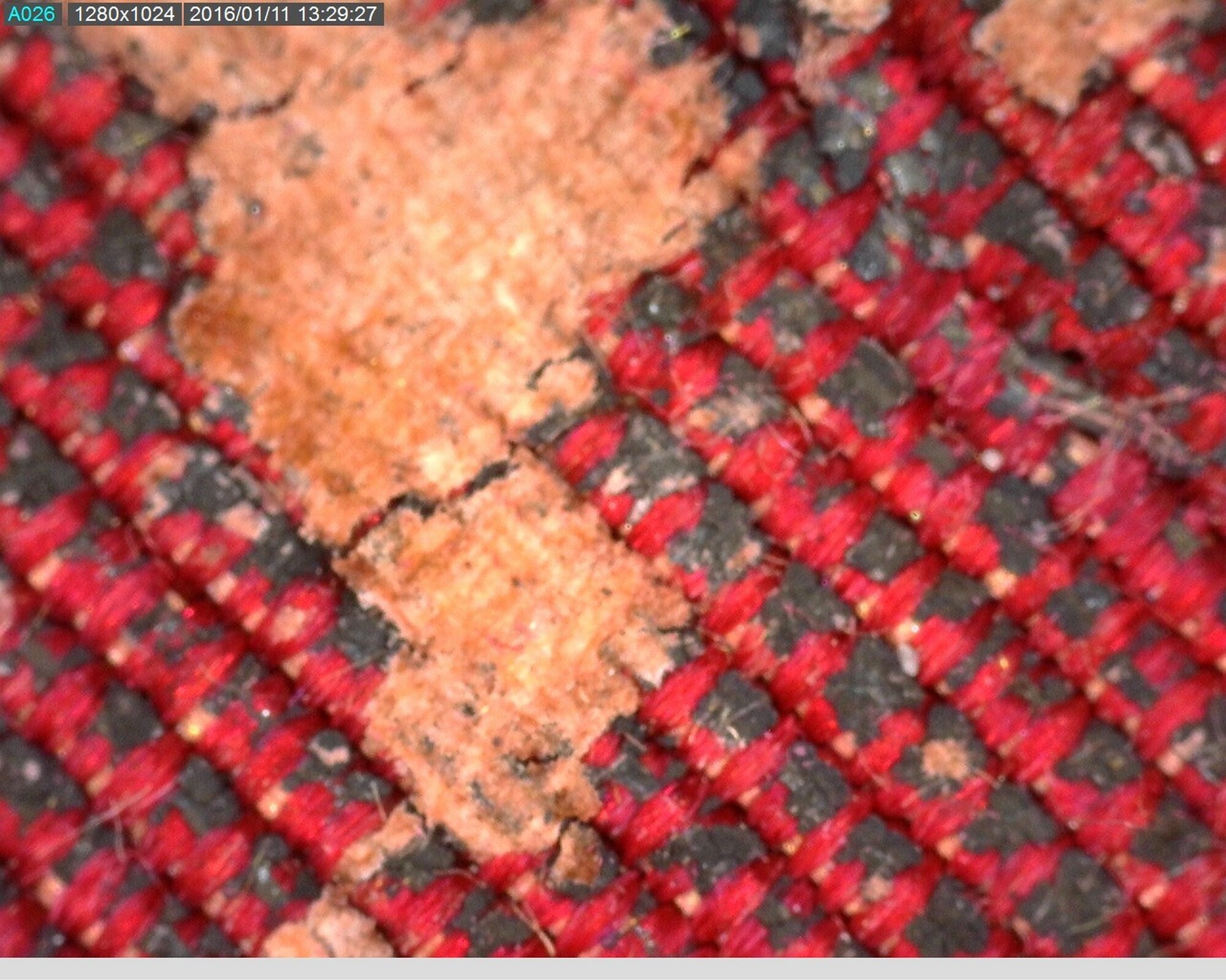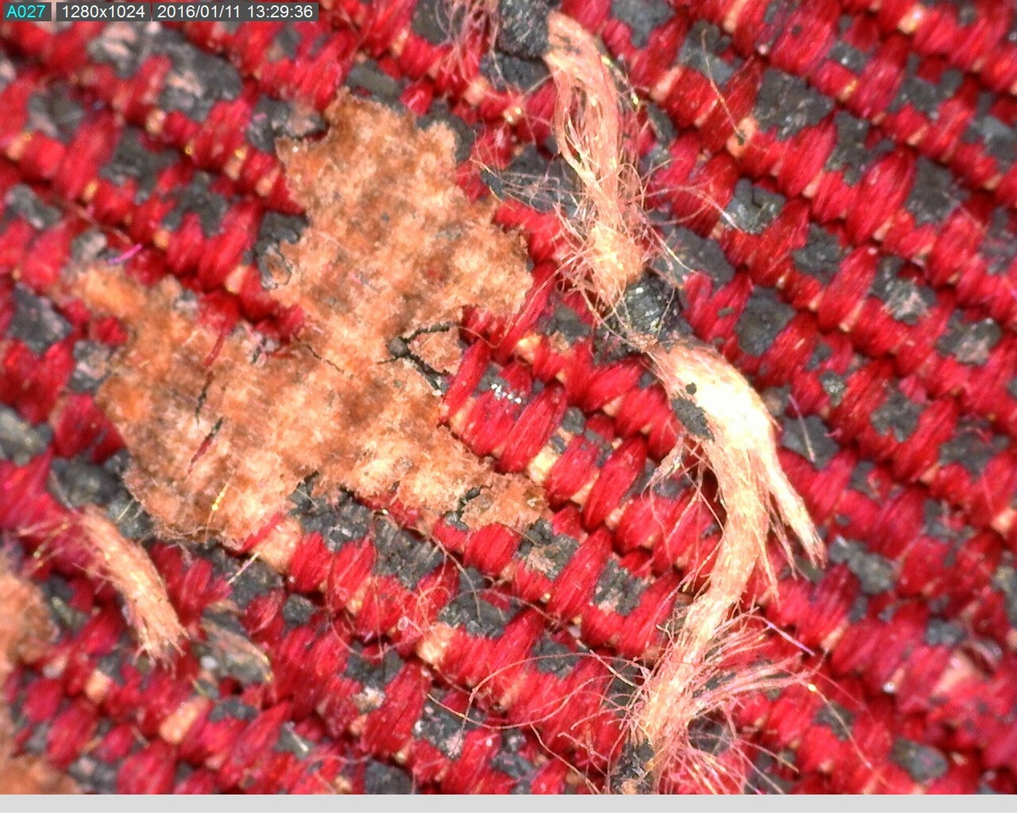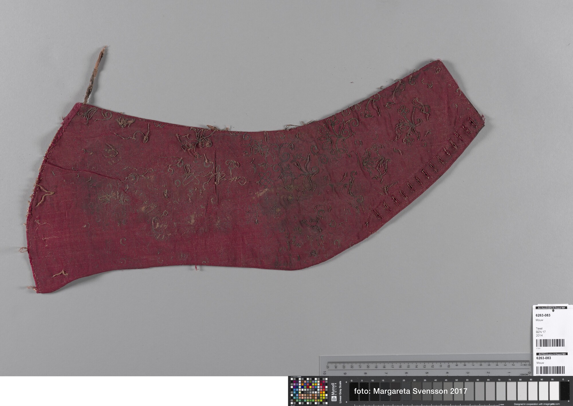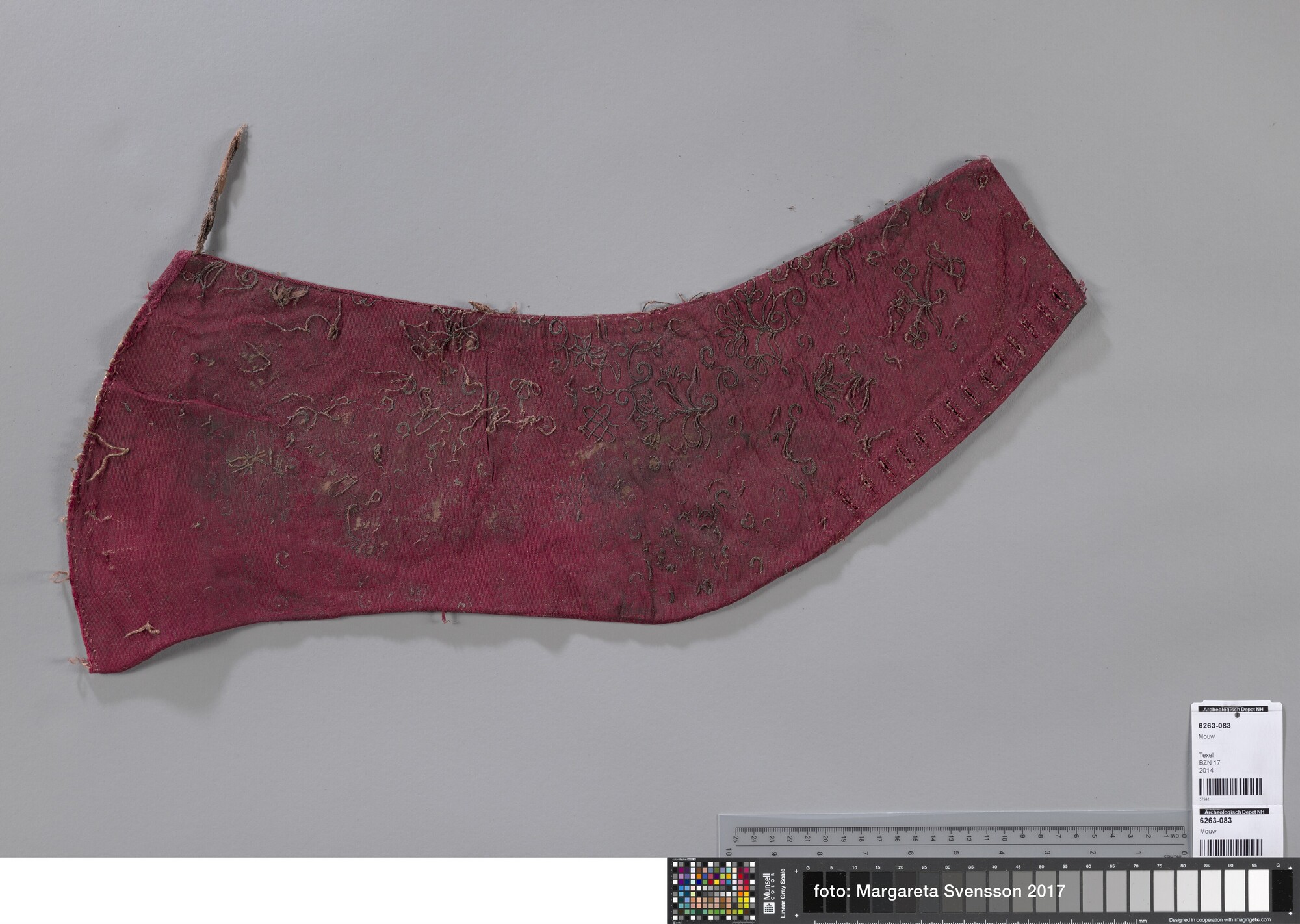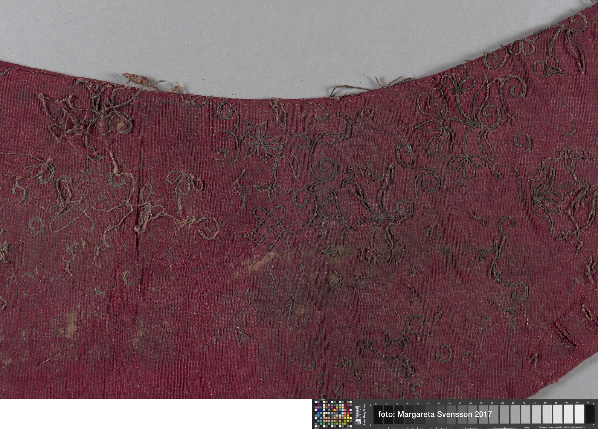 Mouw (R) doorweven met metaaldraad; resten van borduursel van metaaldraad in floraal motief