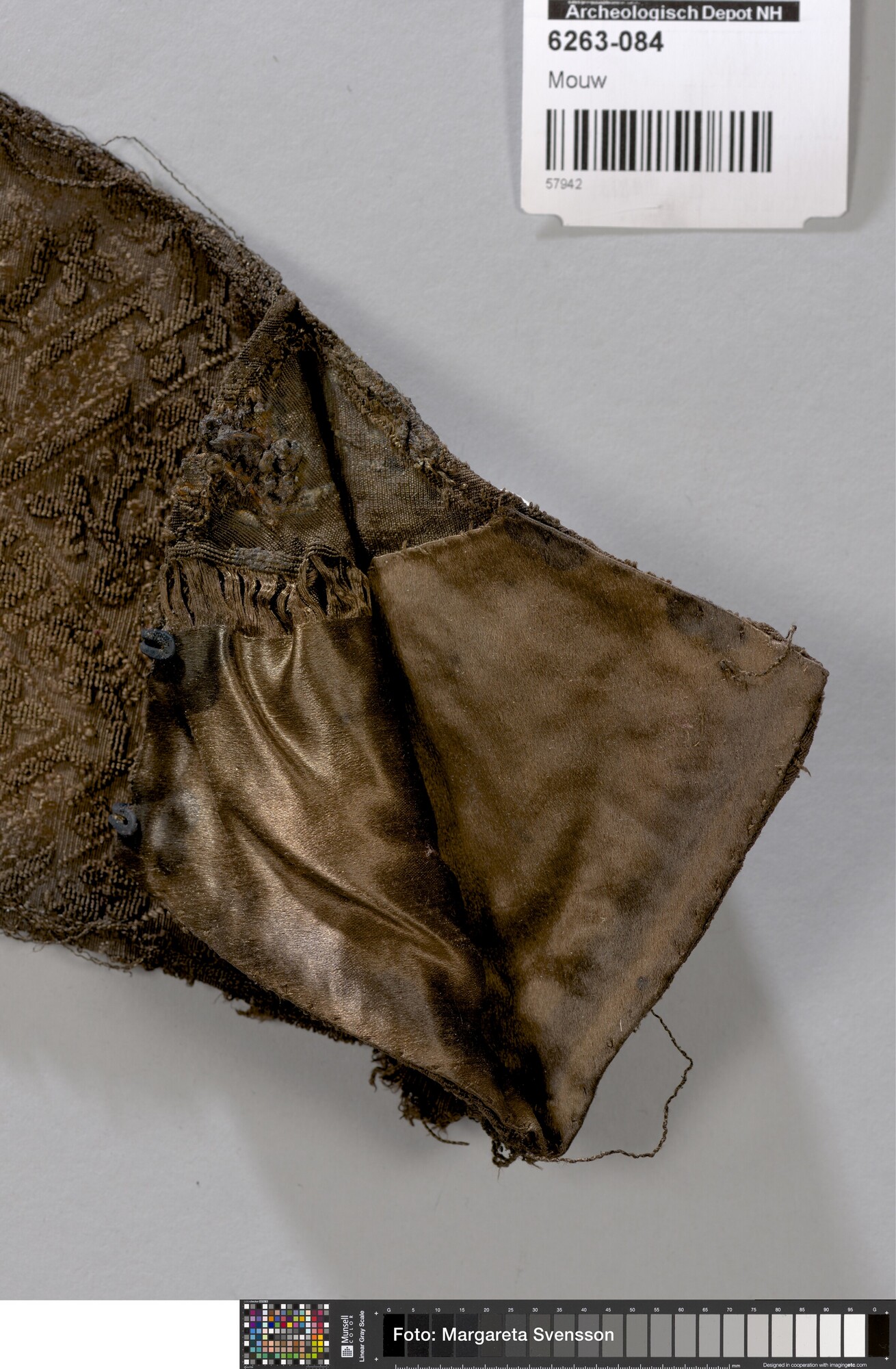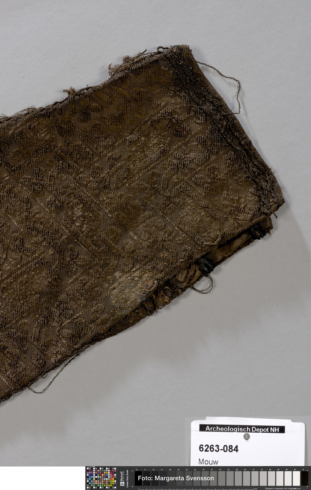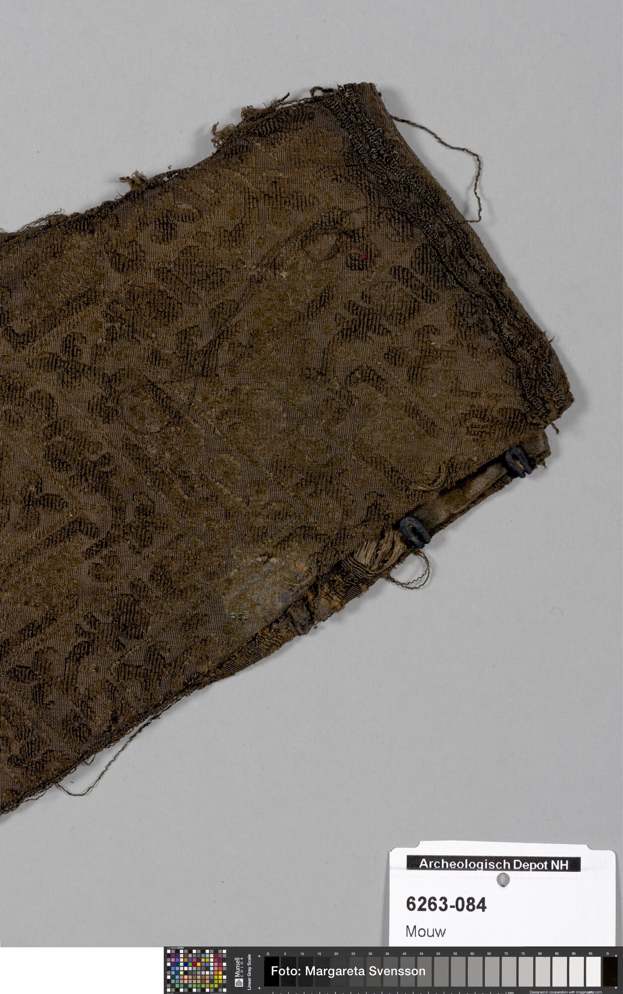 Mouw (L) onderarm; gestileerd floraal motief in zigzagpatroon, lussenpool; ciselé fluweel; haakjes