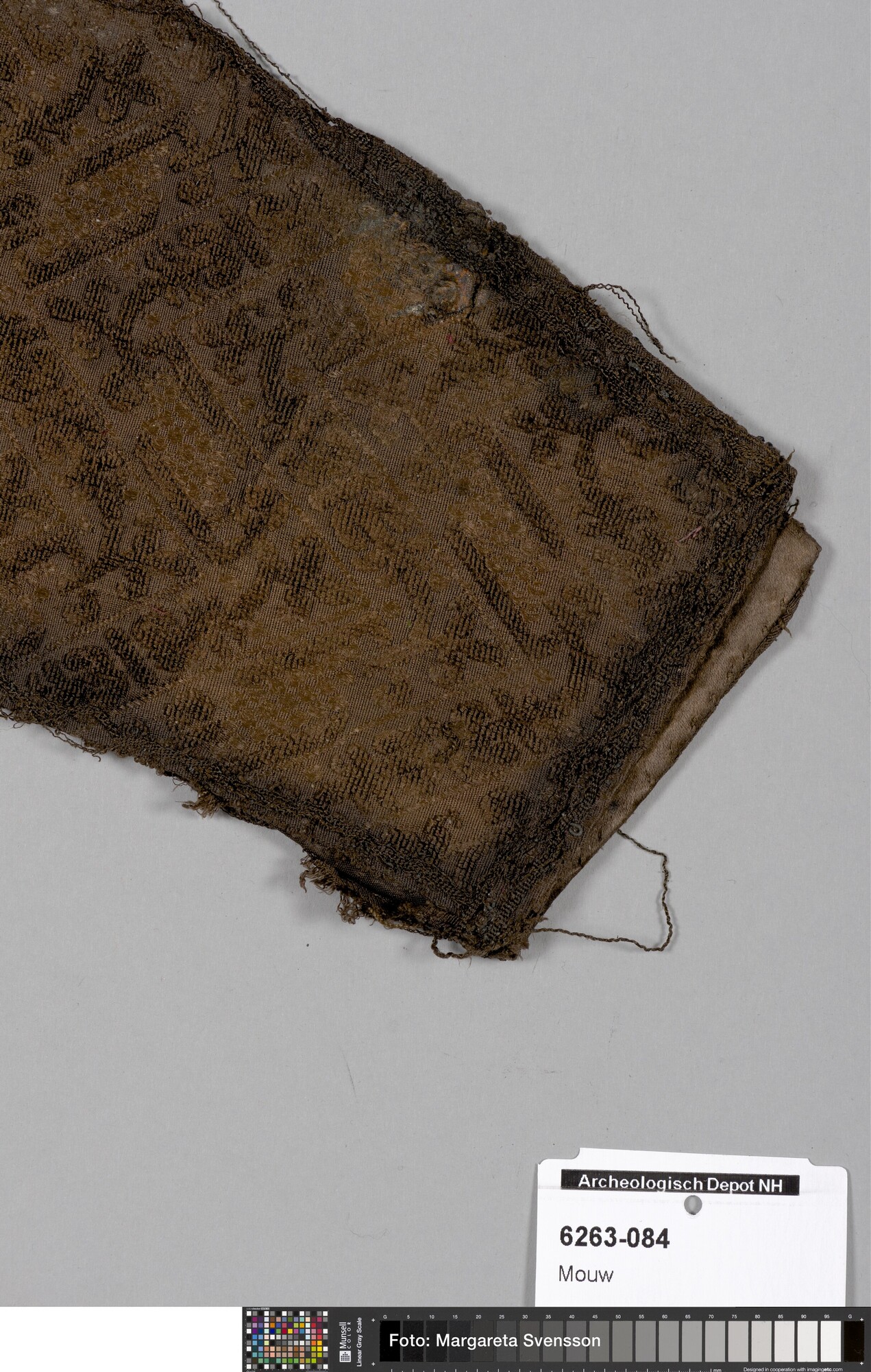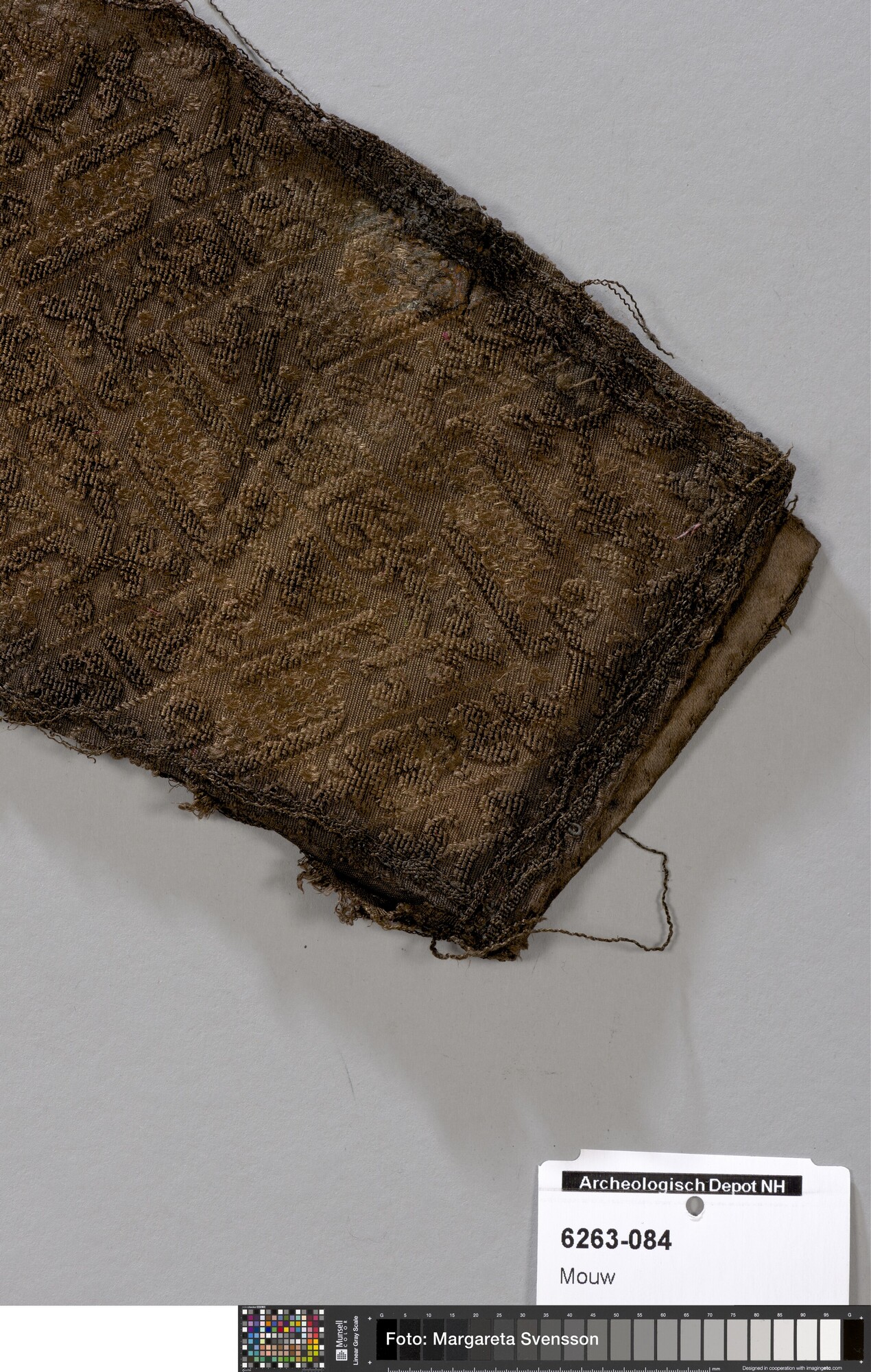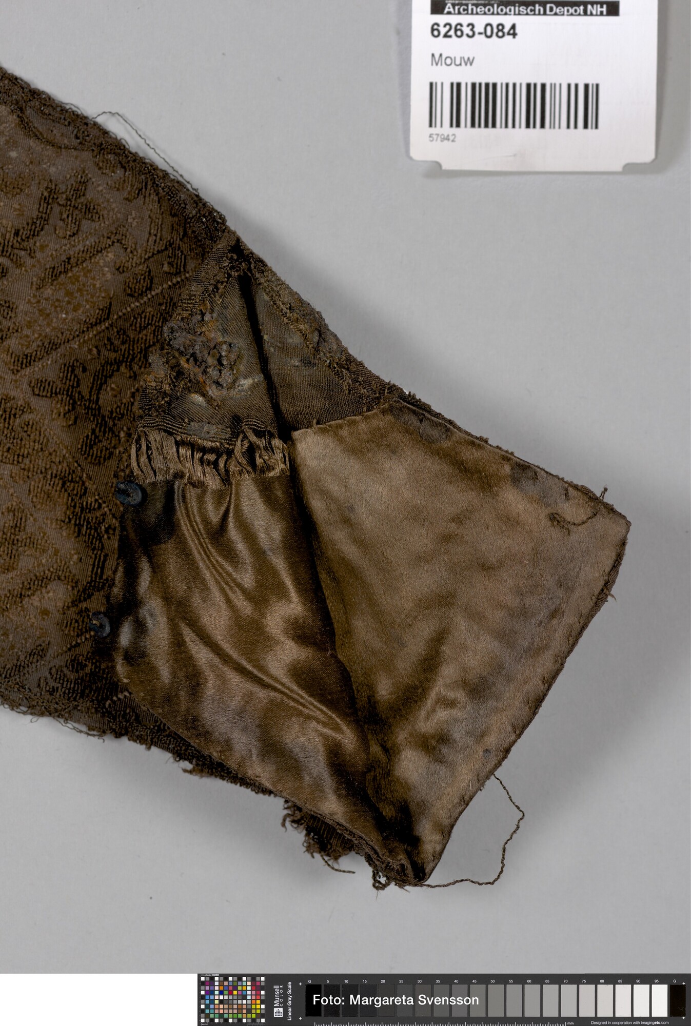 Mouw (L) onderarm; gestileerd floraal motief in zigzagpatroon, lussenpool; ciselé fluweel; haakjes