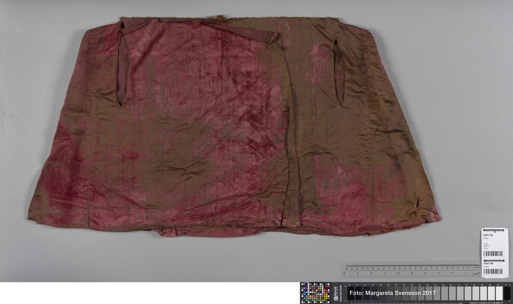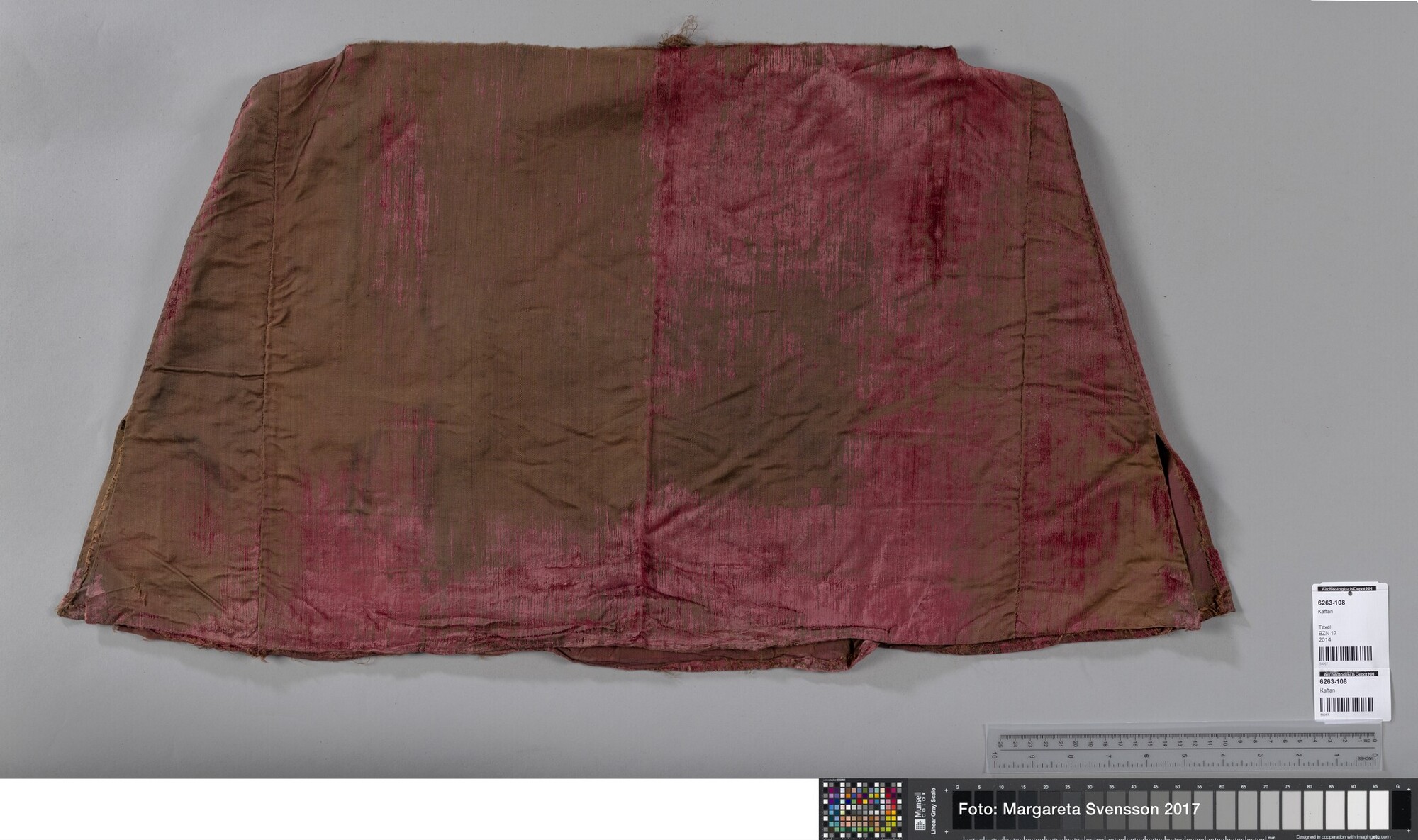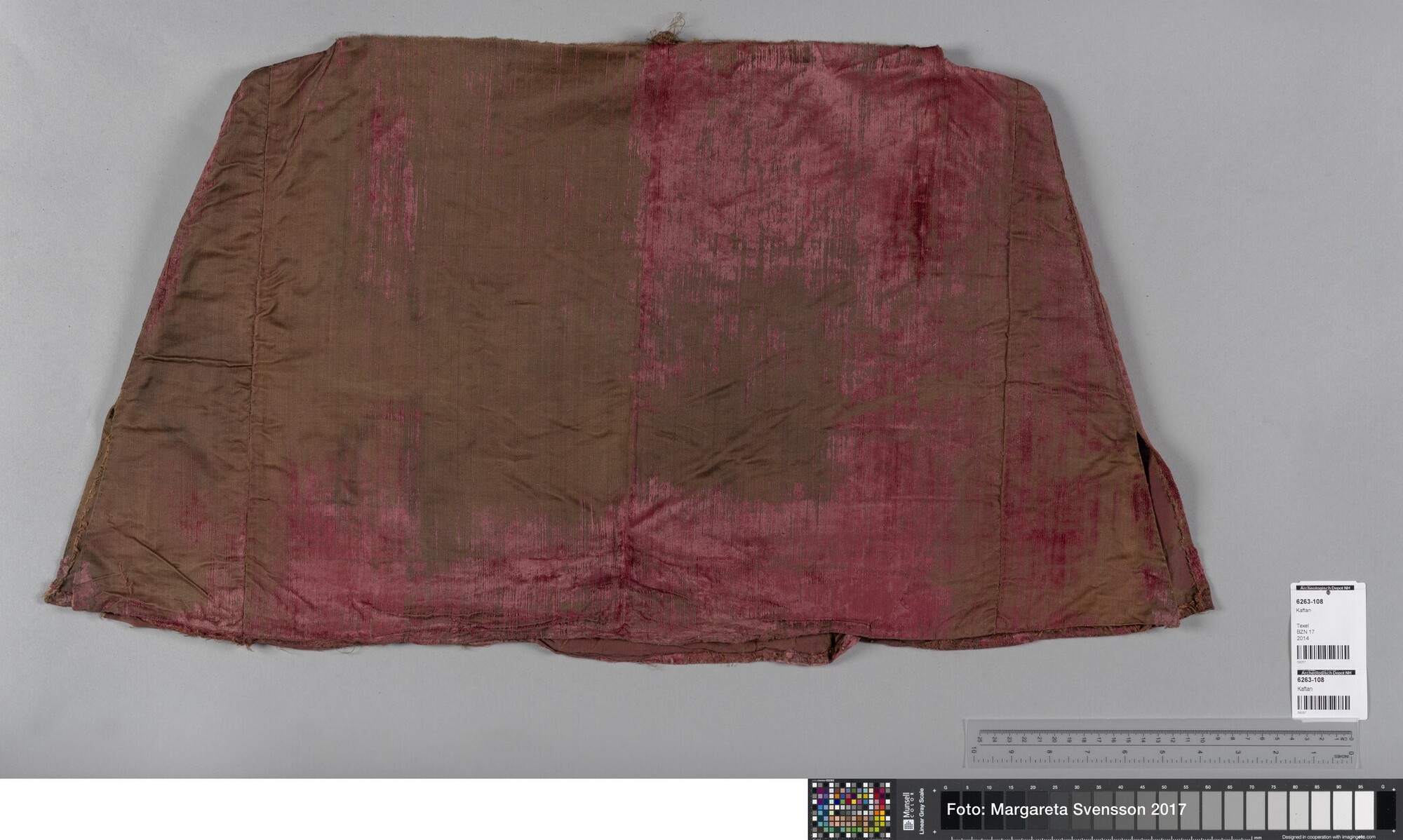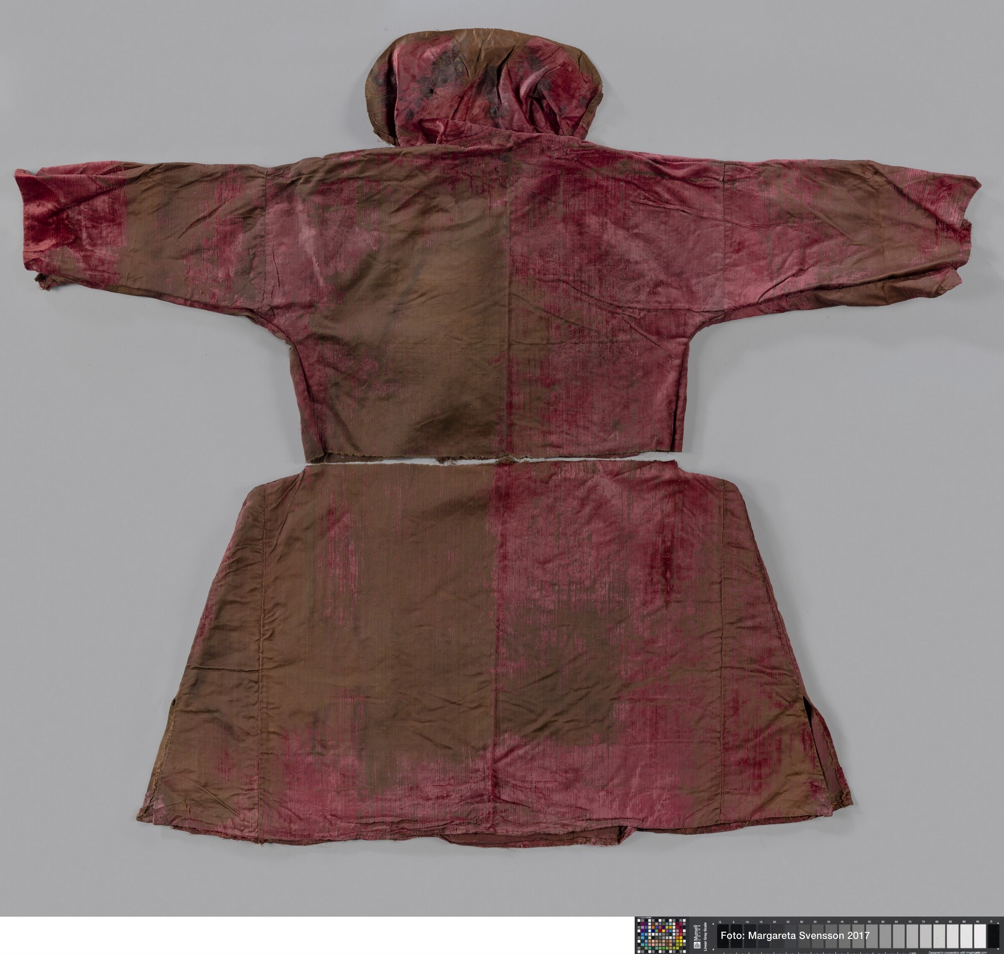 Kaftan (?); onderste deel; open aan de voorzijde, 1 achterpand, 4 zijpanden en 2 voorpanden met in beide voorpanden een opening voor een zak. Op de heupen 7 cm verbreed ten opzicht van het middel.