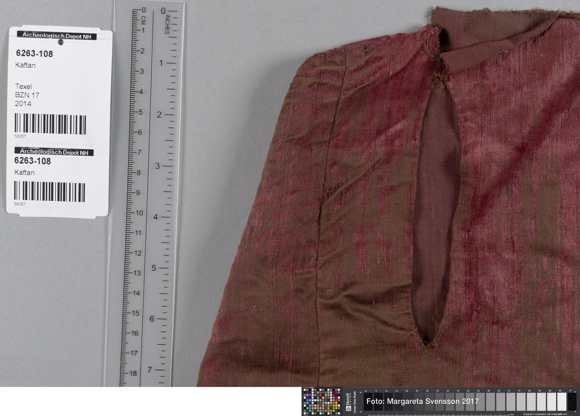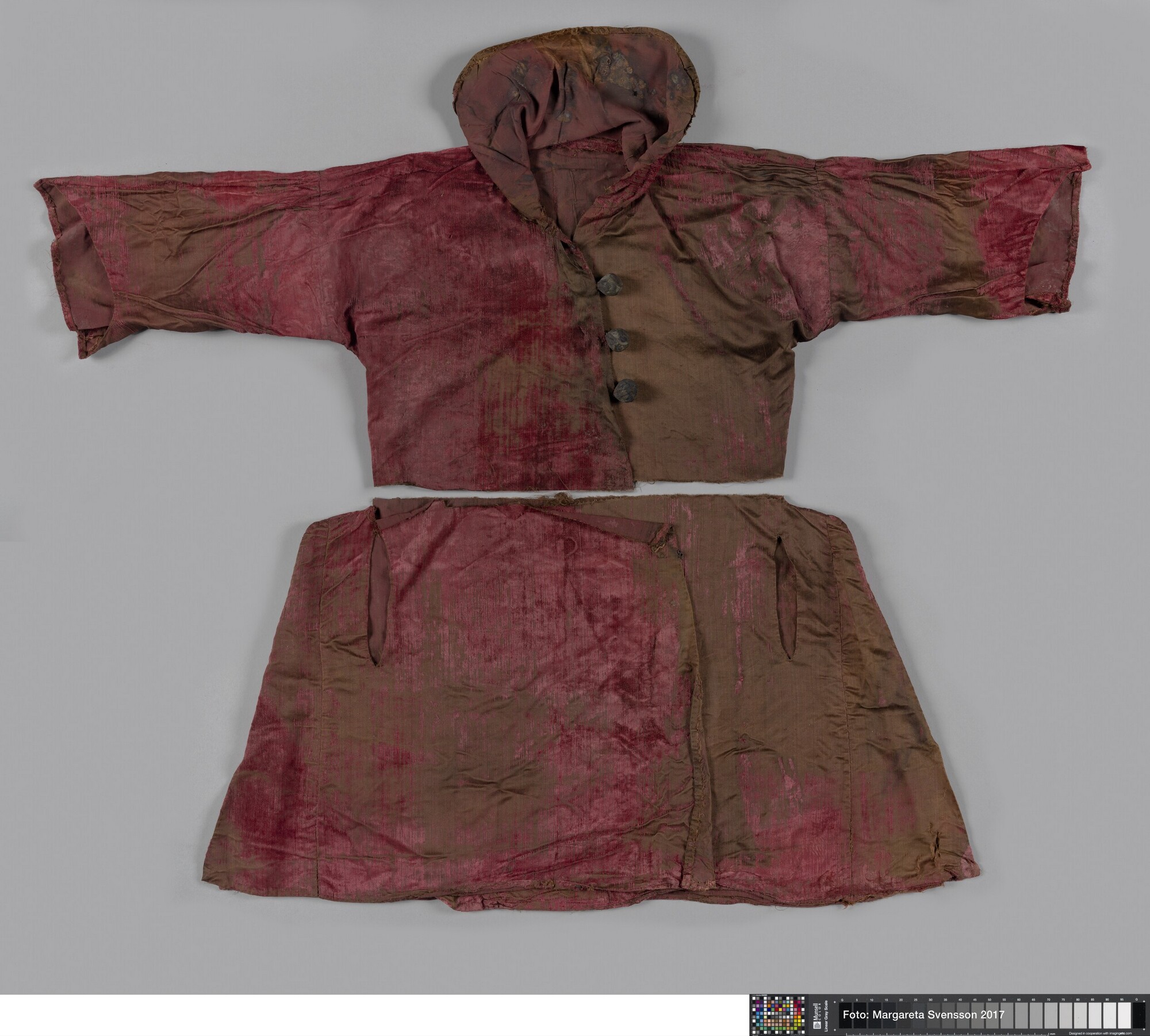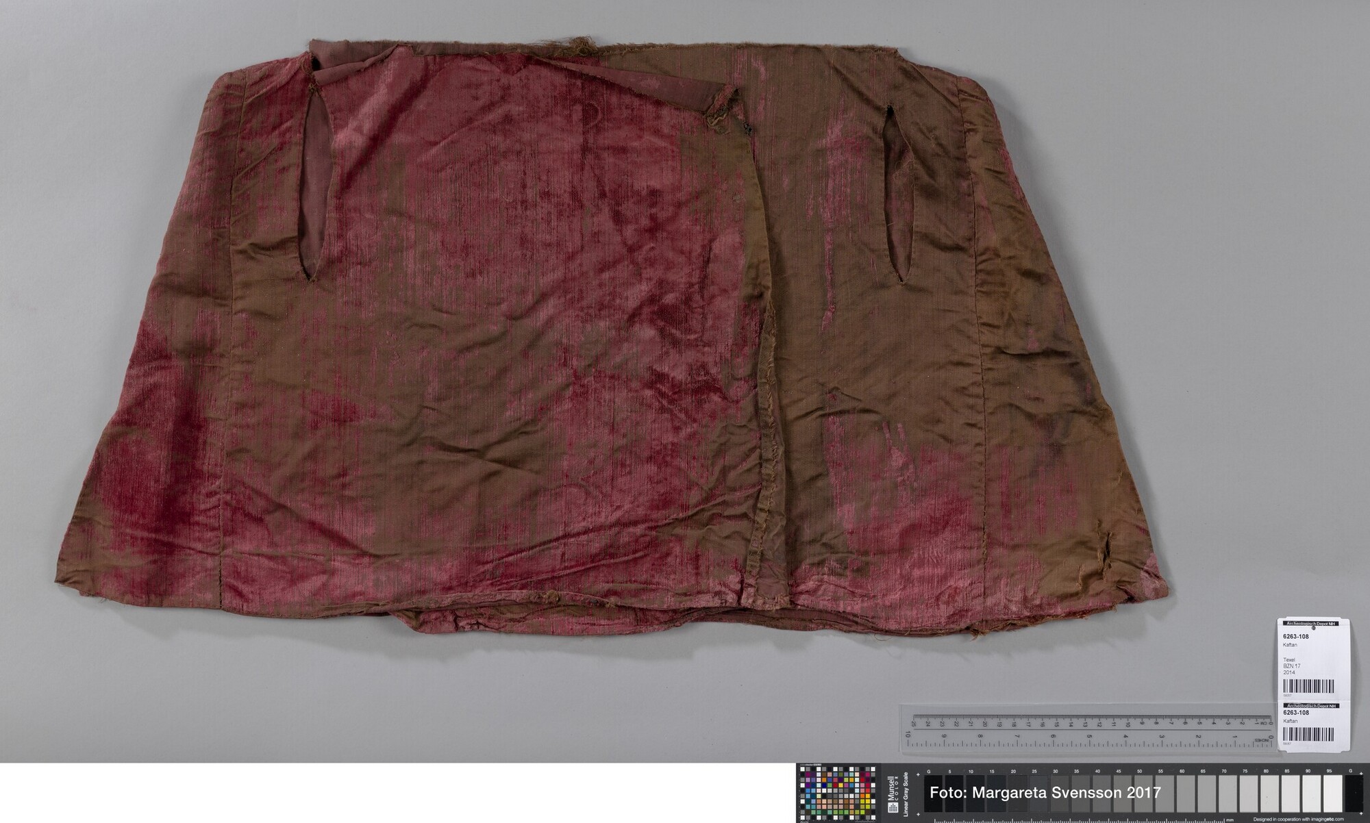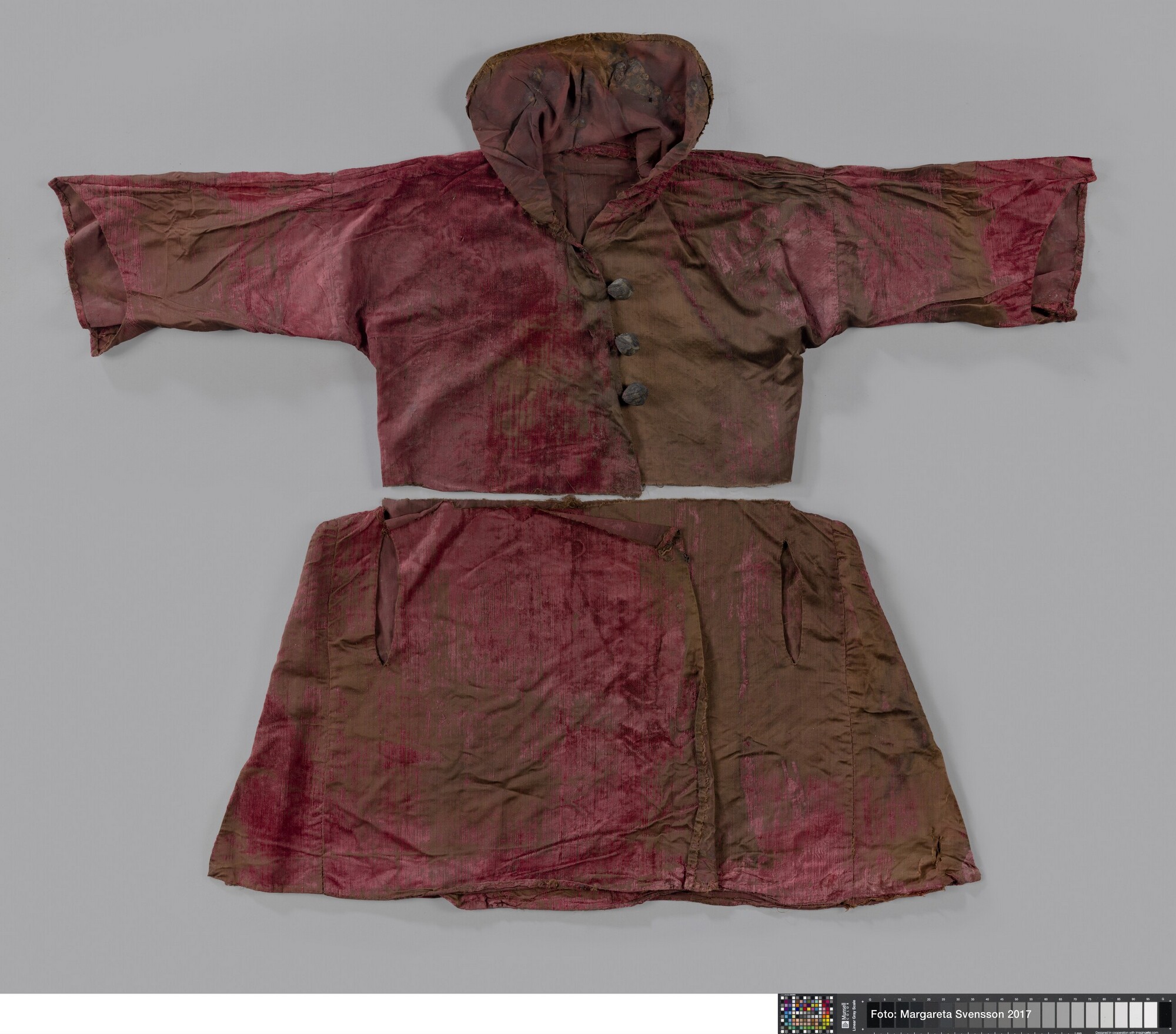 Kaftan (?); onderste deel; open aan de voorzijde, 1 achterpand, 4 zijpanden en 2 voorpanden met in beide voorpanden een opening voor een zak. Op de heupen 7 cm verbreed ten opzicht van het middel.