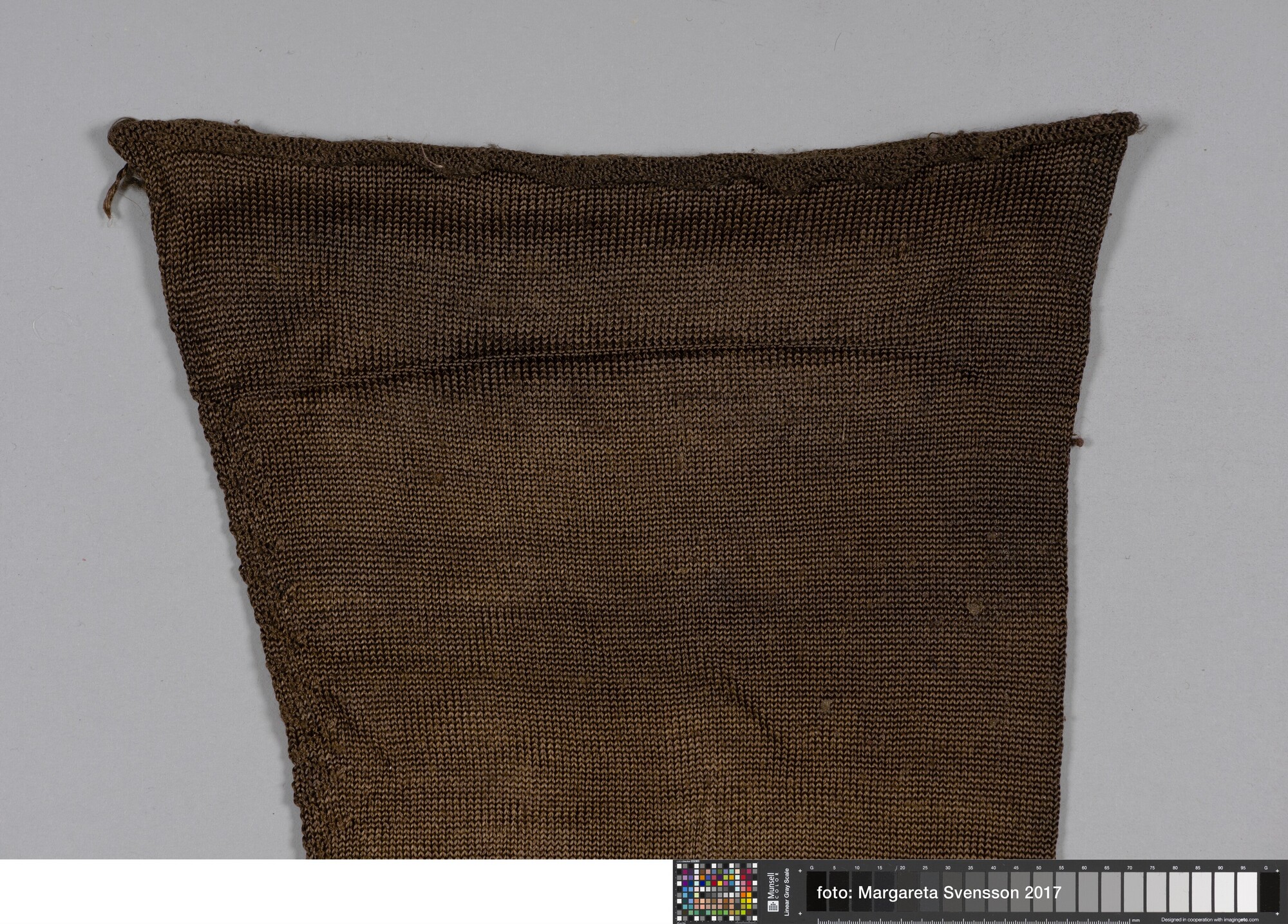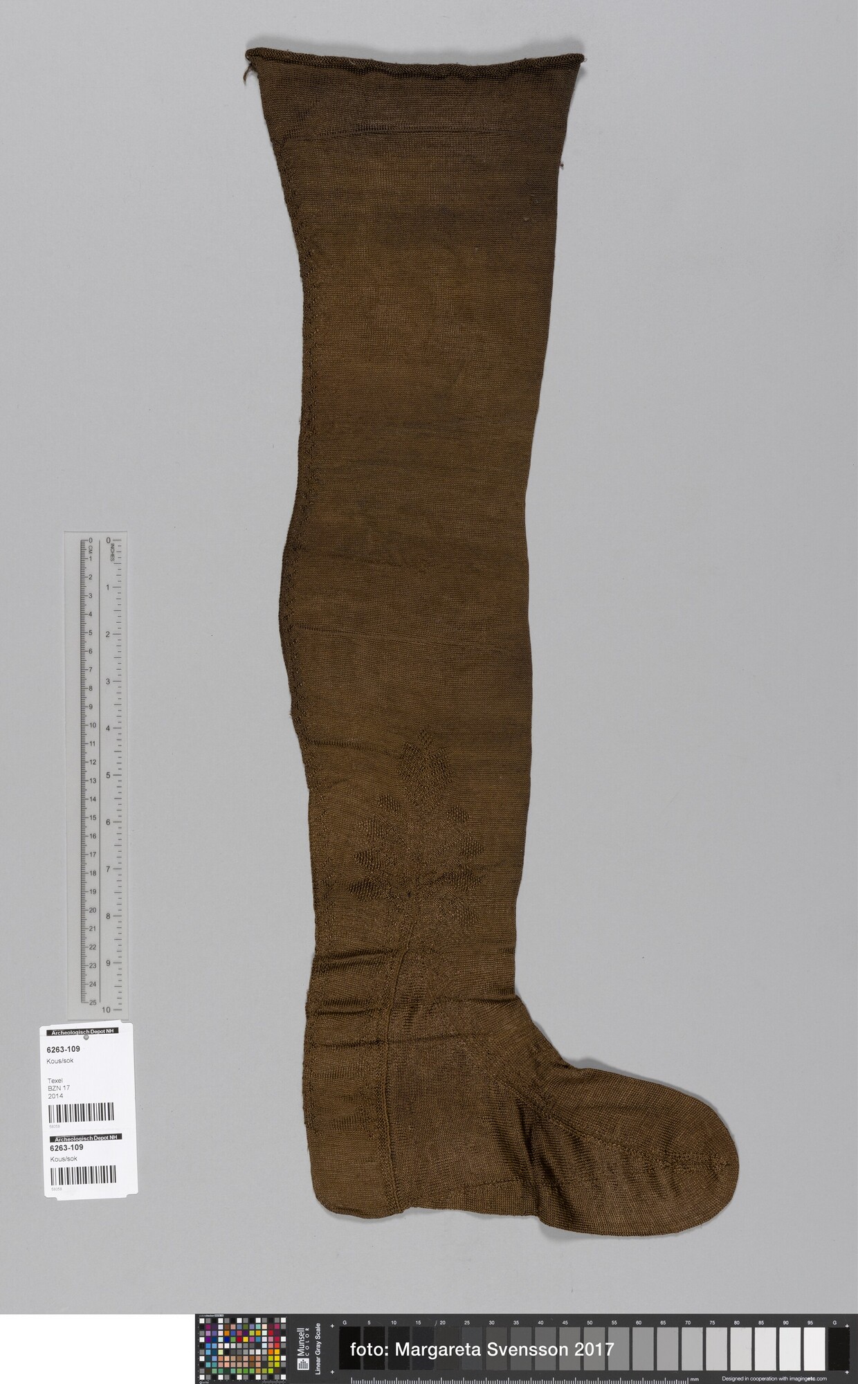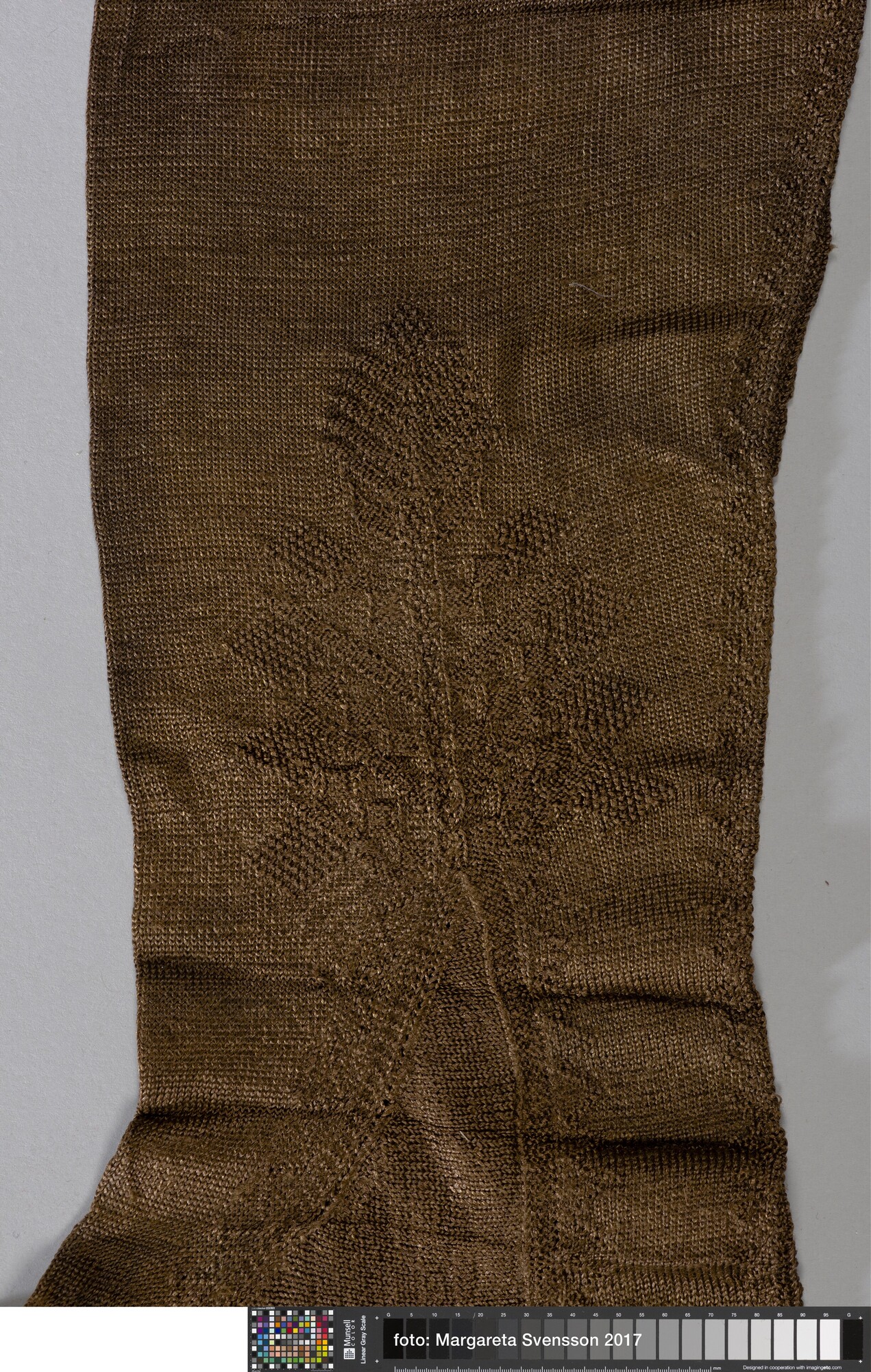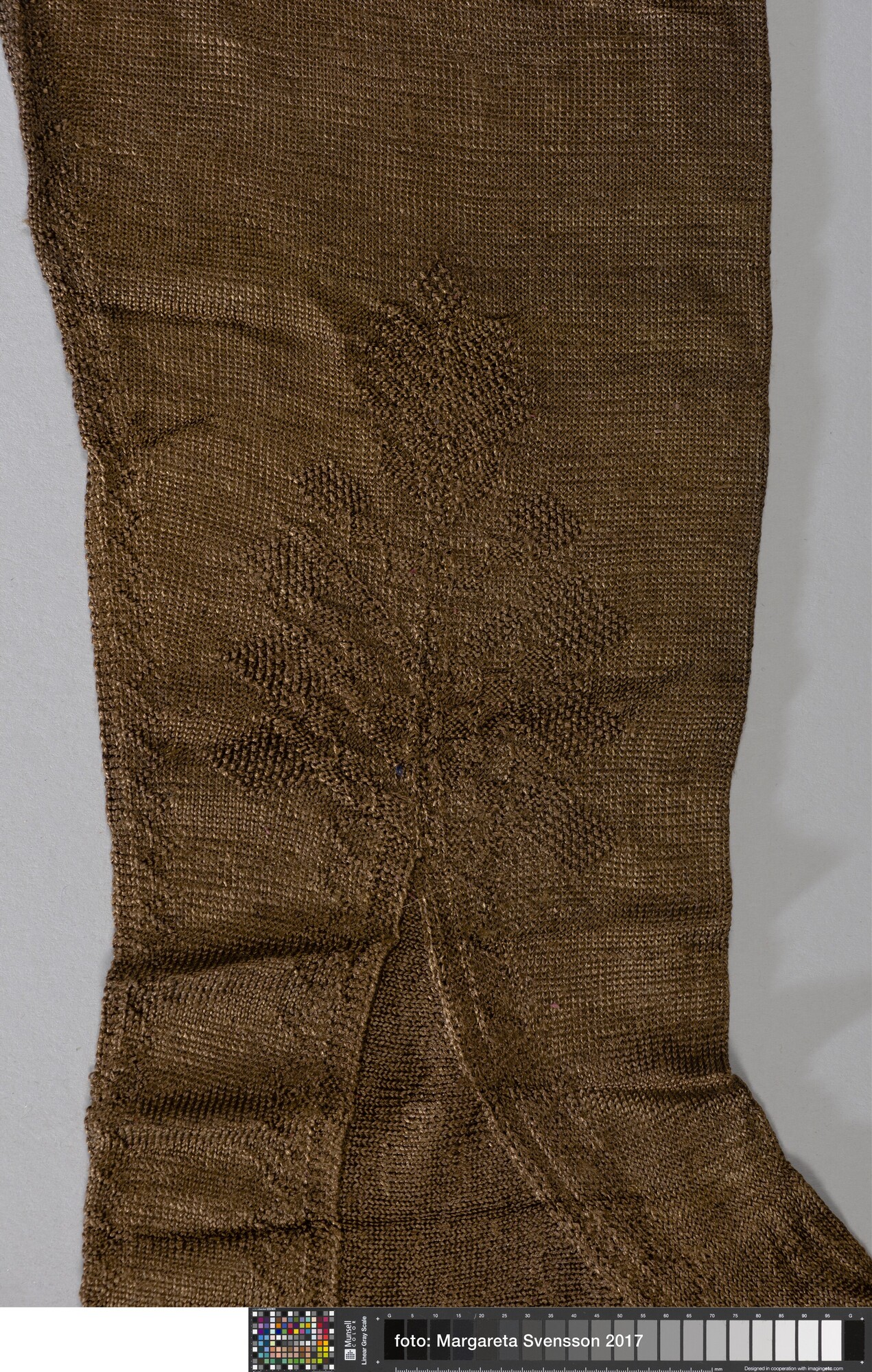 Kous; zijde; gebreid, grotendeels op ronde naald in tricotsteek, waarschijnlijk van boven naar beneden, met ingebreide palmetmotieven. De motieven zijn gevormd met averechte steken. De vorm is gemaakt door middel van meerderen en minderen, inbreien en naaien. Bovenrand krult om