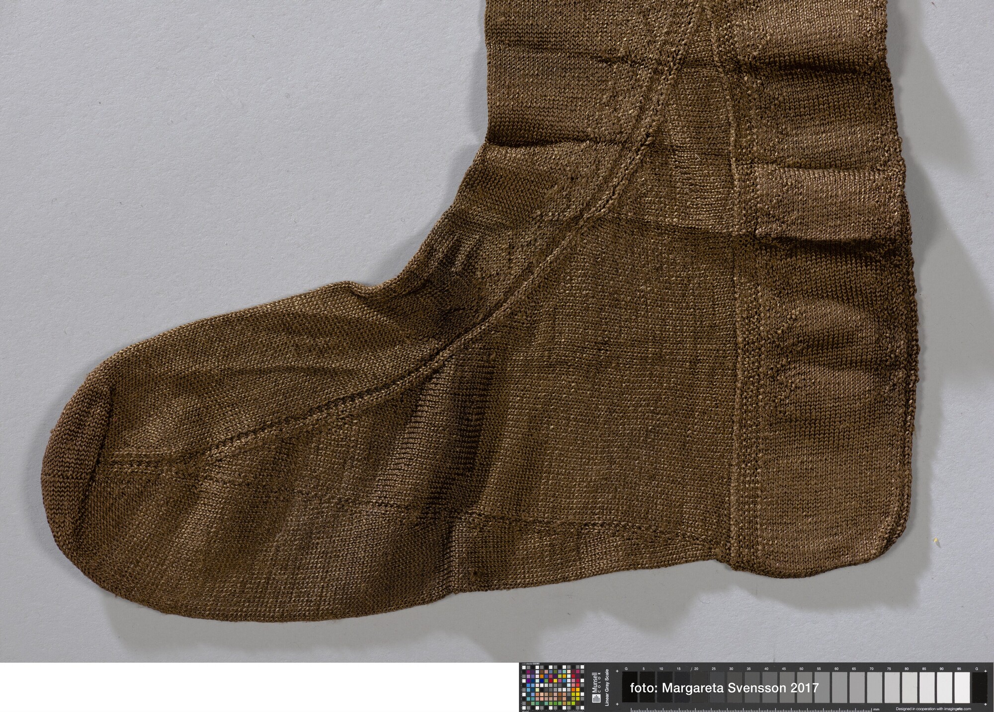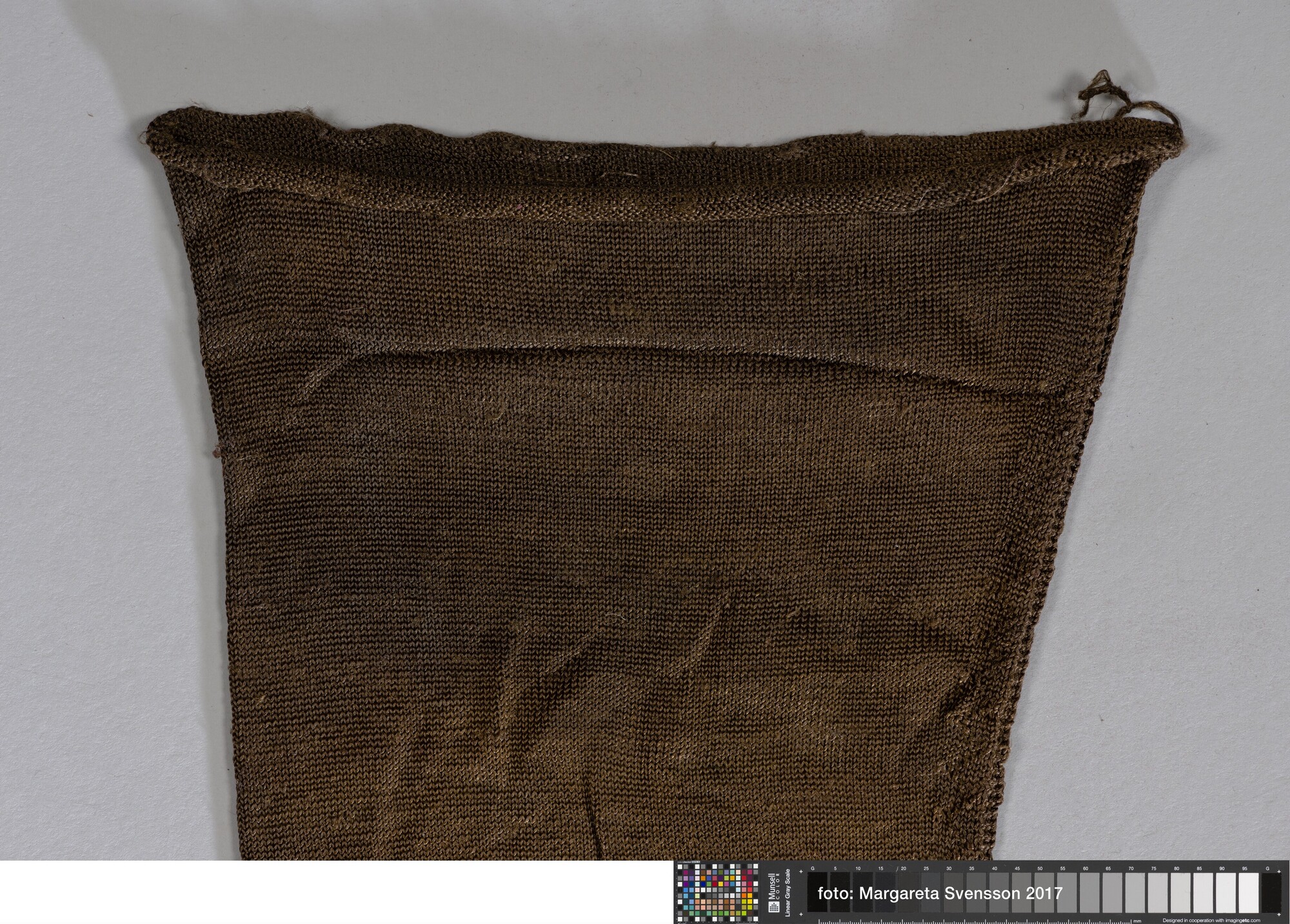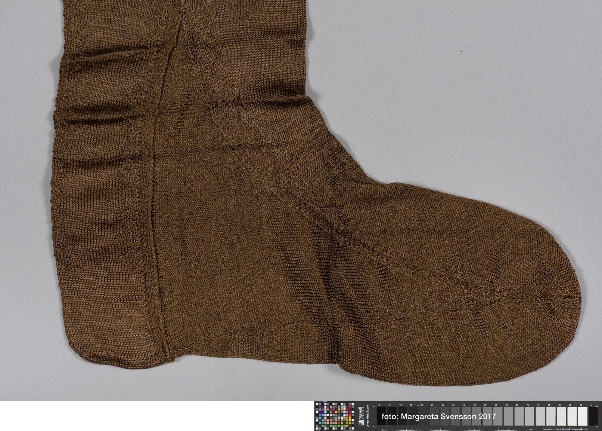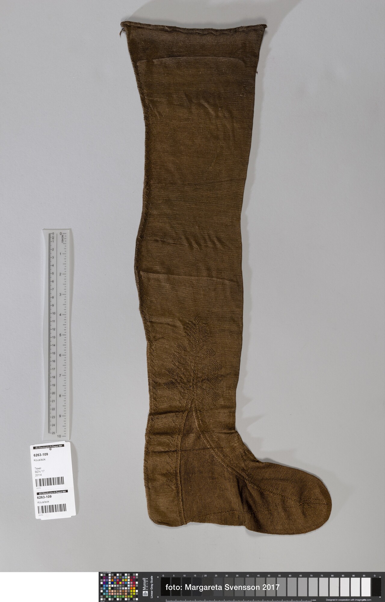 Kous; zijde; gebreid, grotendeels op ronde naald in tricotsteek, waarschijnlijk van boven naar beneden, met ingebreide palmetmotieven. De motieven zijn gevormd met averechte steken. De vorm is gemaakt door middel van meerderen en minderen, inbreien en naaien. Bovenrand krult om