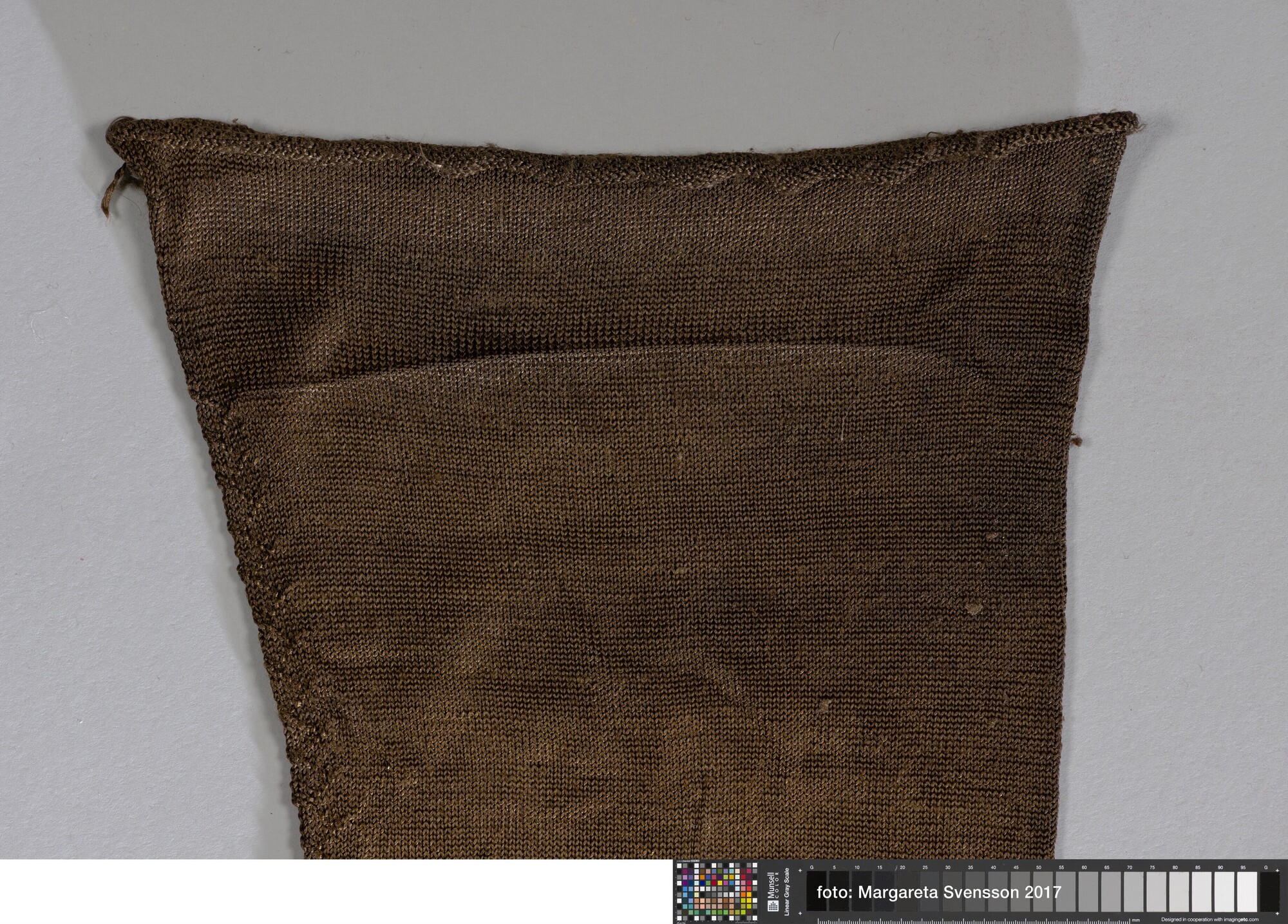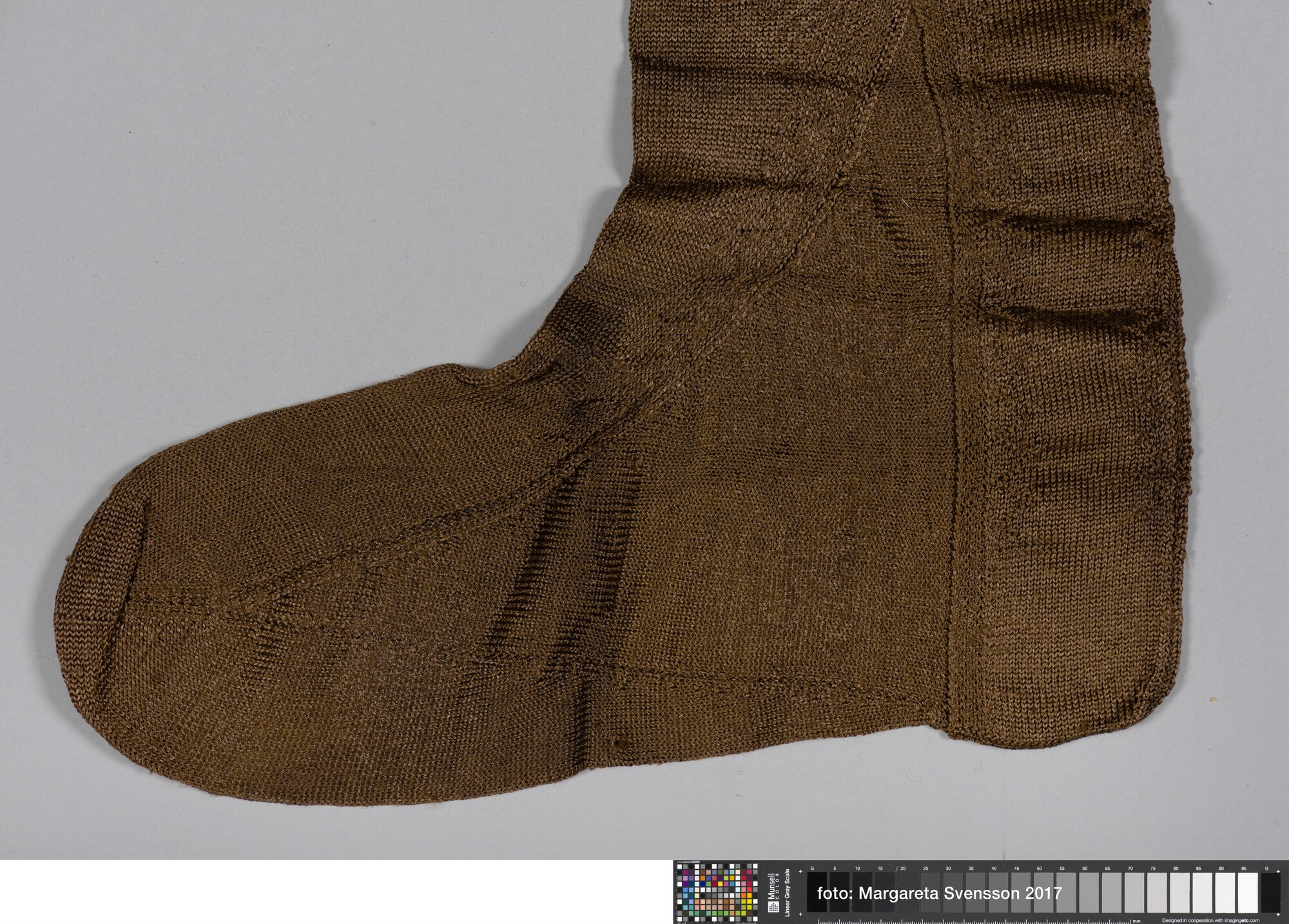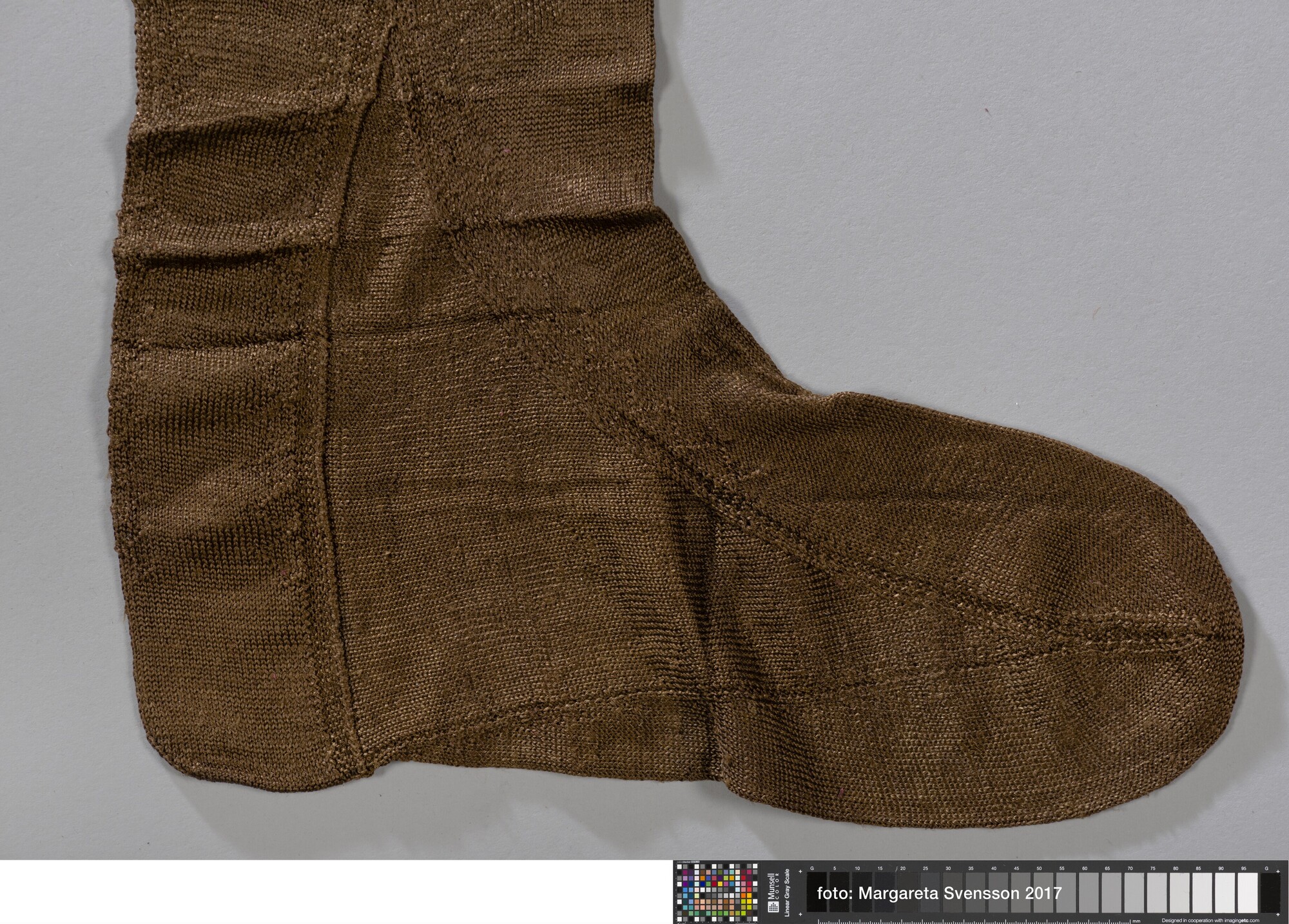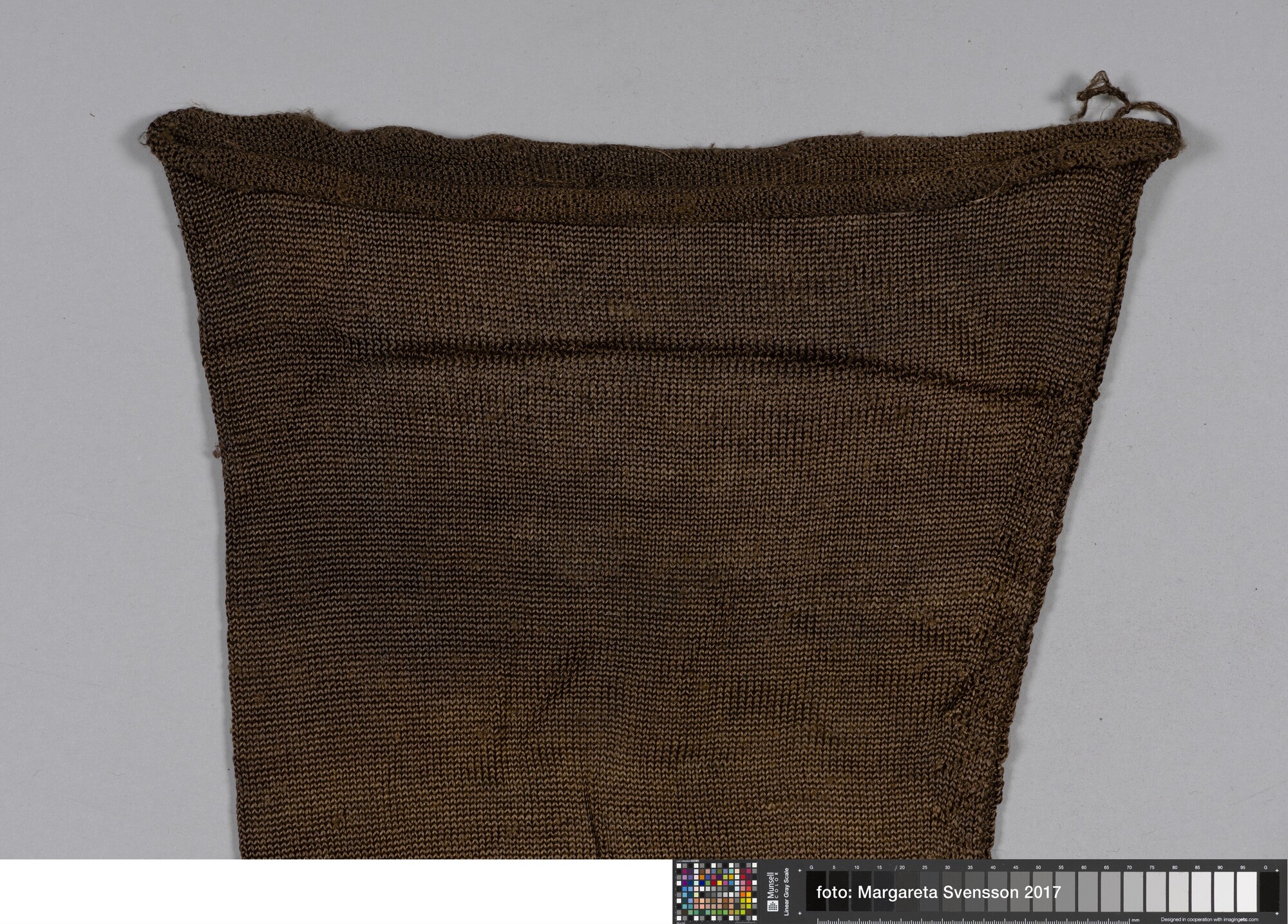 Kous; zijde; gebreid, grotendeels op ronde naald in tricotsteek, waarschijnlijk van boven naar beneden, met ingebreide palmetmotieven. De motieven zijn gevormd met averechte steken. De vorm is gemaakt door middel van meerderen en minderen, inbreien en naaien. Bovenrand krult om