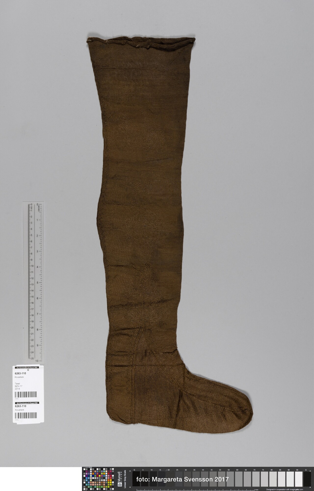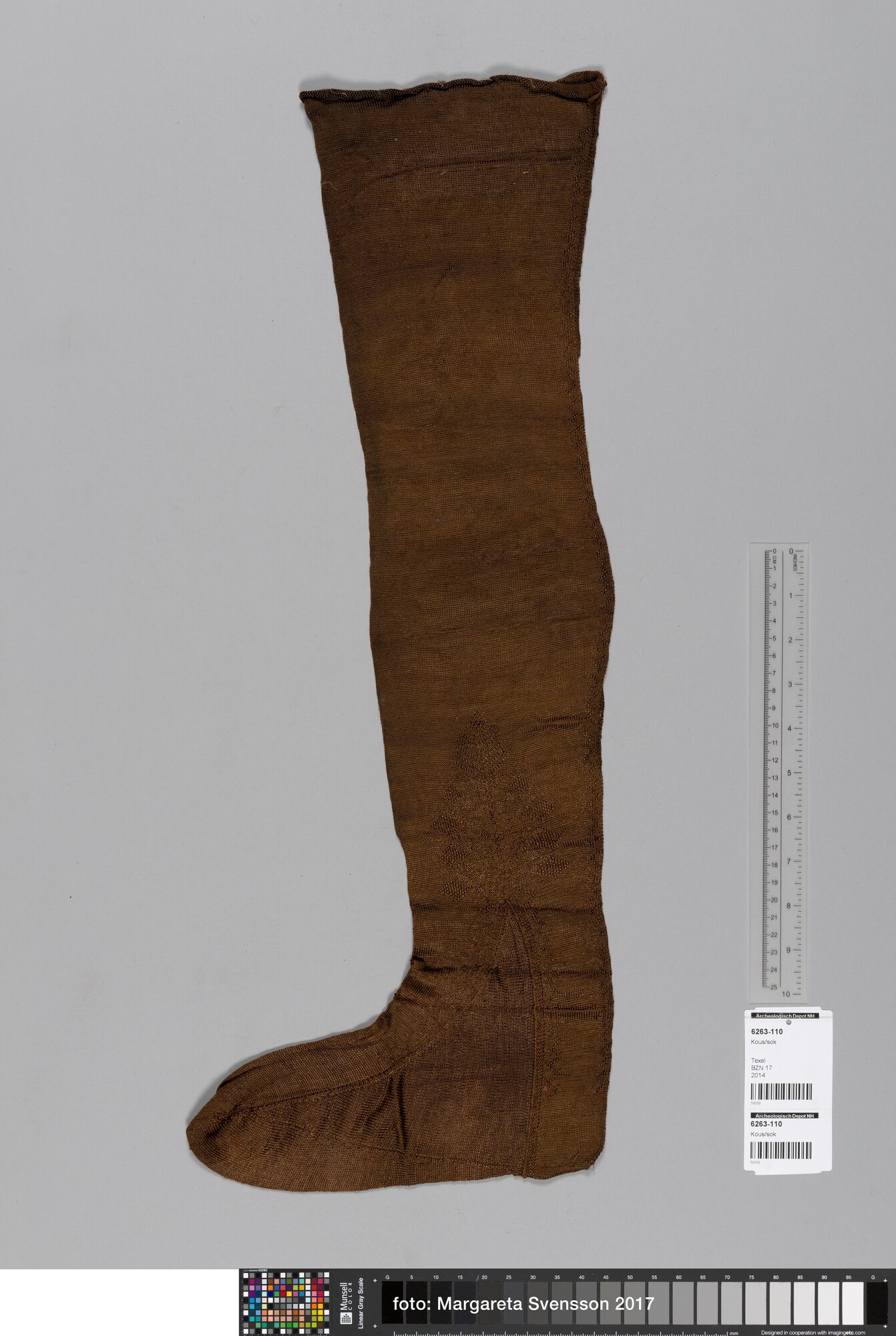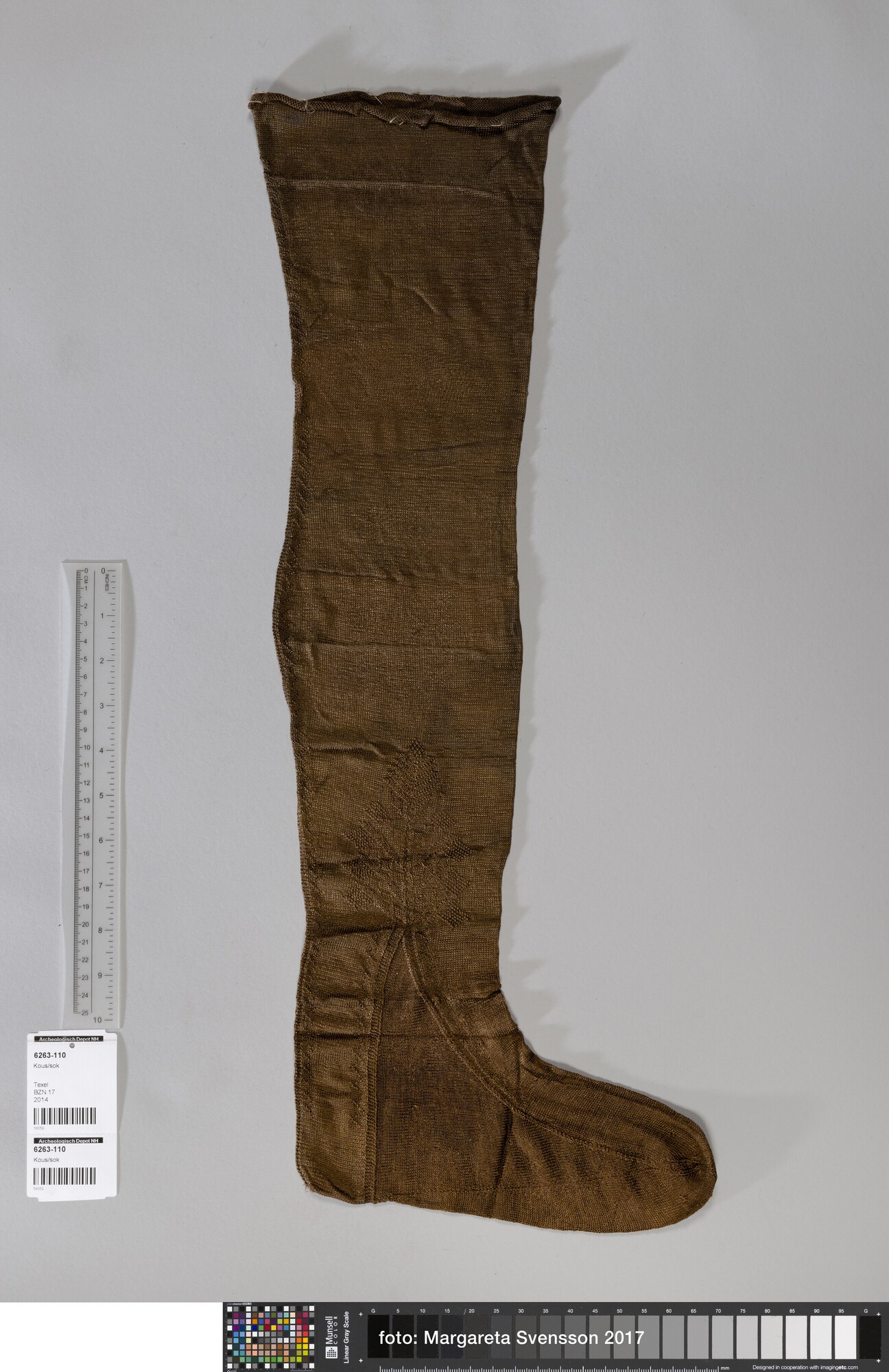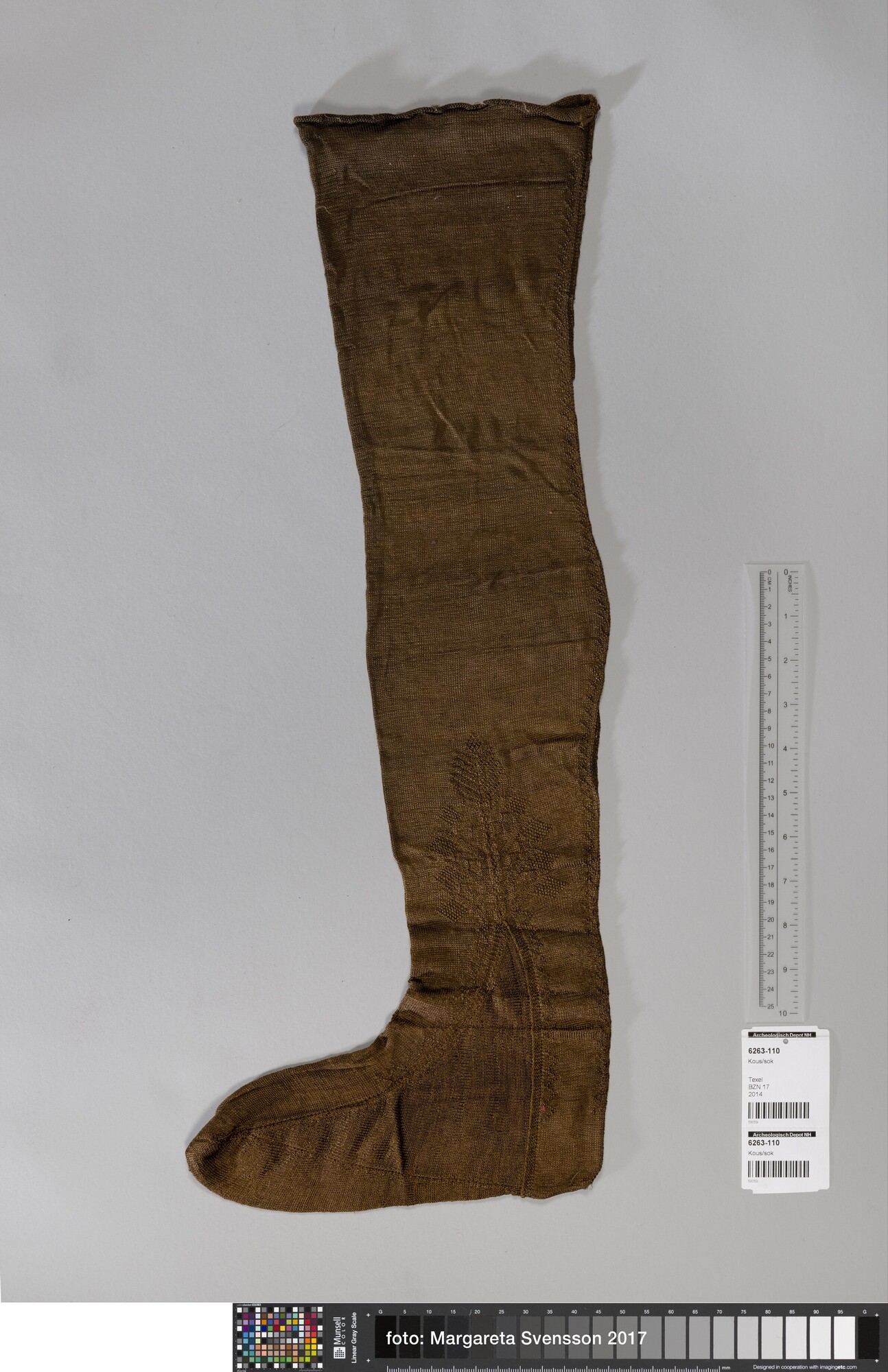 Kous; Gebreid, grotendeels op ronde naald in tricotsteek, waarschijnlijk van boven naar beneden, met ingebreide palmetmotieven. De motieven zijn gevormd met averechte steken. De vorm is gemaakt door middel van meerderen en minderen, inbreien en naaien. Bovenrand krult om