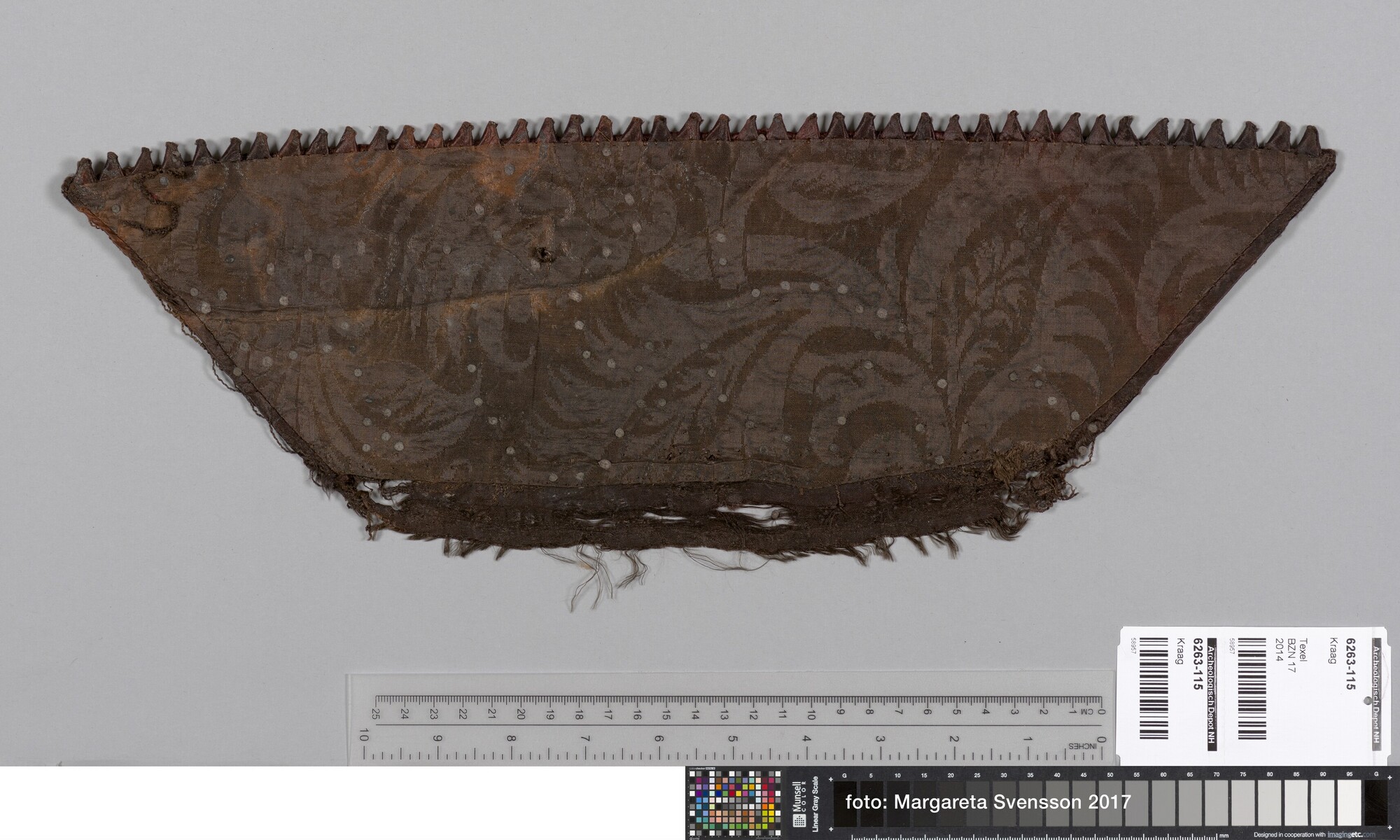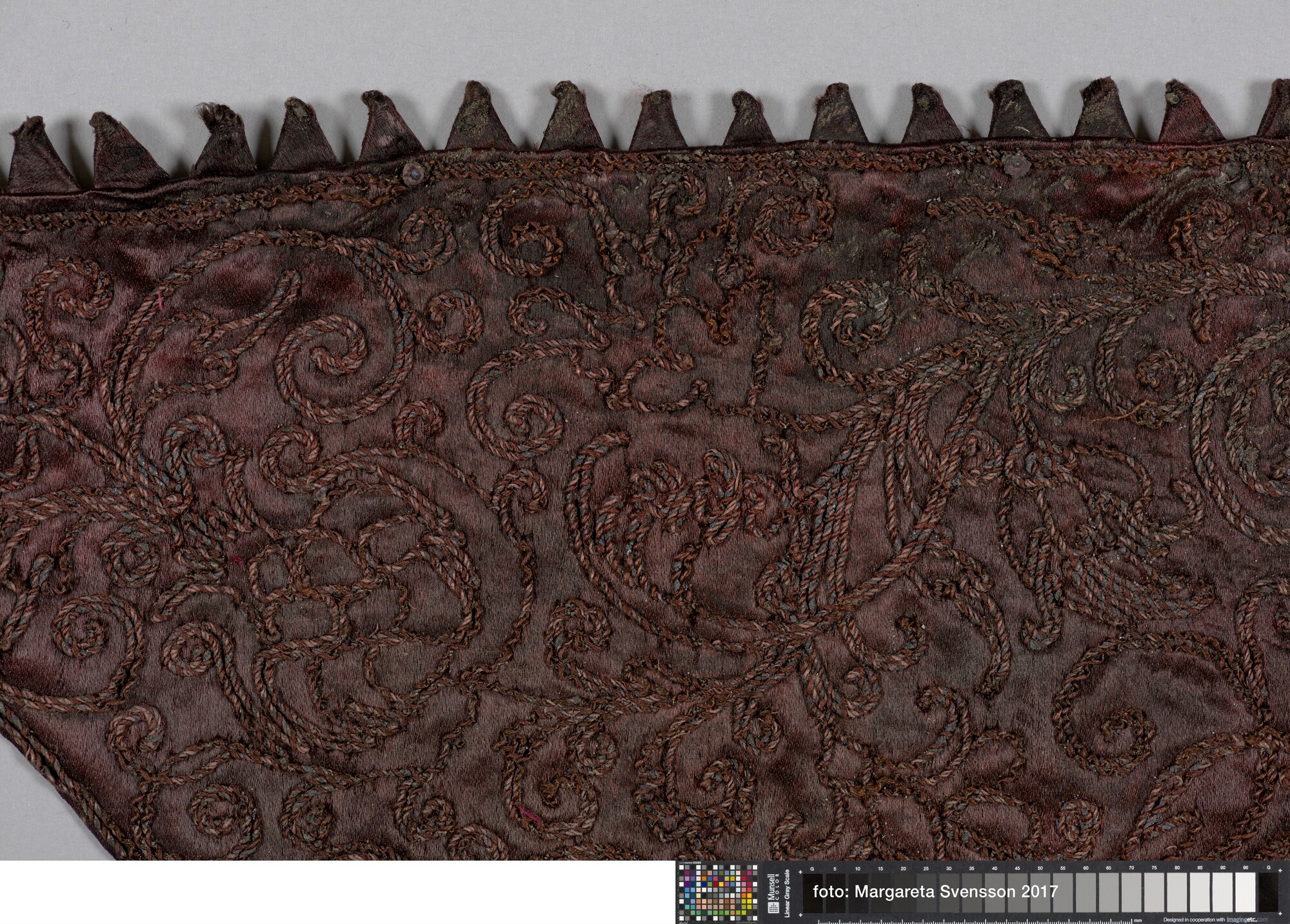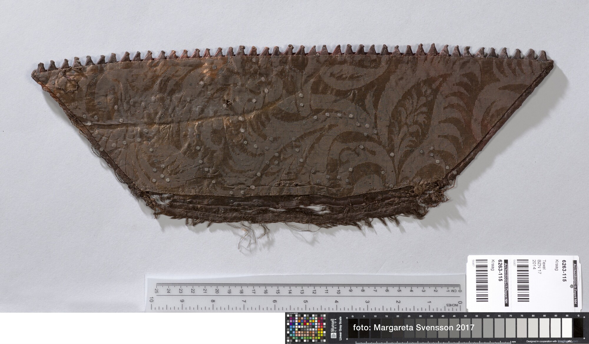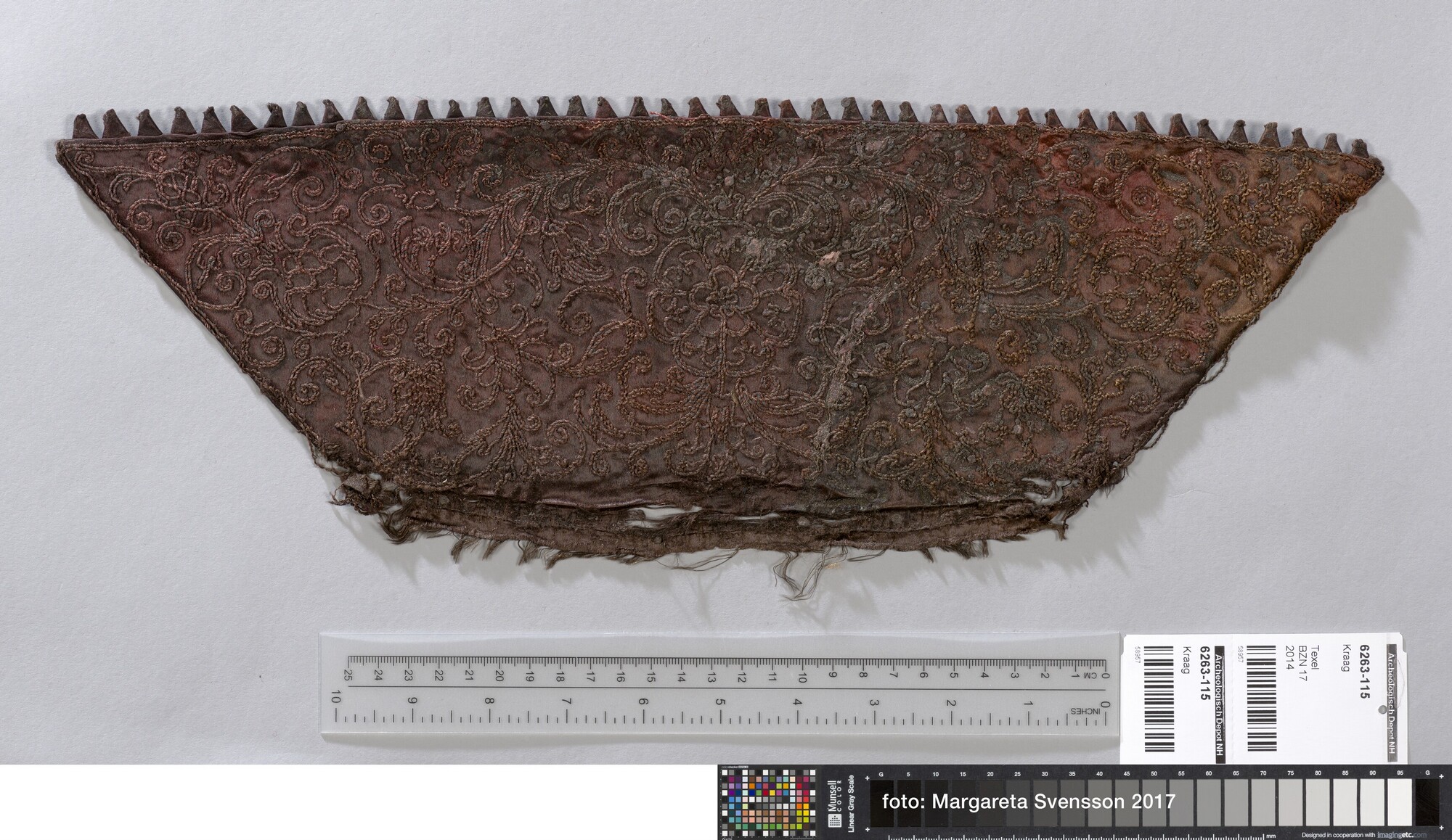 Kraag van zijden satijn, geheel geborduurd met metaaldraad met florale motieven, met een voering van damast met floraal motief. Aan de buitenzijde van de kraag een sierrand van puntjes