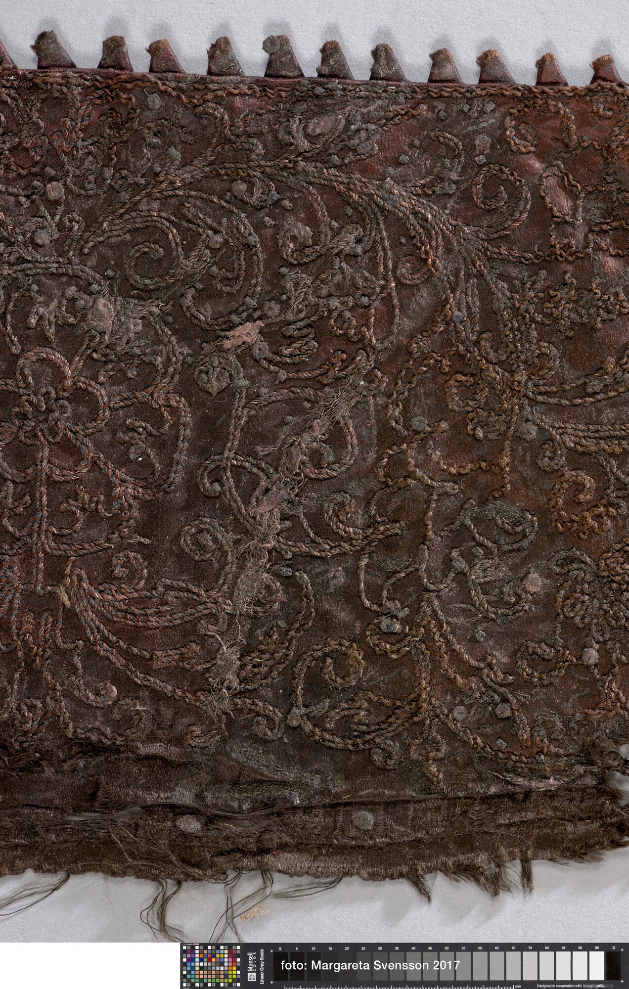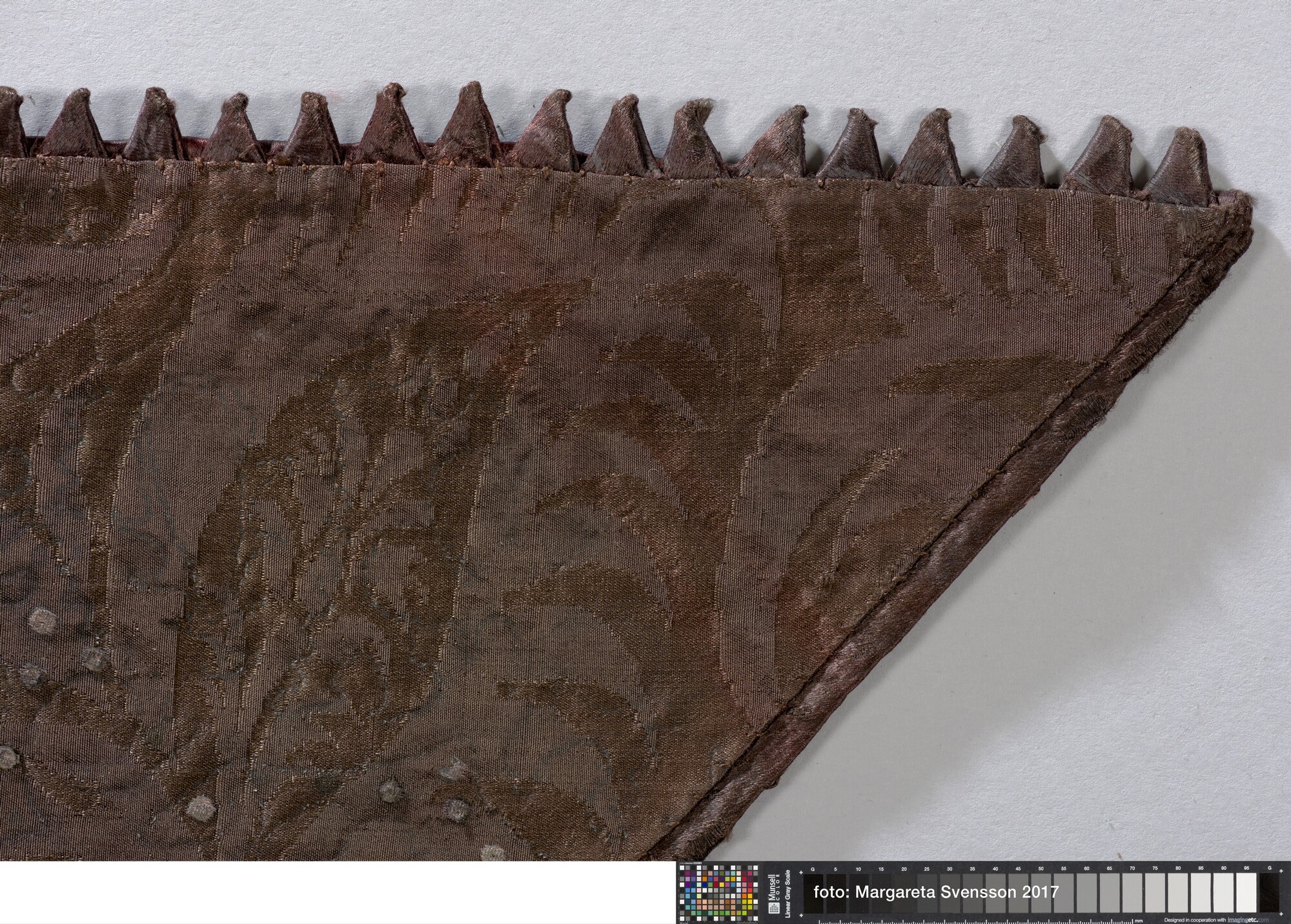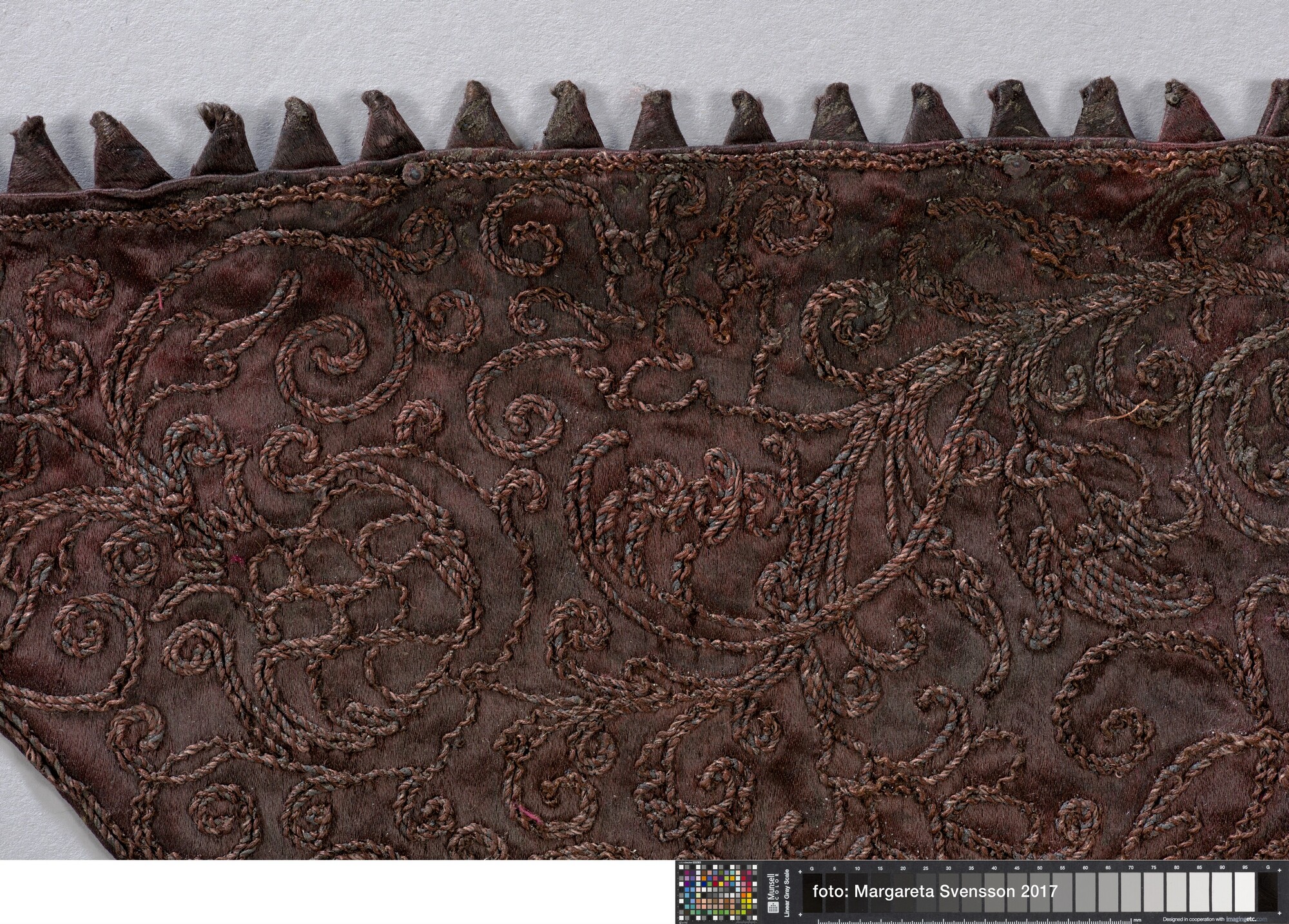 Kraag van zijden satijn, geheel geborduurd met metaaldraad met florale motieven, met een voering van damast met floraal motief. Aan de buitenzijde van de kraag een sierrand van puntjes