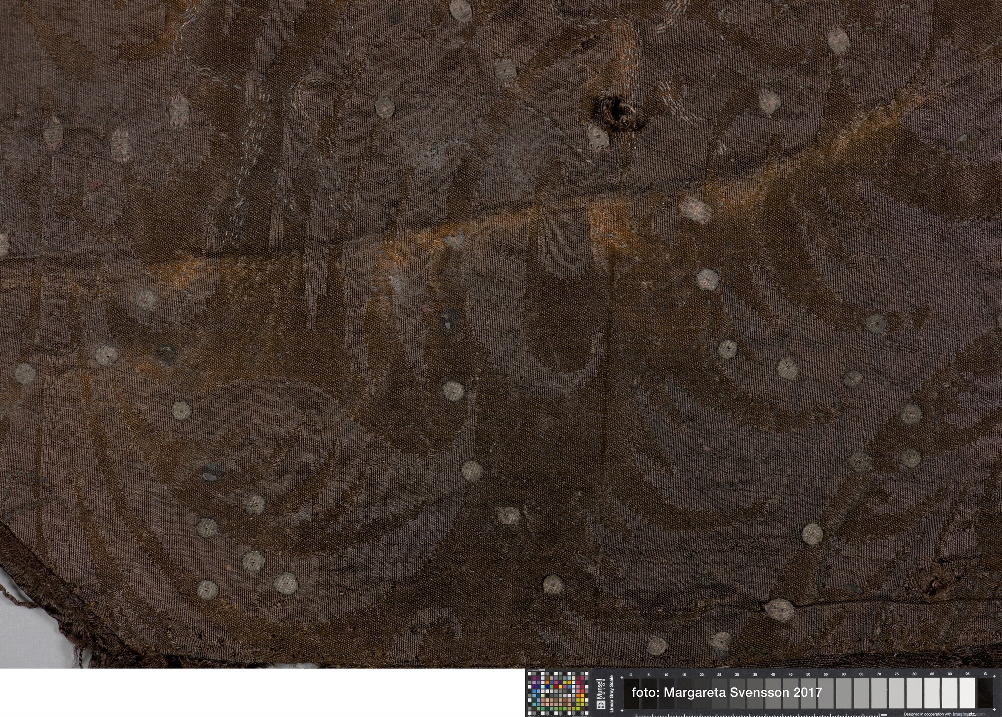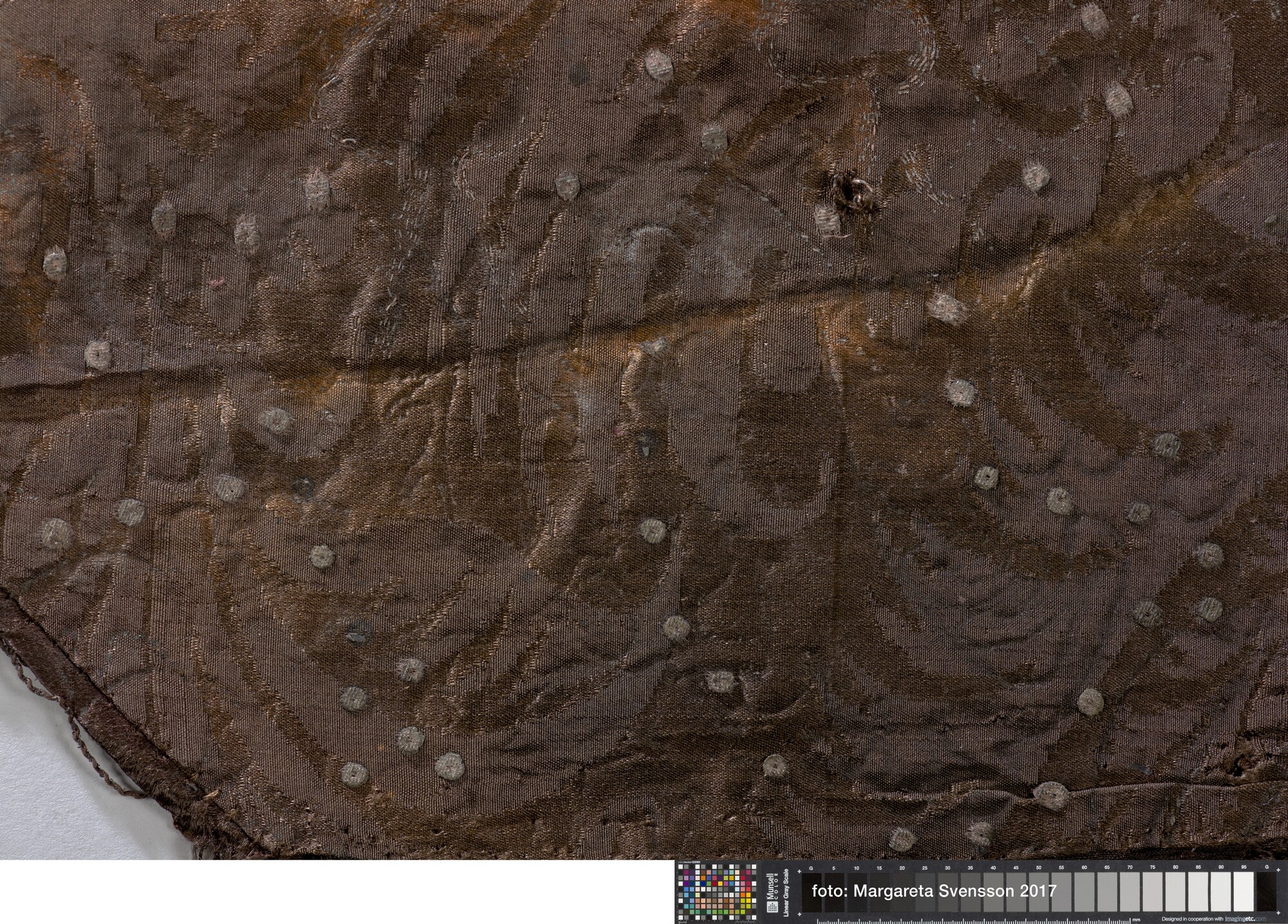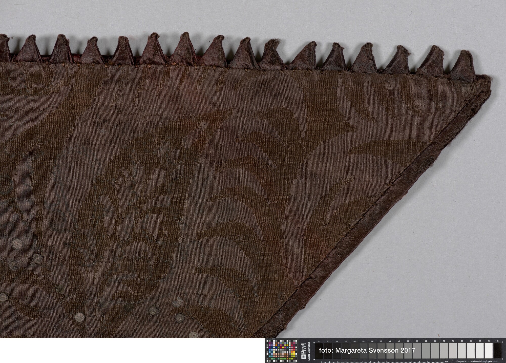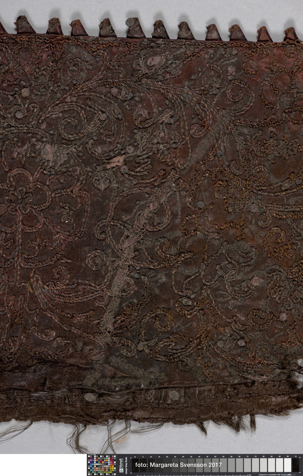 Kraag van zijden satijn, geheel geborduurd met metaaldraad met florale motieven, met een voering van damast met floraal motief. Aan de buitenzijde van de kraag een sierrand van puntjes