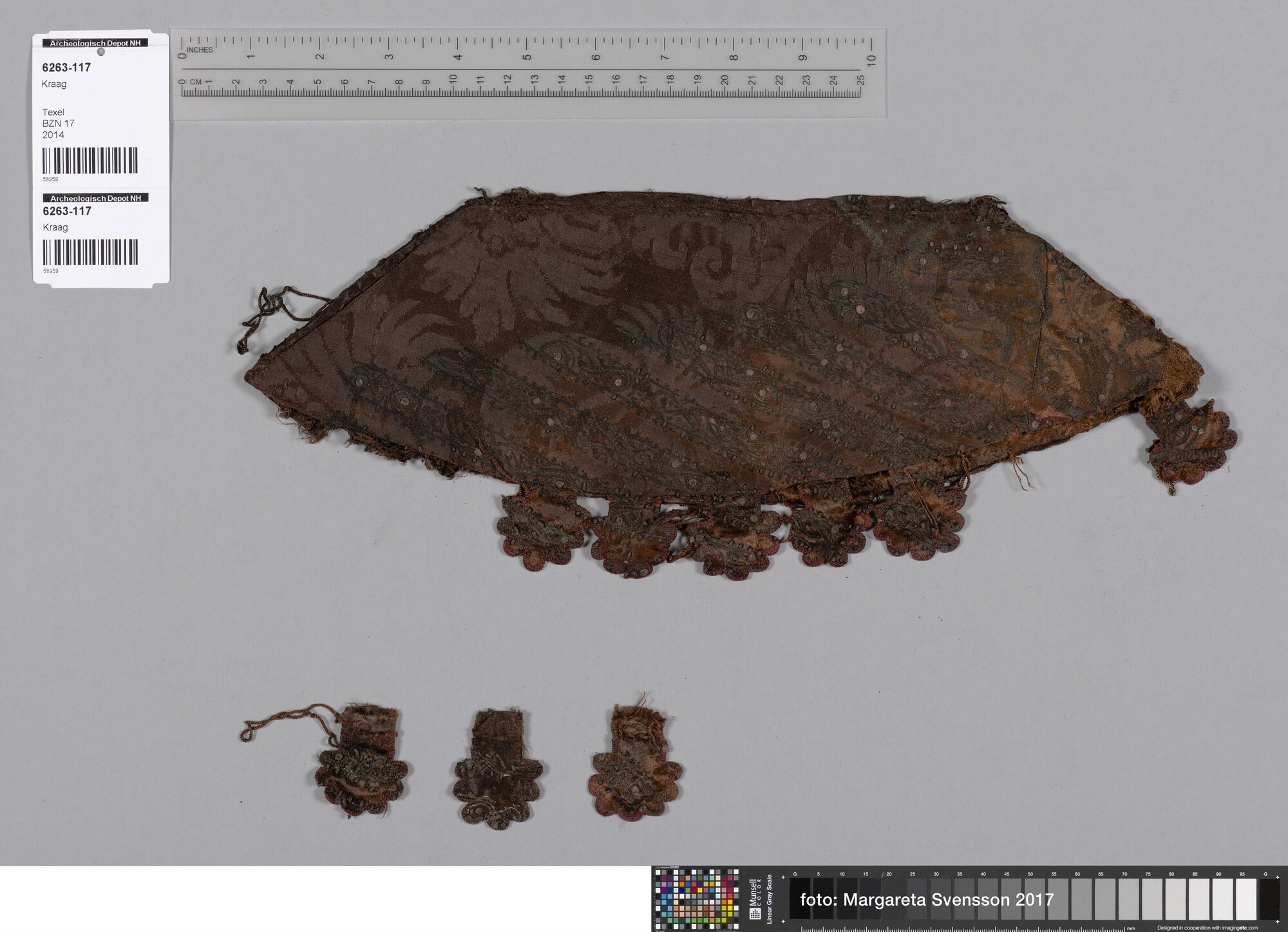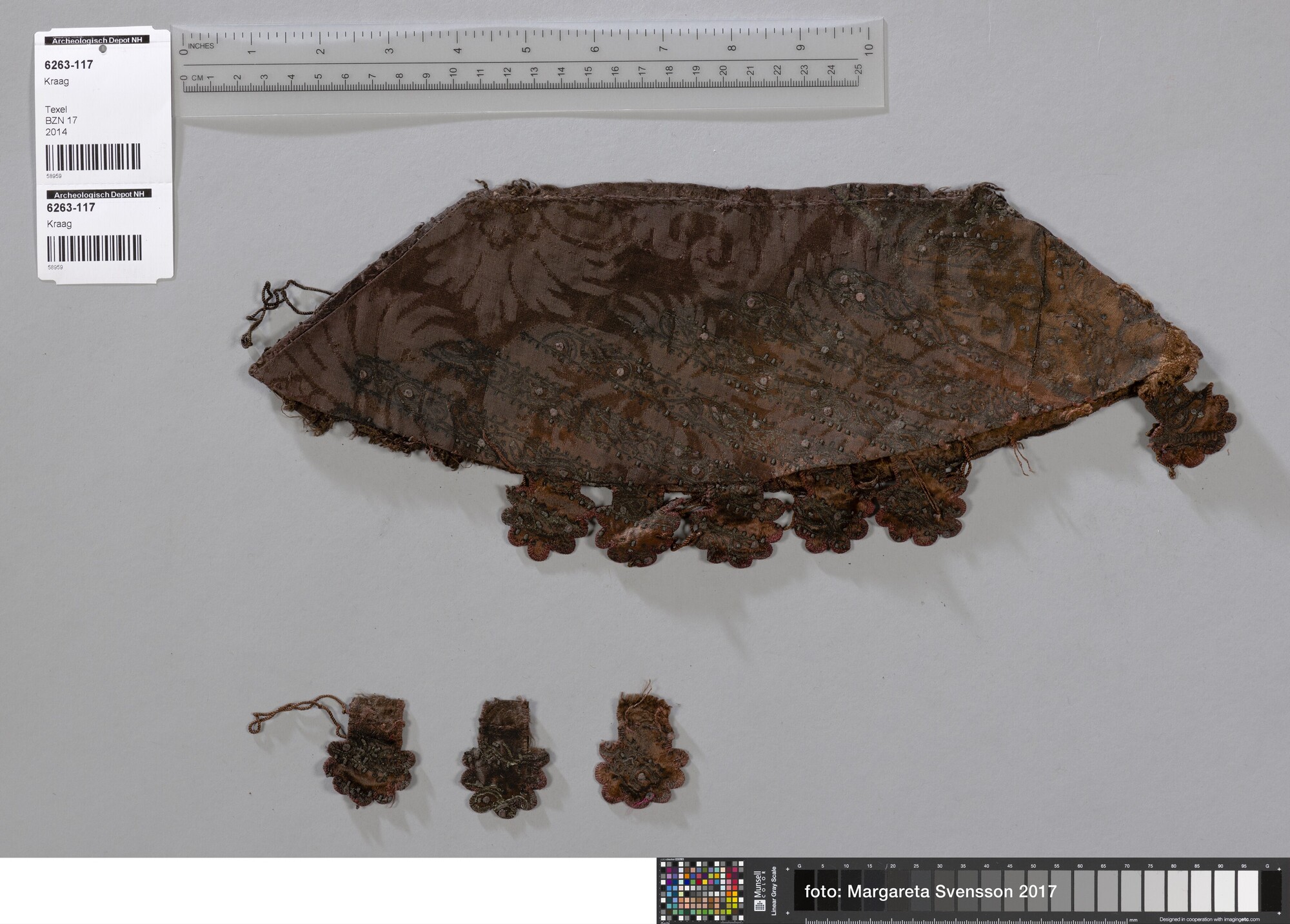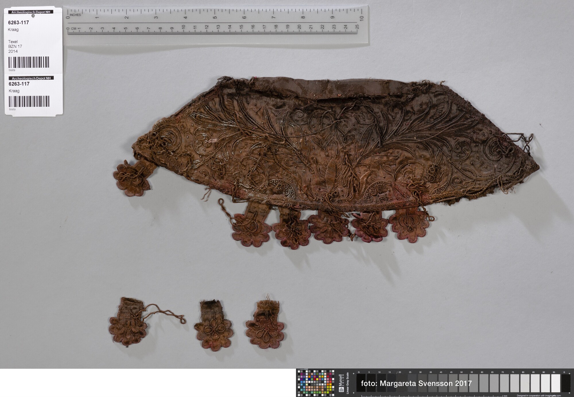 Kraag van satijn, enigszins rond van vorm, geheel geborduurd, met passement, gevoerd en langs de buitenrand versierd met bloemvormige 'flapjes'. Opgelegd borduurwerk van verschillende garens, getwijnd en ongetwijnd in verschillende diktes. De bloemvormige versiering langs de buitenrand is versierd met verschillende borduurpatronen: een klavertje, een kroontje, en nog iets onduidelijks. De randen zijn afgewerkt met ...