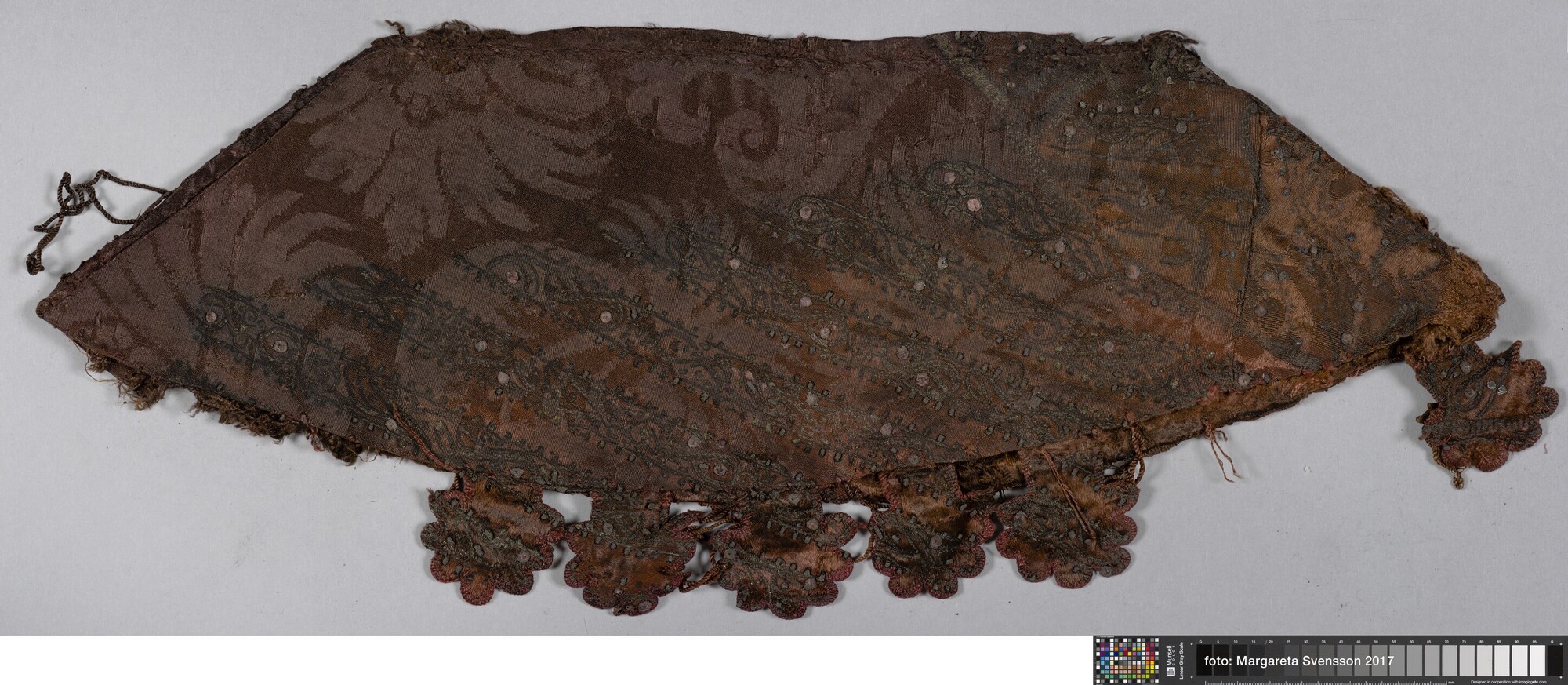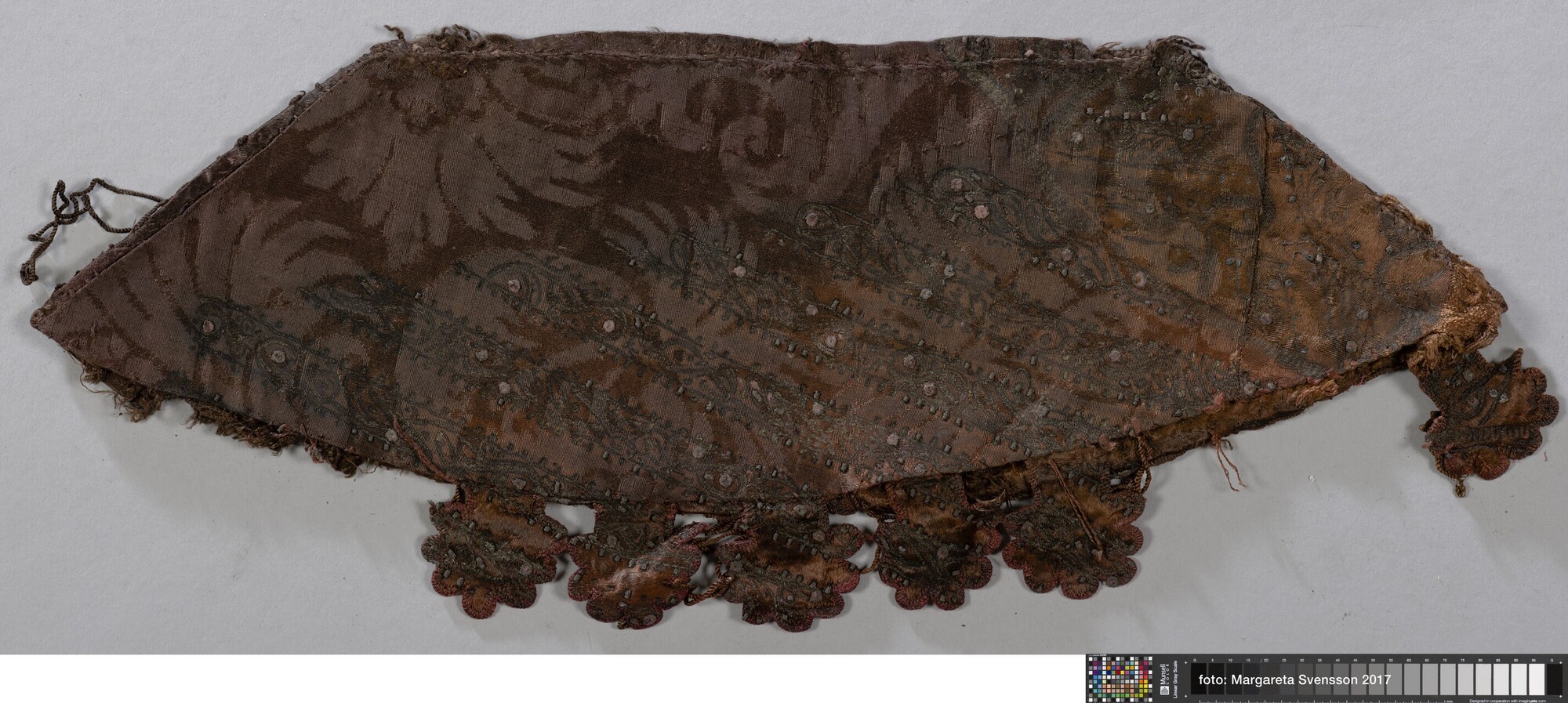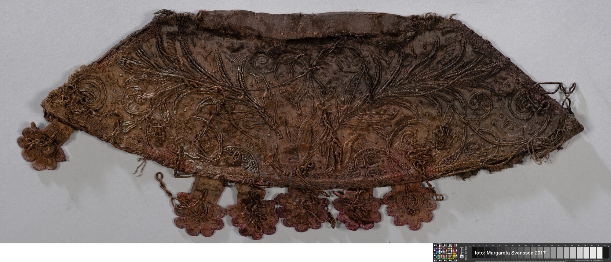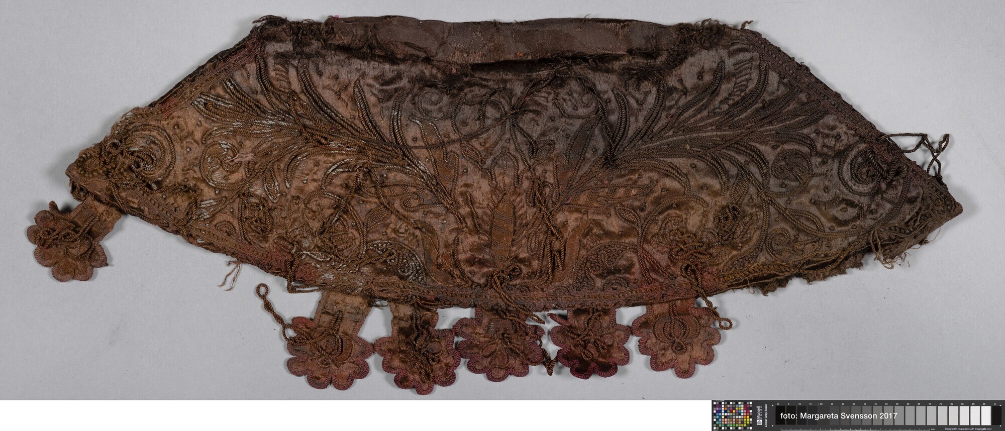 Kraag van satijn, enigszins rond van vorm, geheel geborduurd, met passement, gevoerd en langs de buitenrand versierd met bloemvormige 'flapjes'. Opgelegd borduurwerk van verschillende garens, getwijnd en ongetwijnd in verschillende diktes. De bloemvormige versiering langs de buitenrand is versierd met verschillende borduurpatronen: een klavertje, een kroontje, en nog iets onduidelijks. De randen zijn afgewerkt met ...