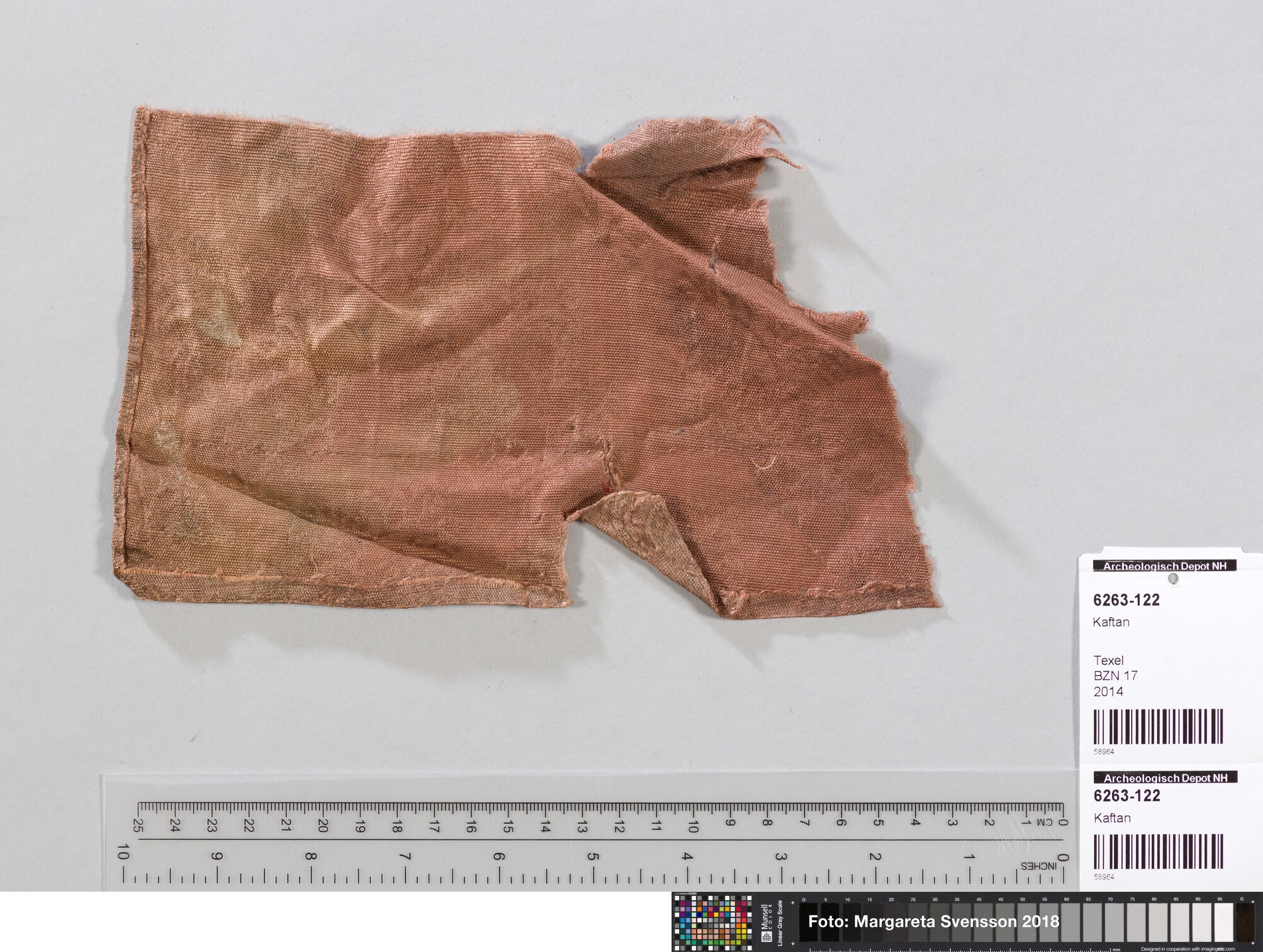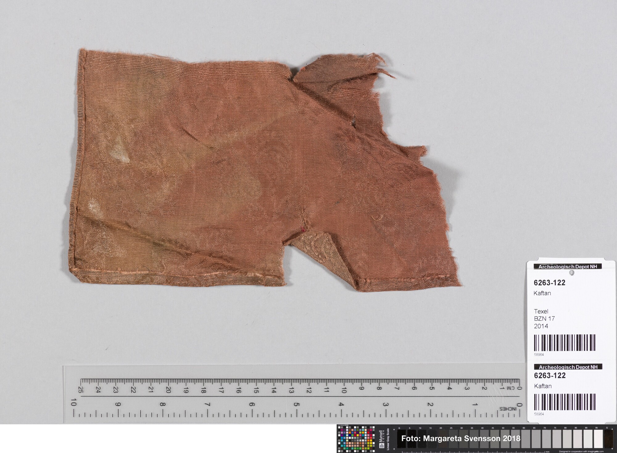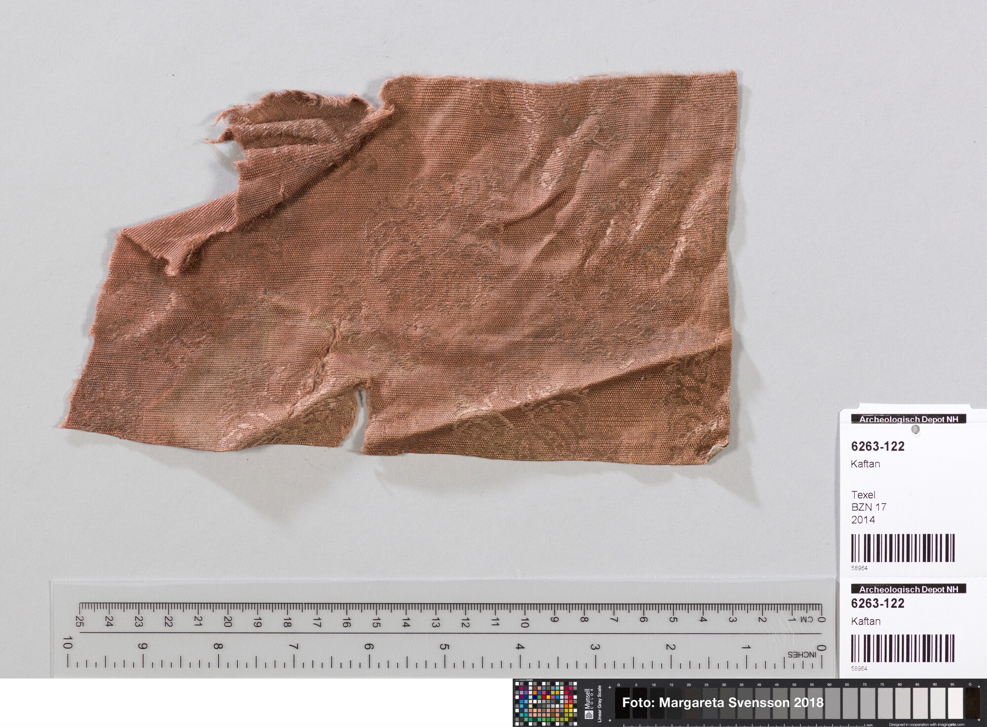 Kaftan; vermoedelijk deel van mouw; ingeweven patroon met floraal motief; zilverplaatjes
