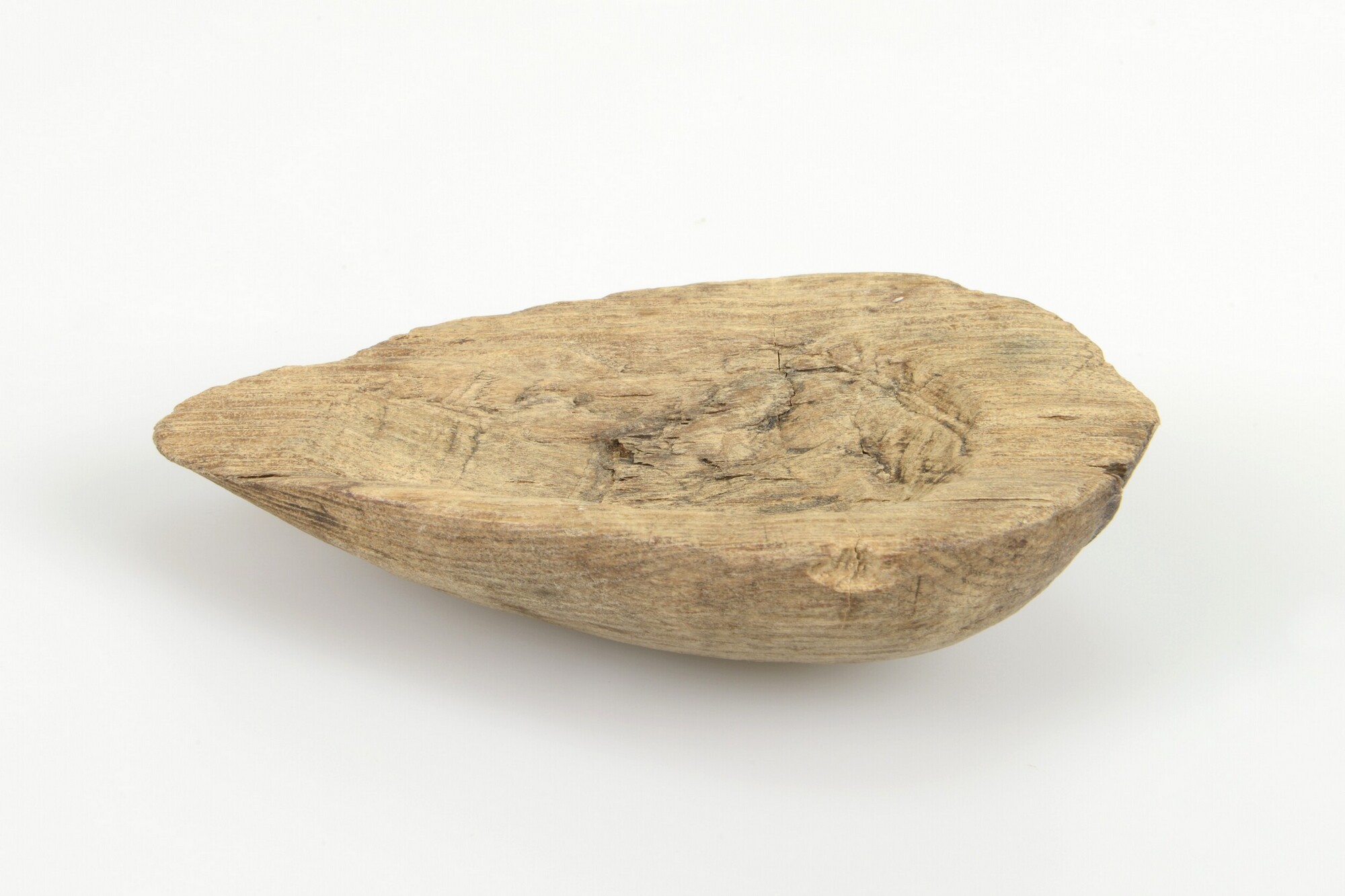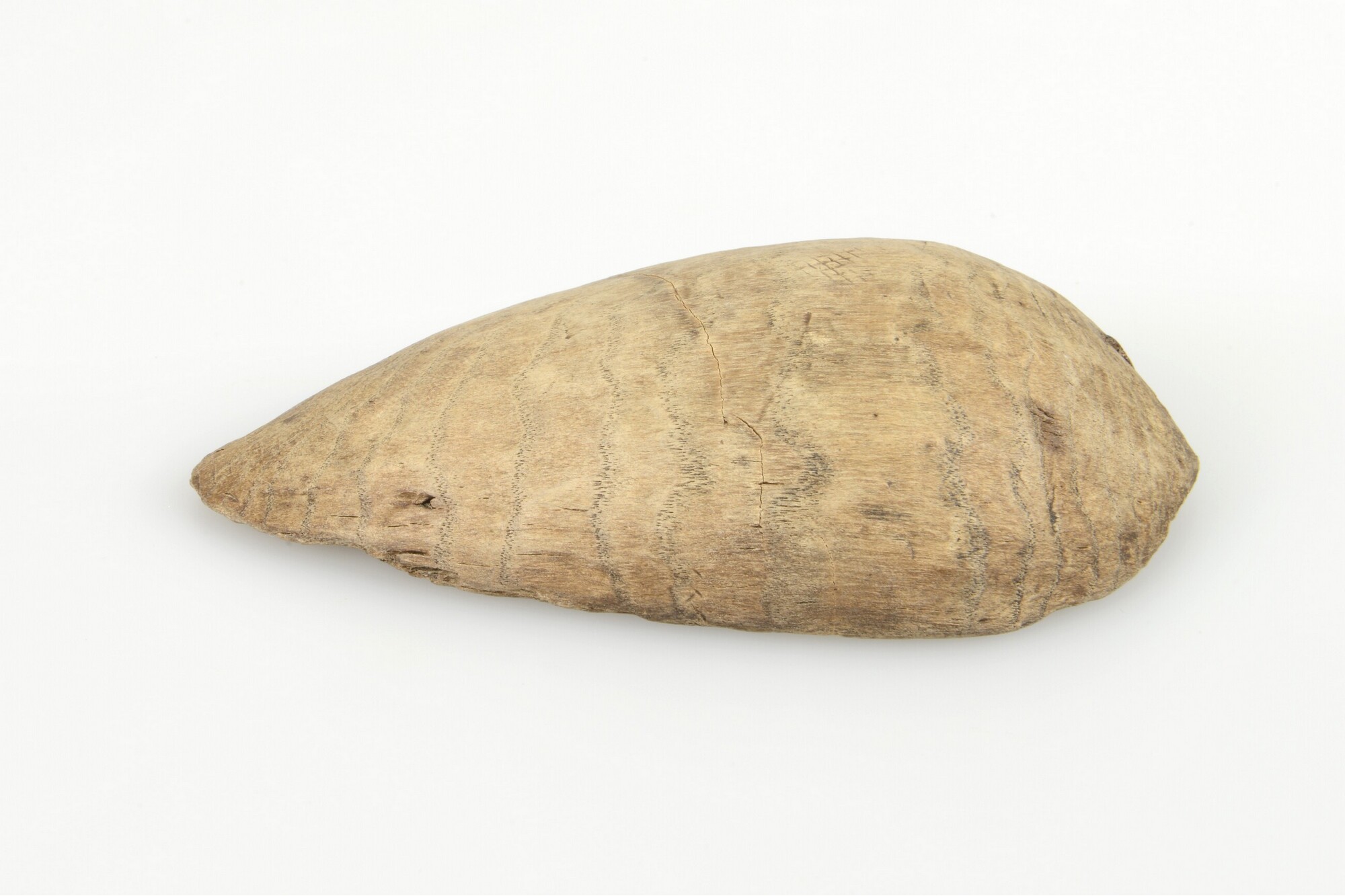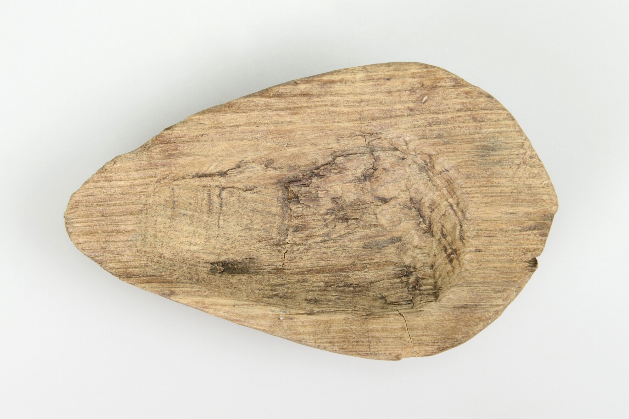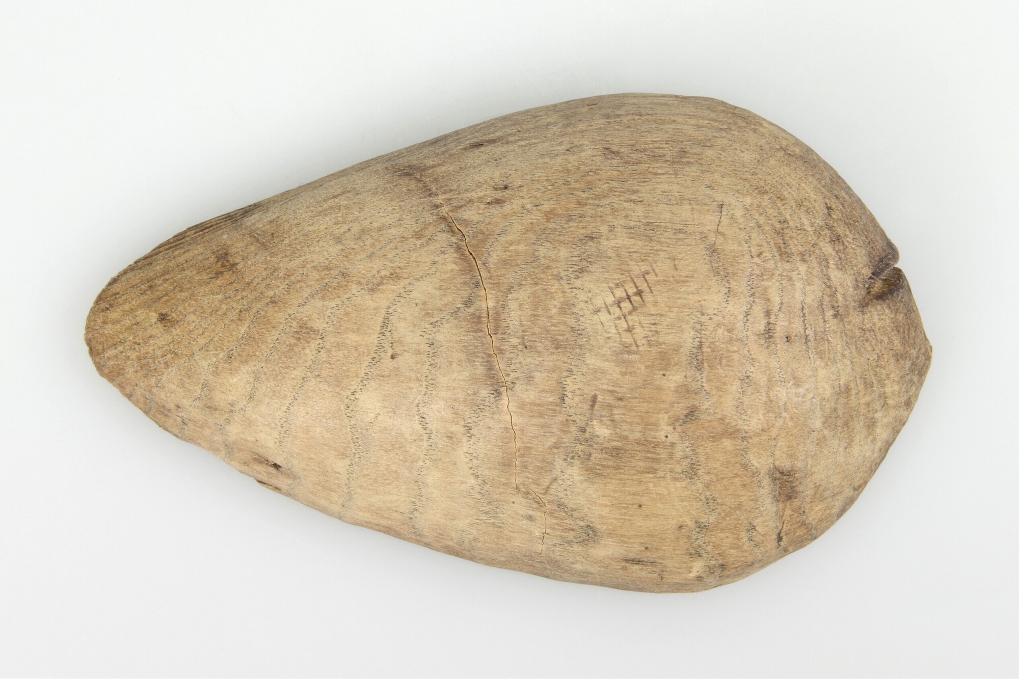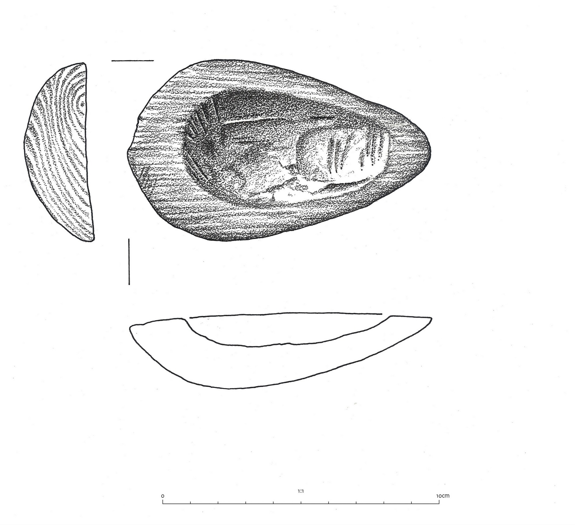 Nap; ovaal gesneden met puntachtige uiteinden. Aan de buitenzijde lopen snijsporen en is de nap relatief glad afgewerkt, terwijl de binnenkant vrij grof is uitgesneden
