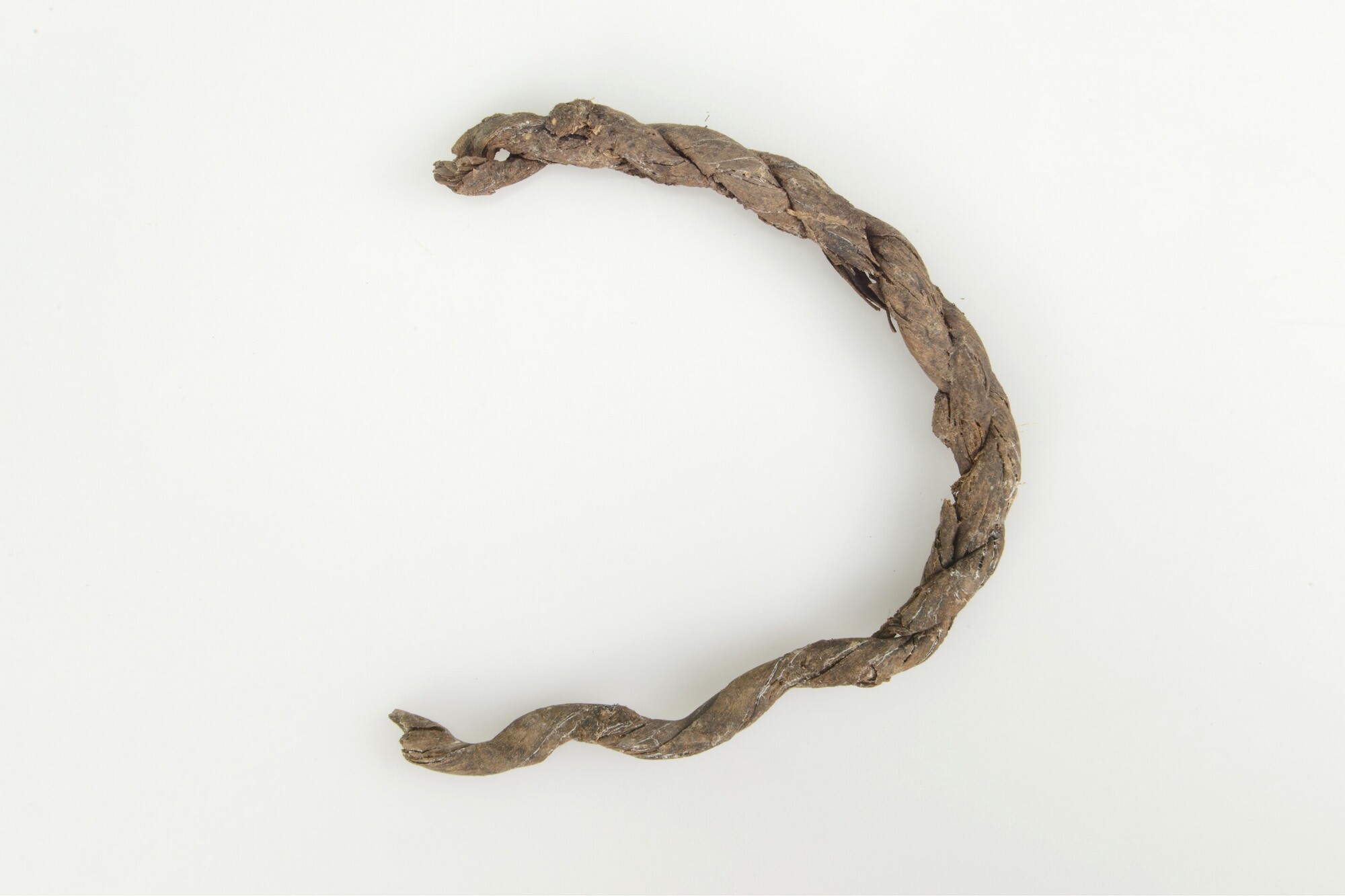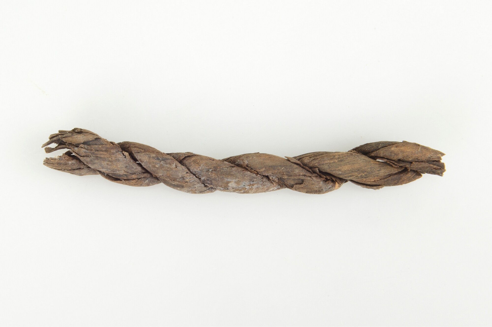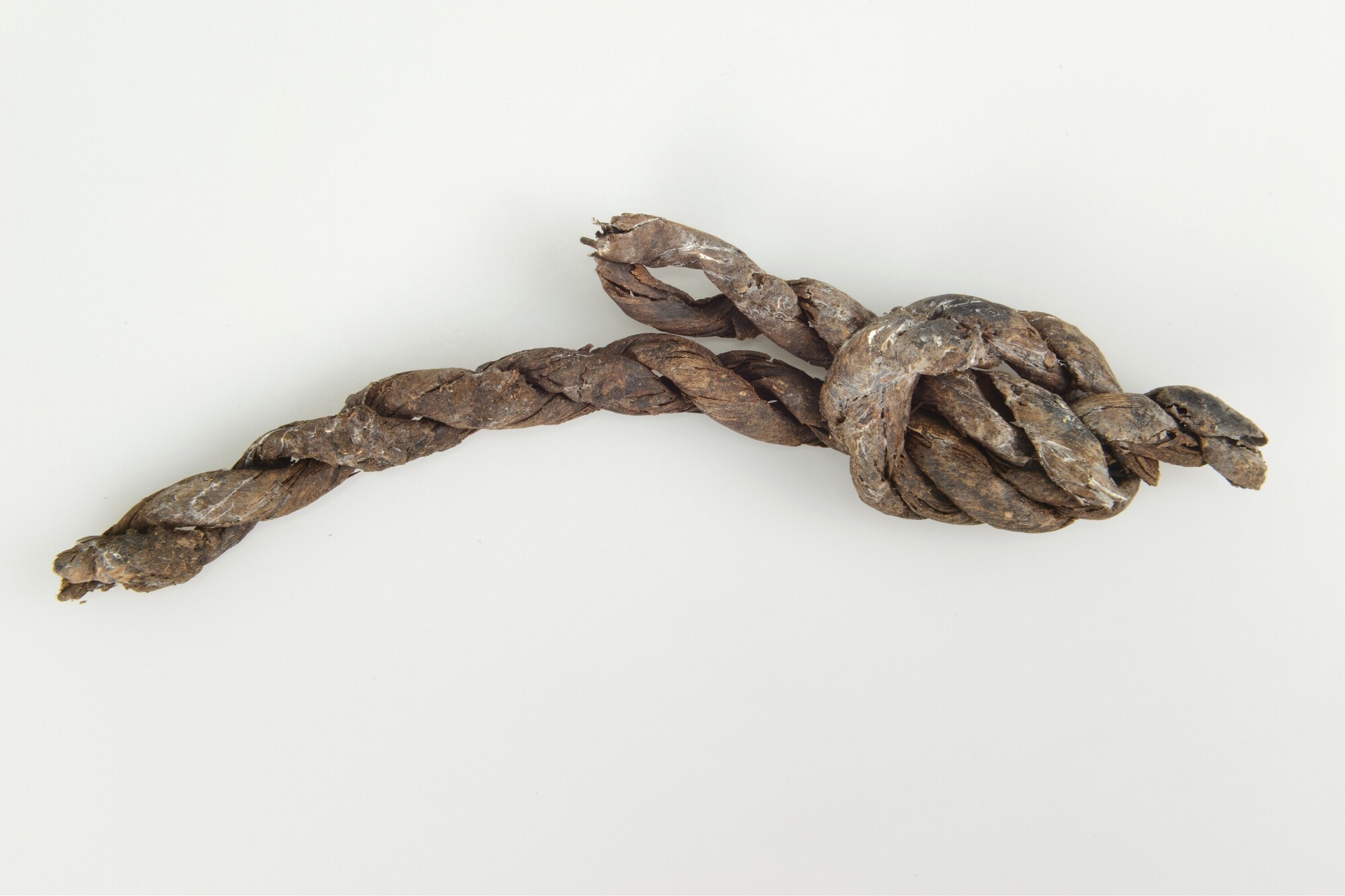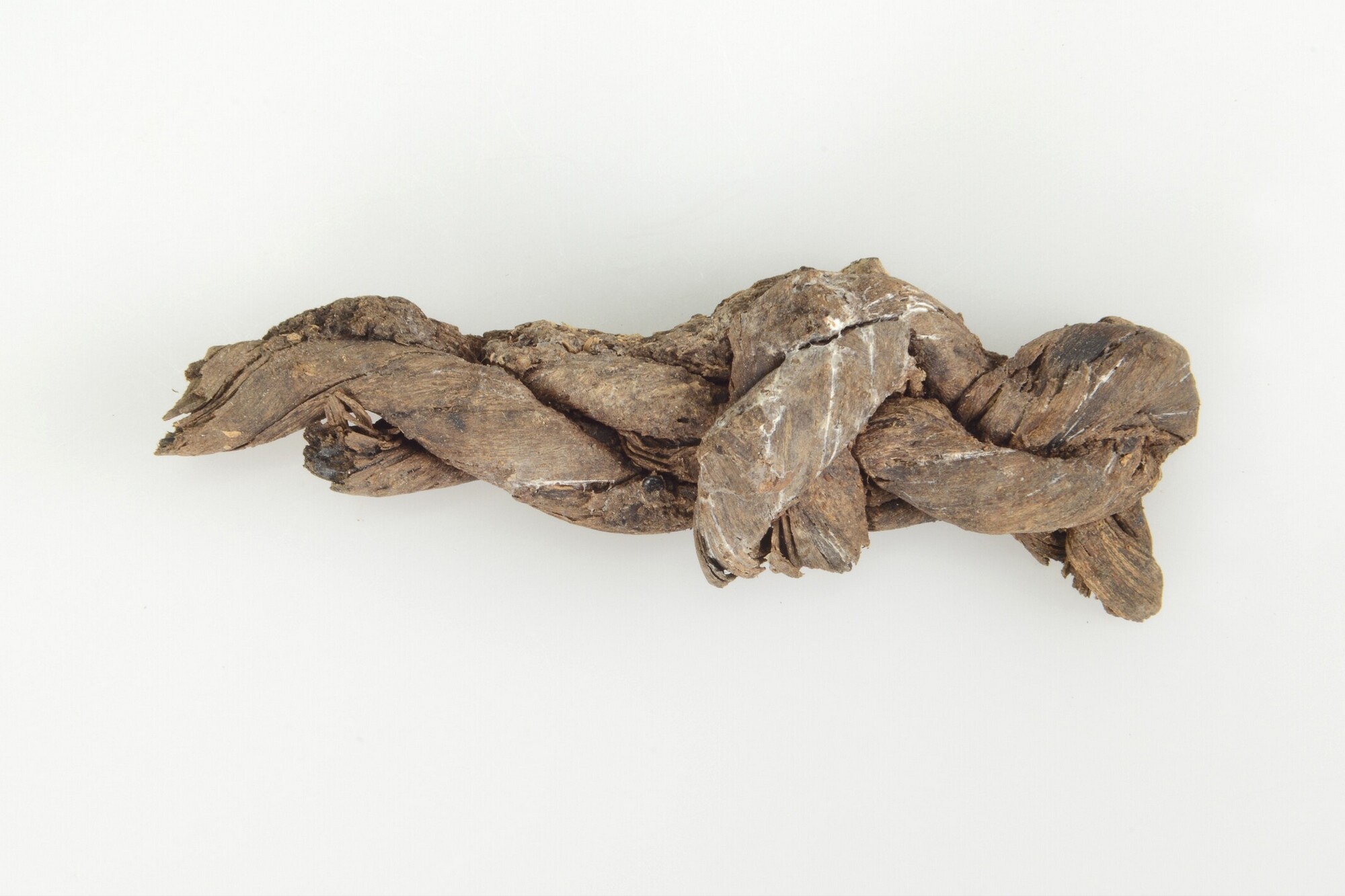 Touw met knoop; boombast; vier fragmenten touw van getwijnde bundels bast, één fragment is geknoopt