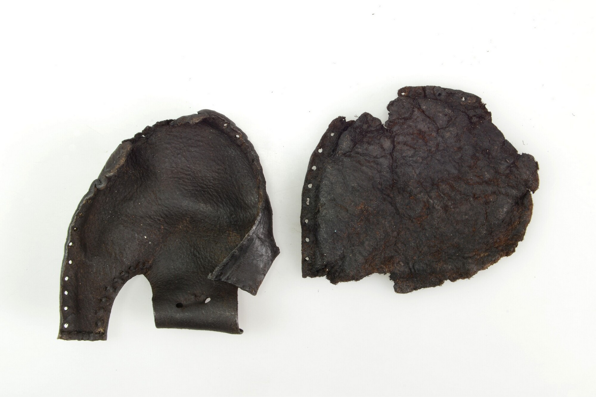 Schoen; leer; twee fragmenten van bovenleer schoen met stikranden. Eén fragment is van een van boven opengewerkte schoen