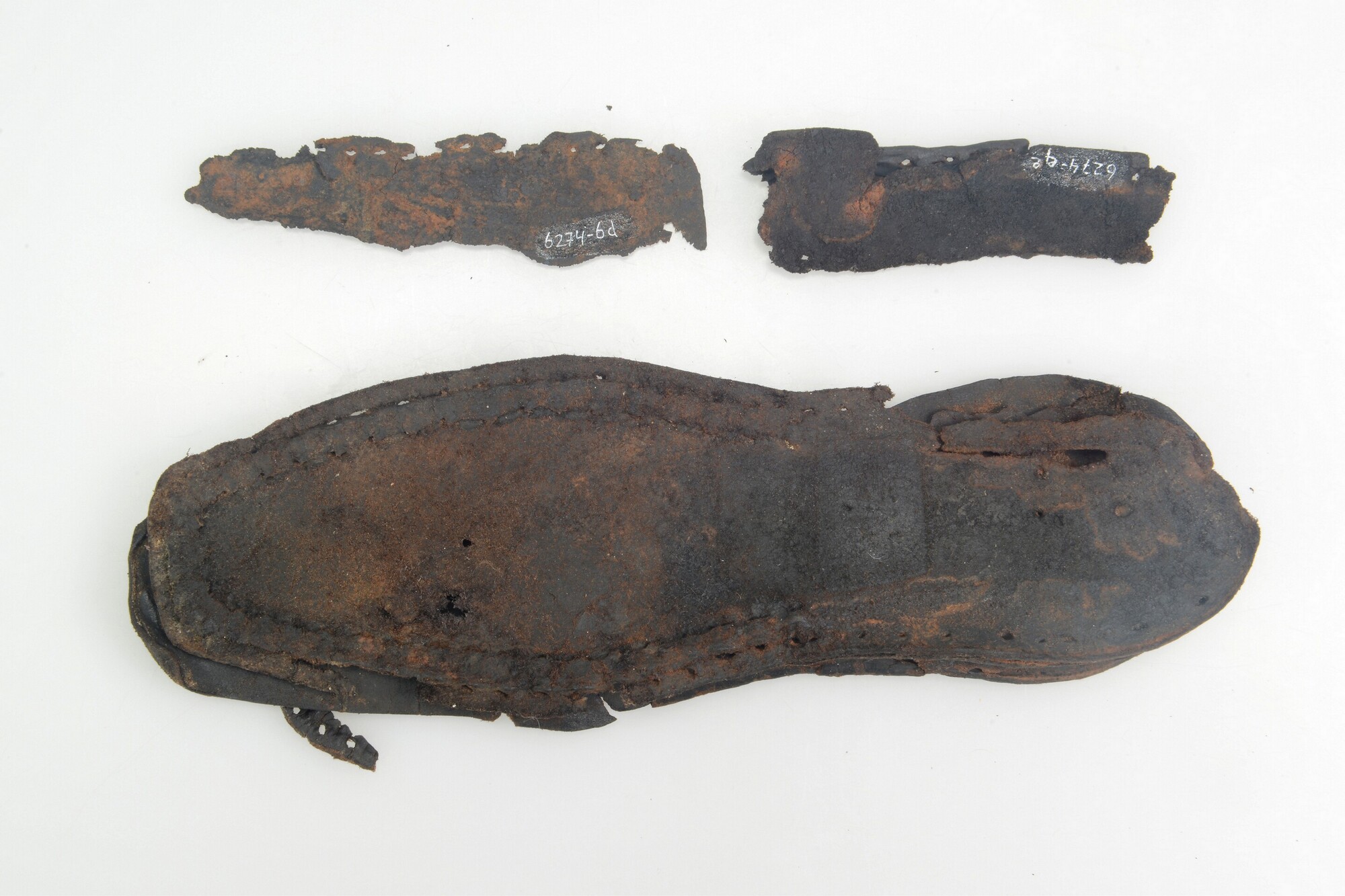 Onderdelen van een schoen; leer; twee fragmenten van een zool met stikranden en drie delen van mogelijk bovenleer met stikranden