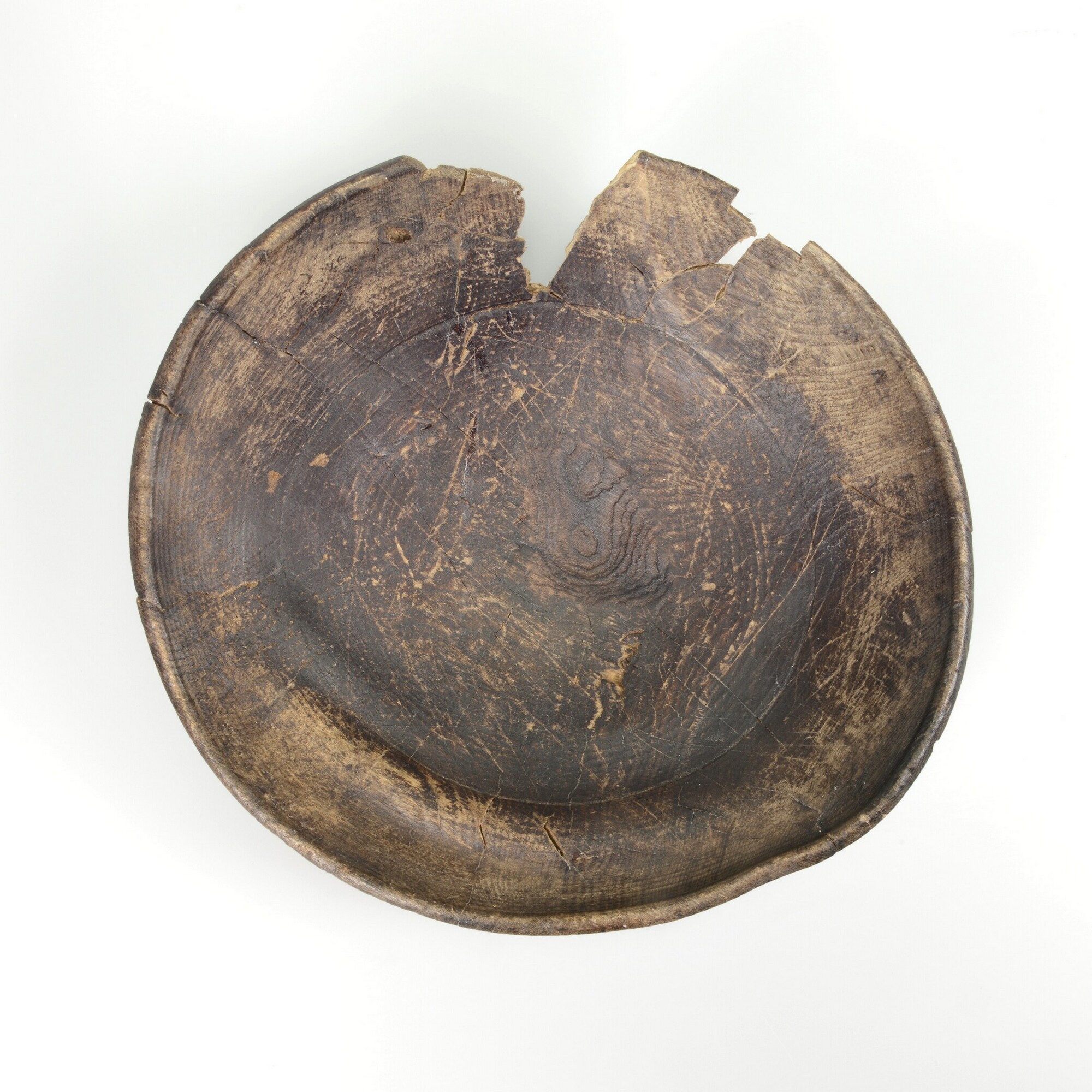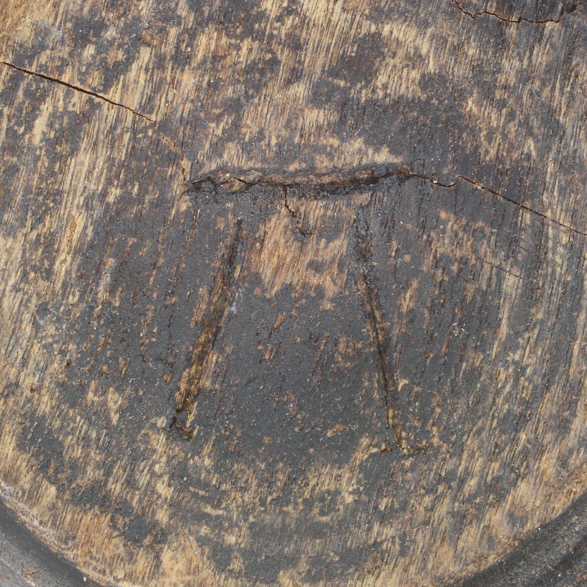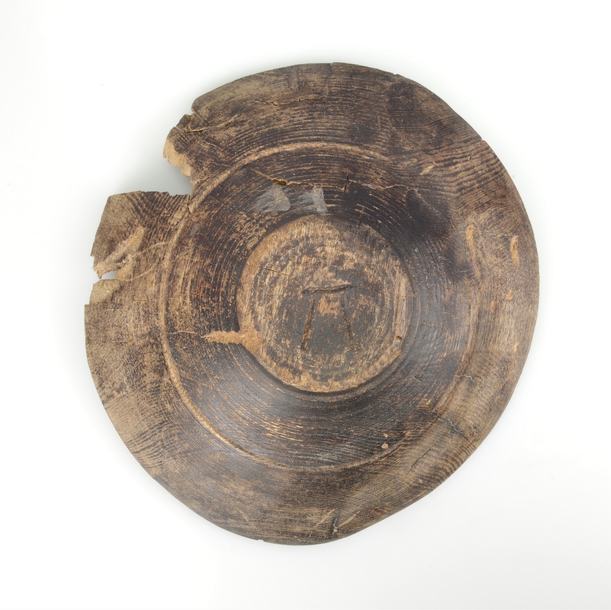 Bord; essenhout; diep rond bord met ingekrast huismerk op onderkant bodem; op standvlak