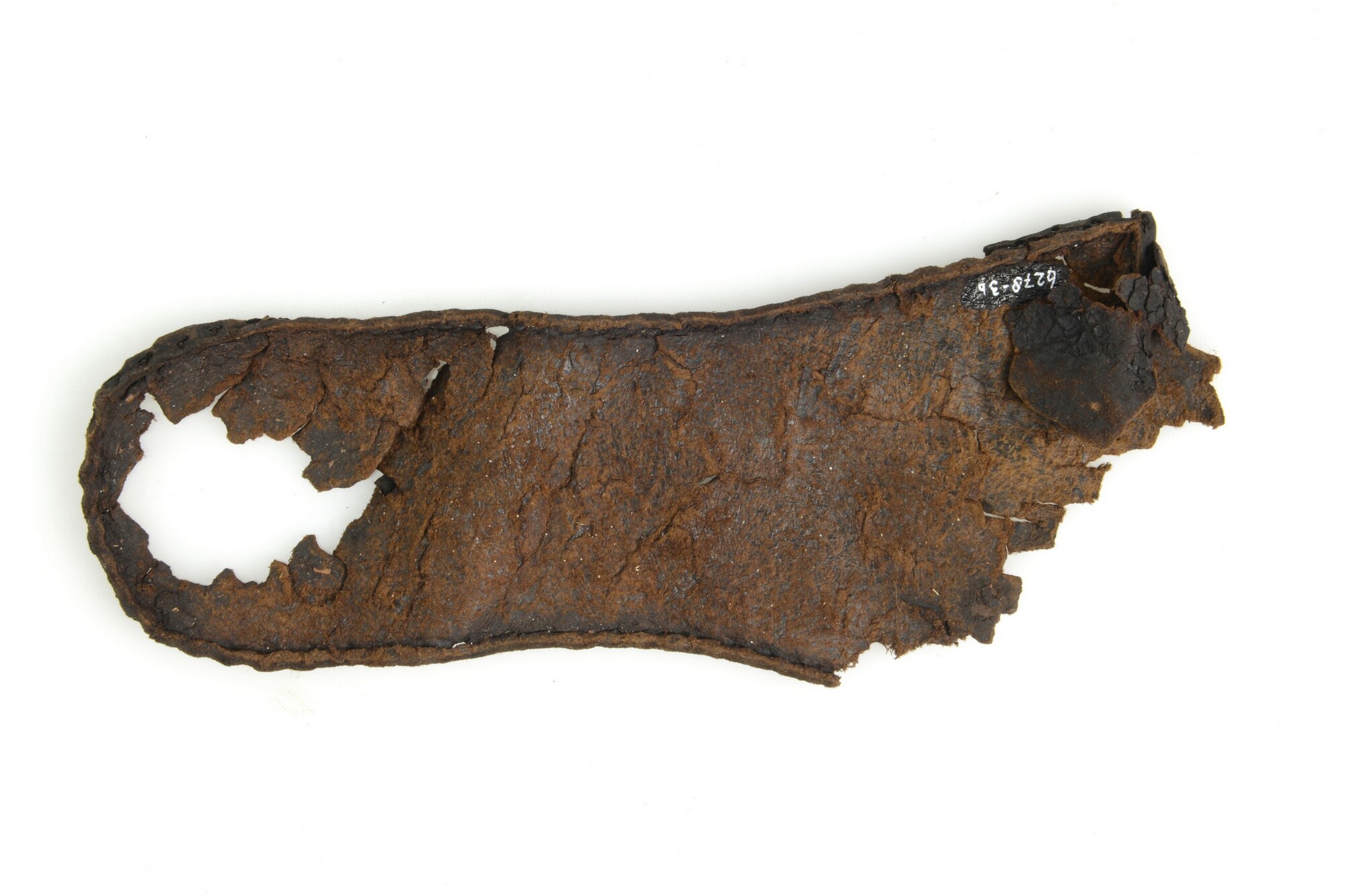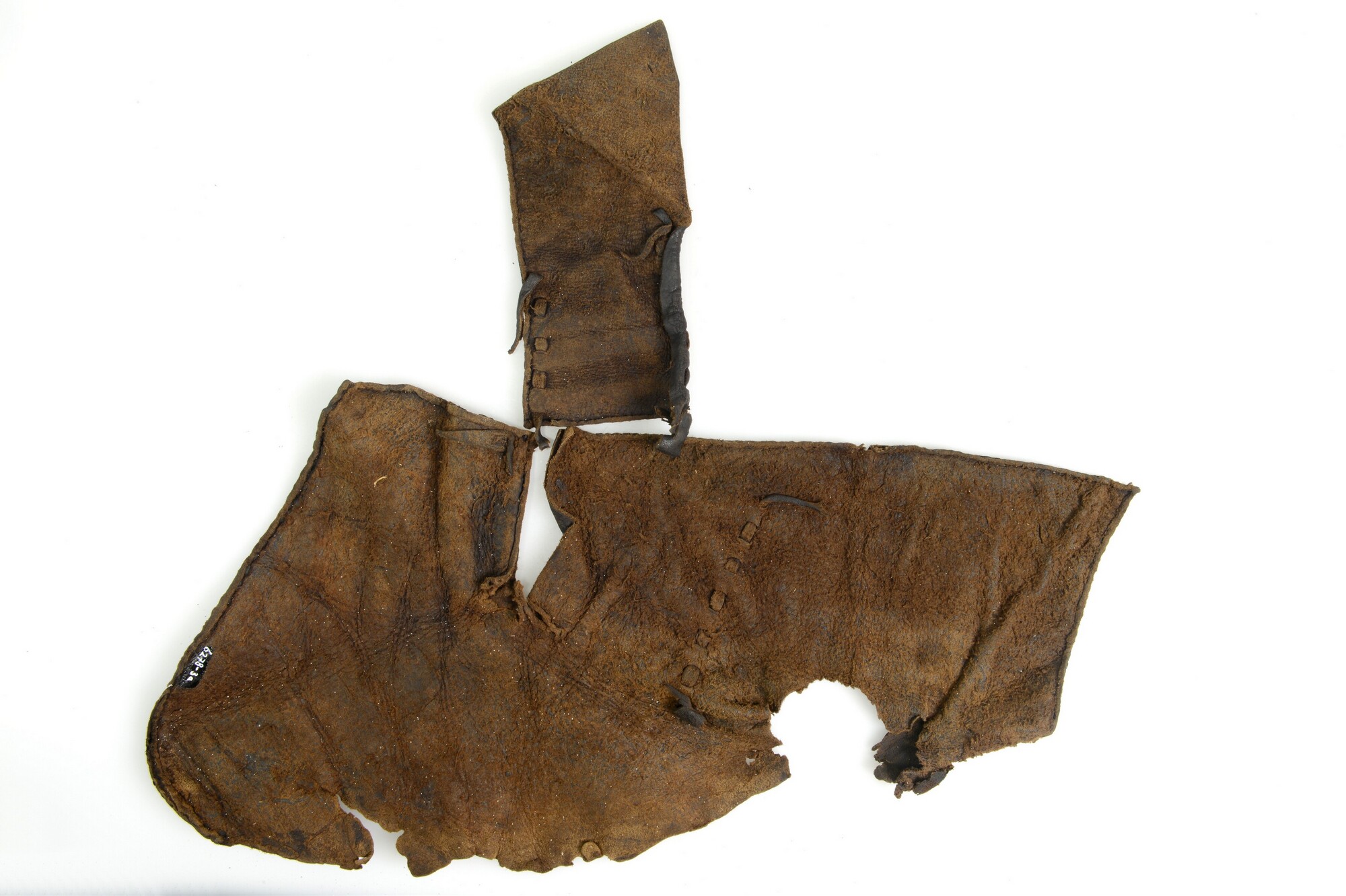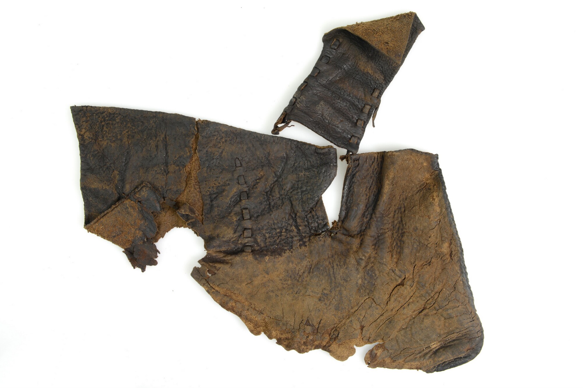 Schoen; leer; vier fragmenten van bovenleer van grote herenschoen, vetertjes met knopen aanwezig