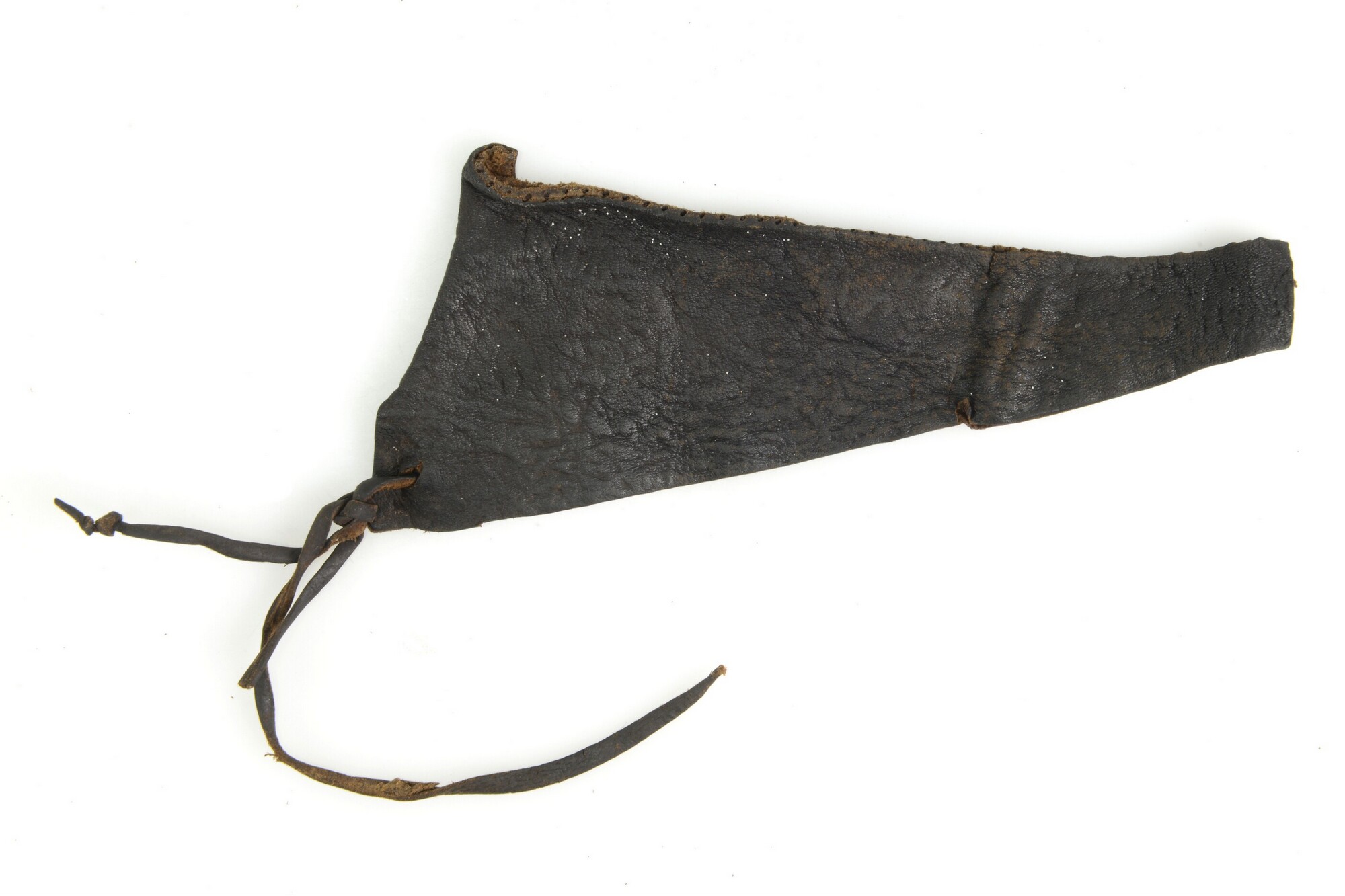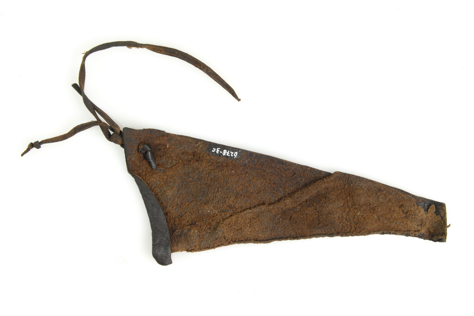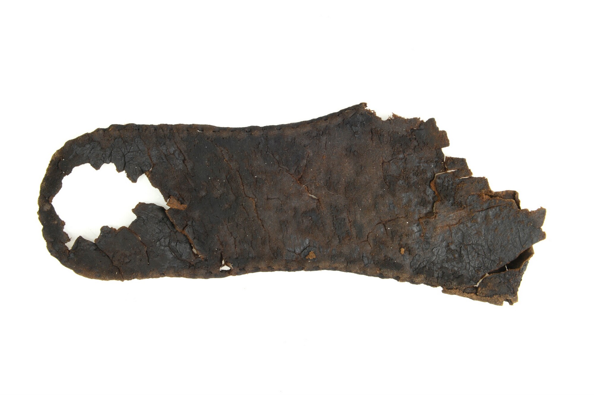 Schoen; leer; vier fragmenten van bovenleer van grote herenschoen, vetertjes met knopen aanwezig