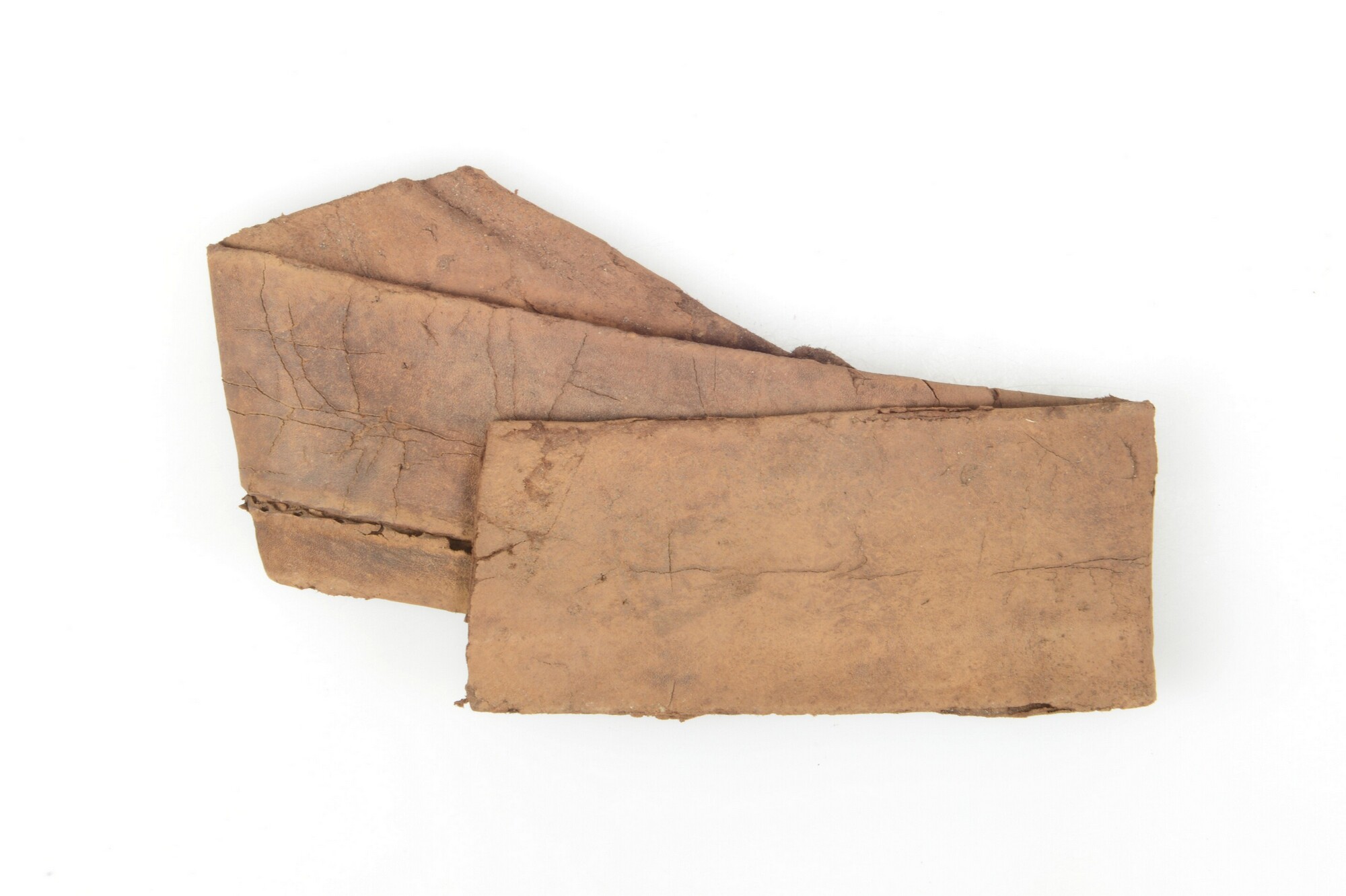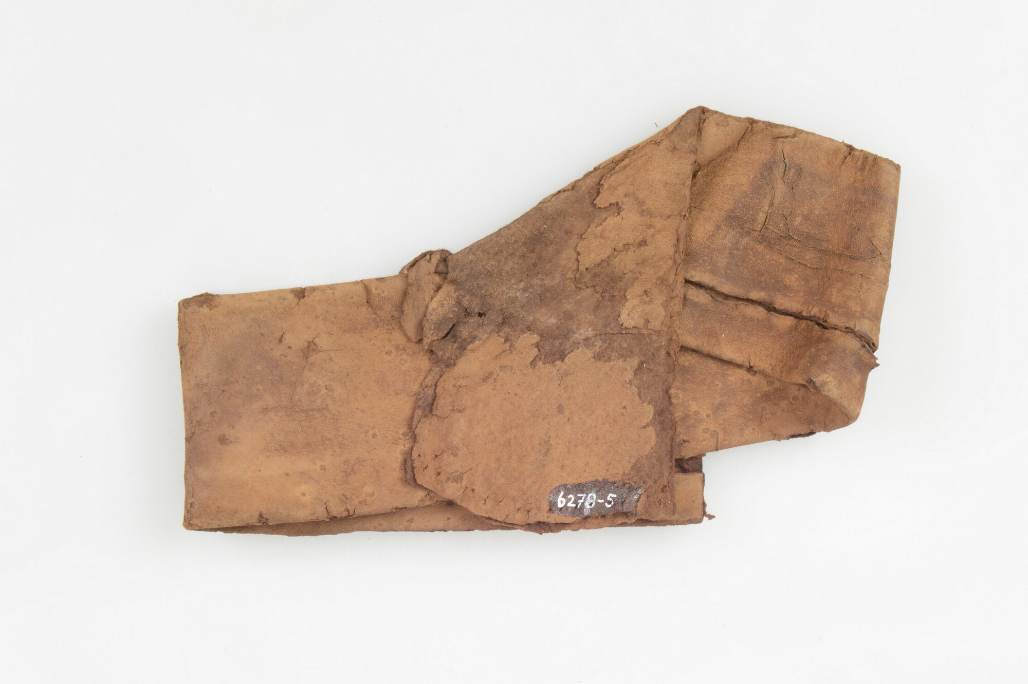 Schede voor zwaard of lange dolk; leer; smalle, langwerpige vorm met opening met rijggaten aan één zijde, beide uiteinden missen; opgevouwen