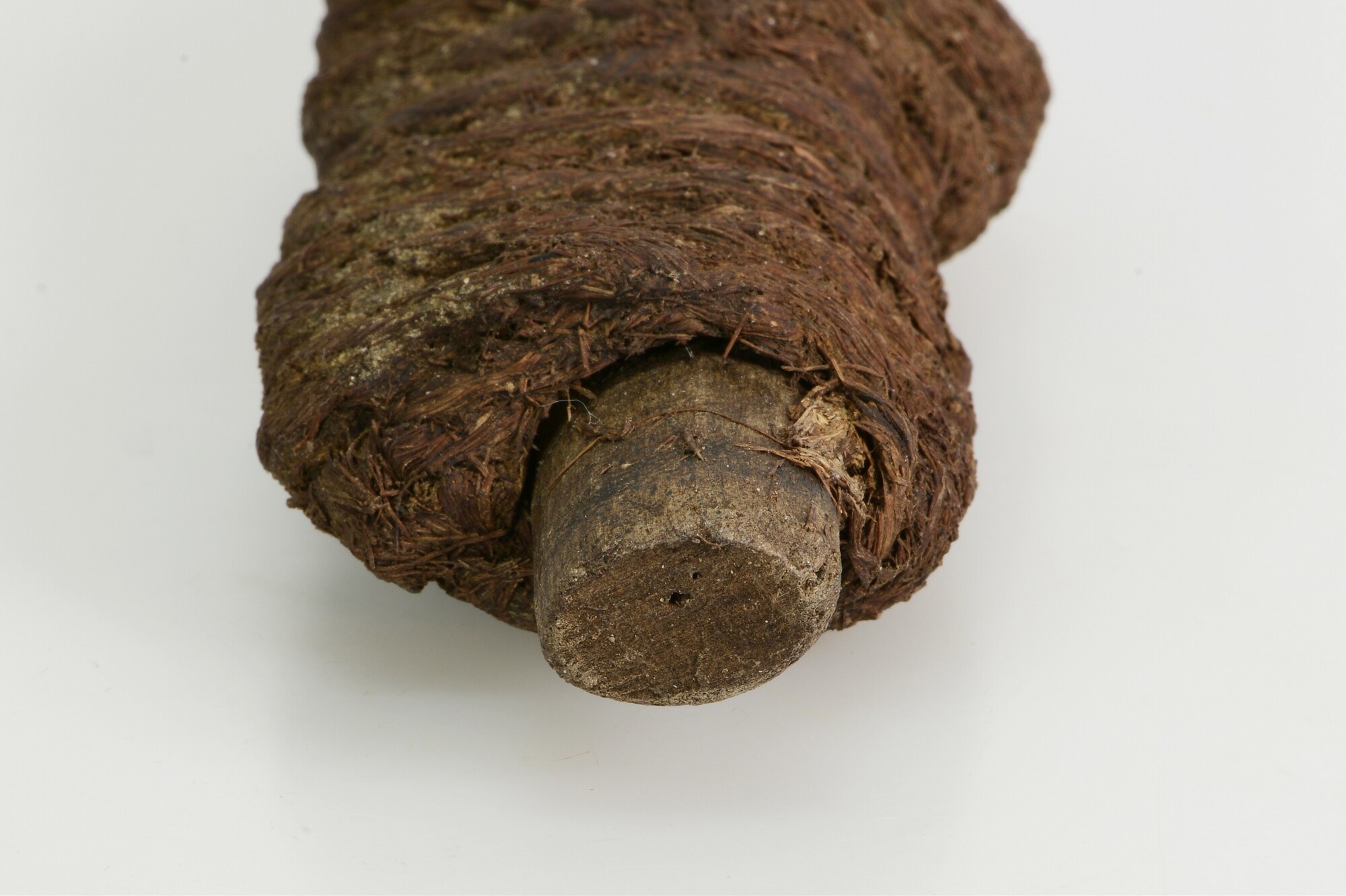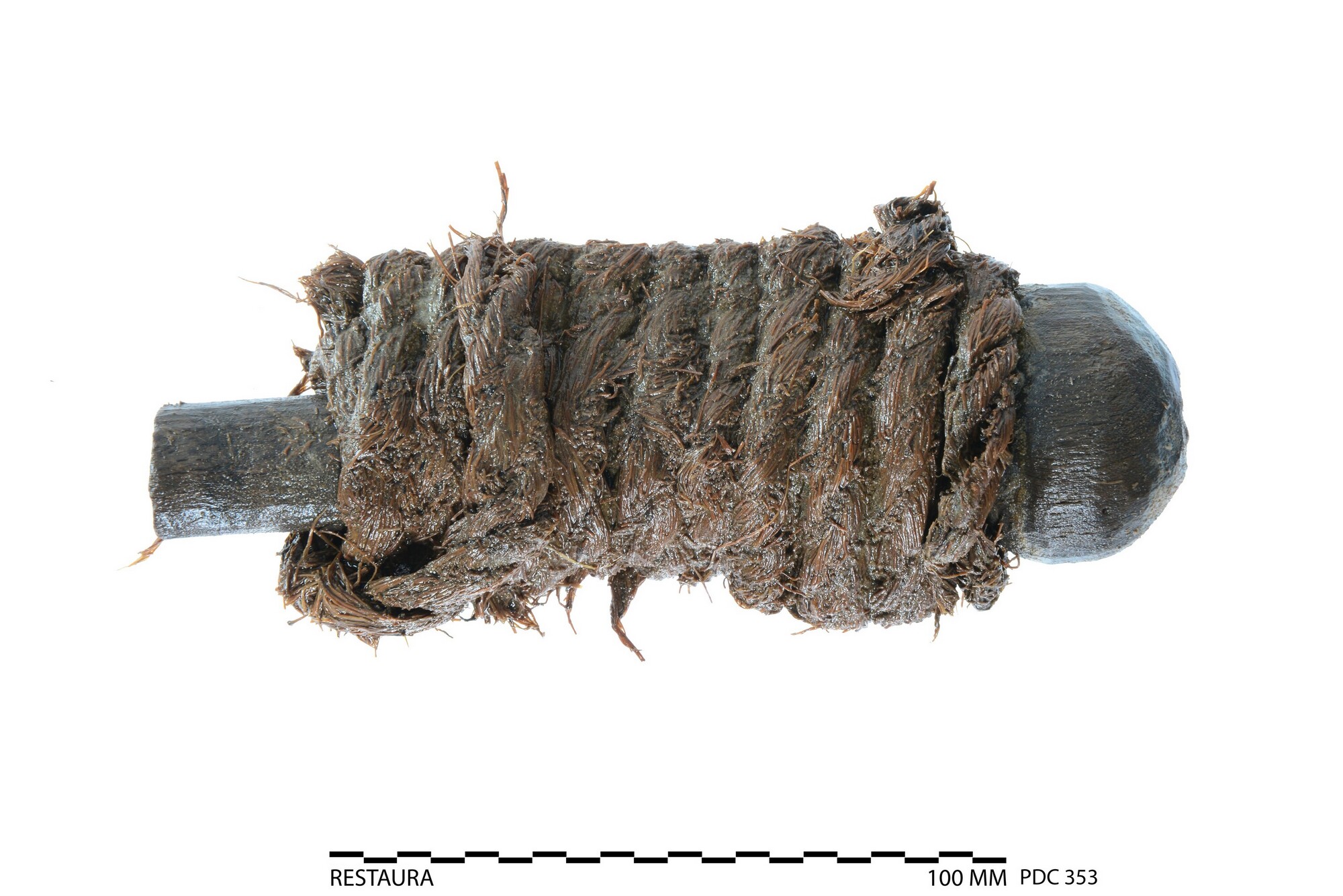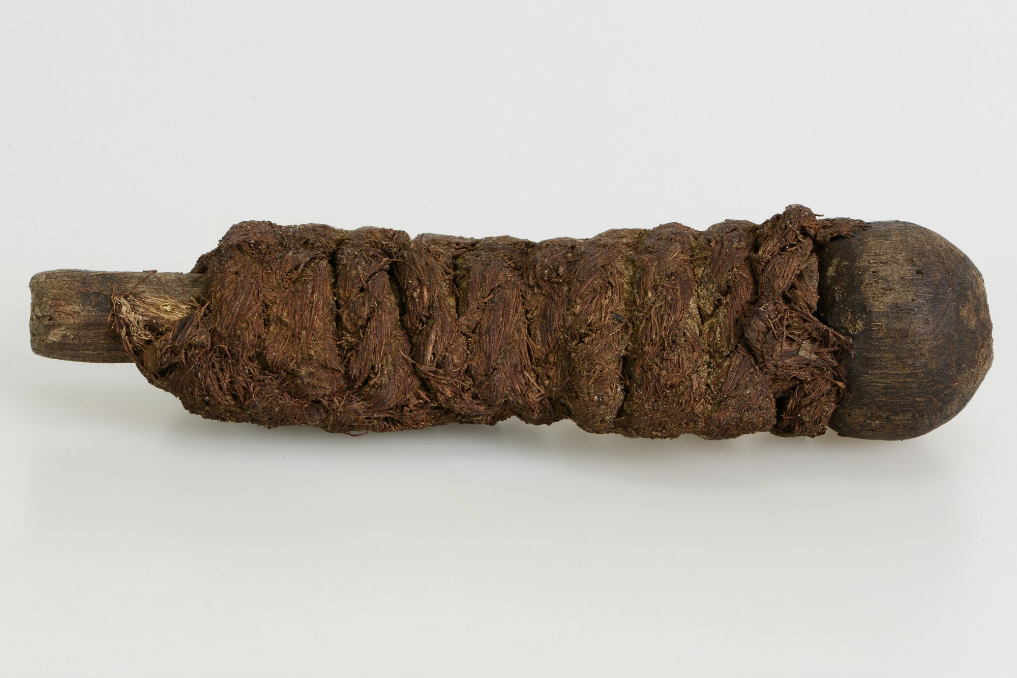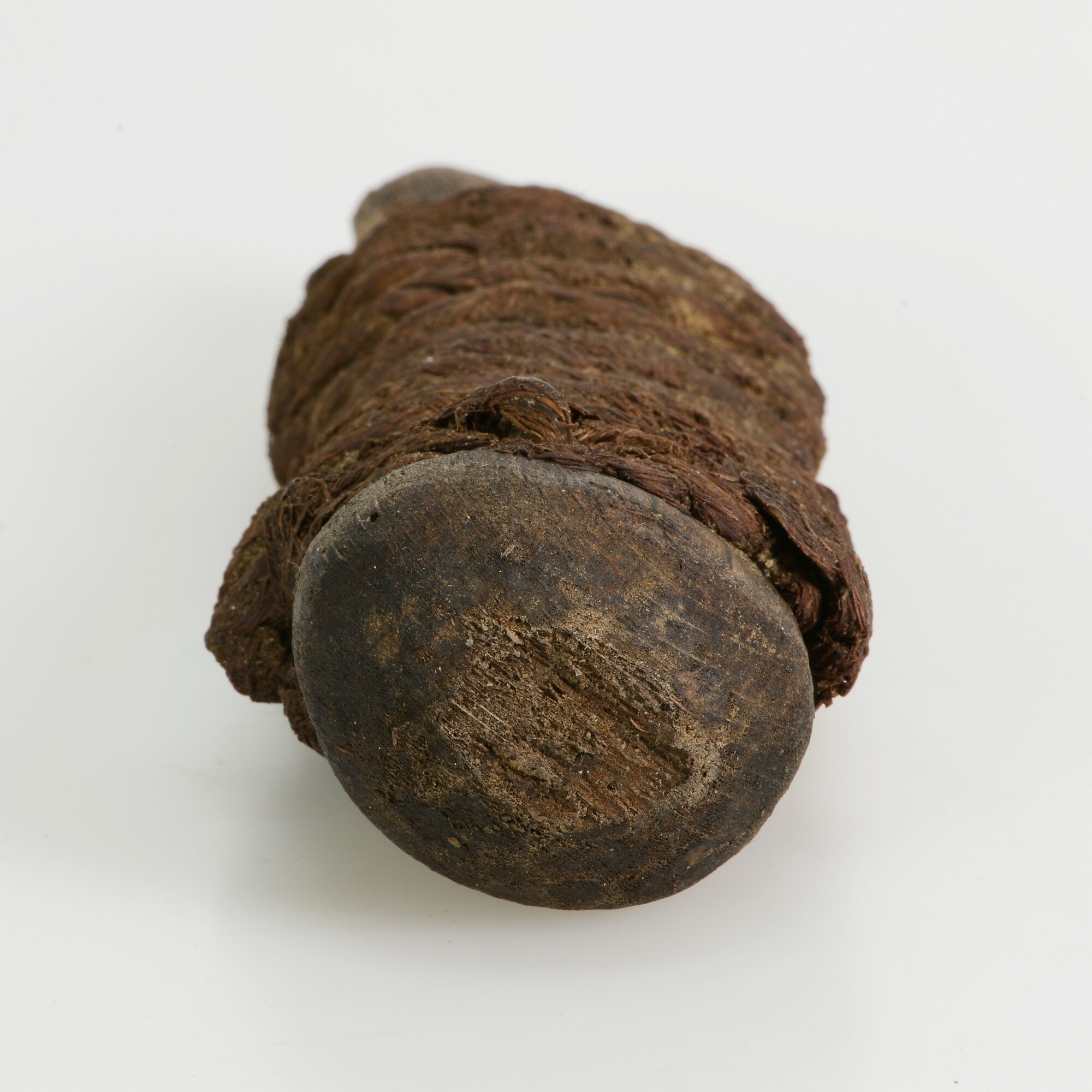 Lontstok; fragment van het voor-middendeel, inclusief de knop van het lontuiteinde, maar het lontuiteinde zelf ontbreekt; de stok is zijdelings afgeplat: 1.5-2.0 cm; hieromheen gewikkeld liggen twee lagen lont; driestrengs, rechtsgeslagen, diameter=0.8-0.9 cm; de knop is enigszins ovaal, 31x41 mm en zonder versiering; nat gewicht: 125 gram