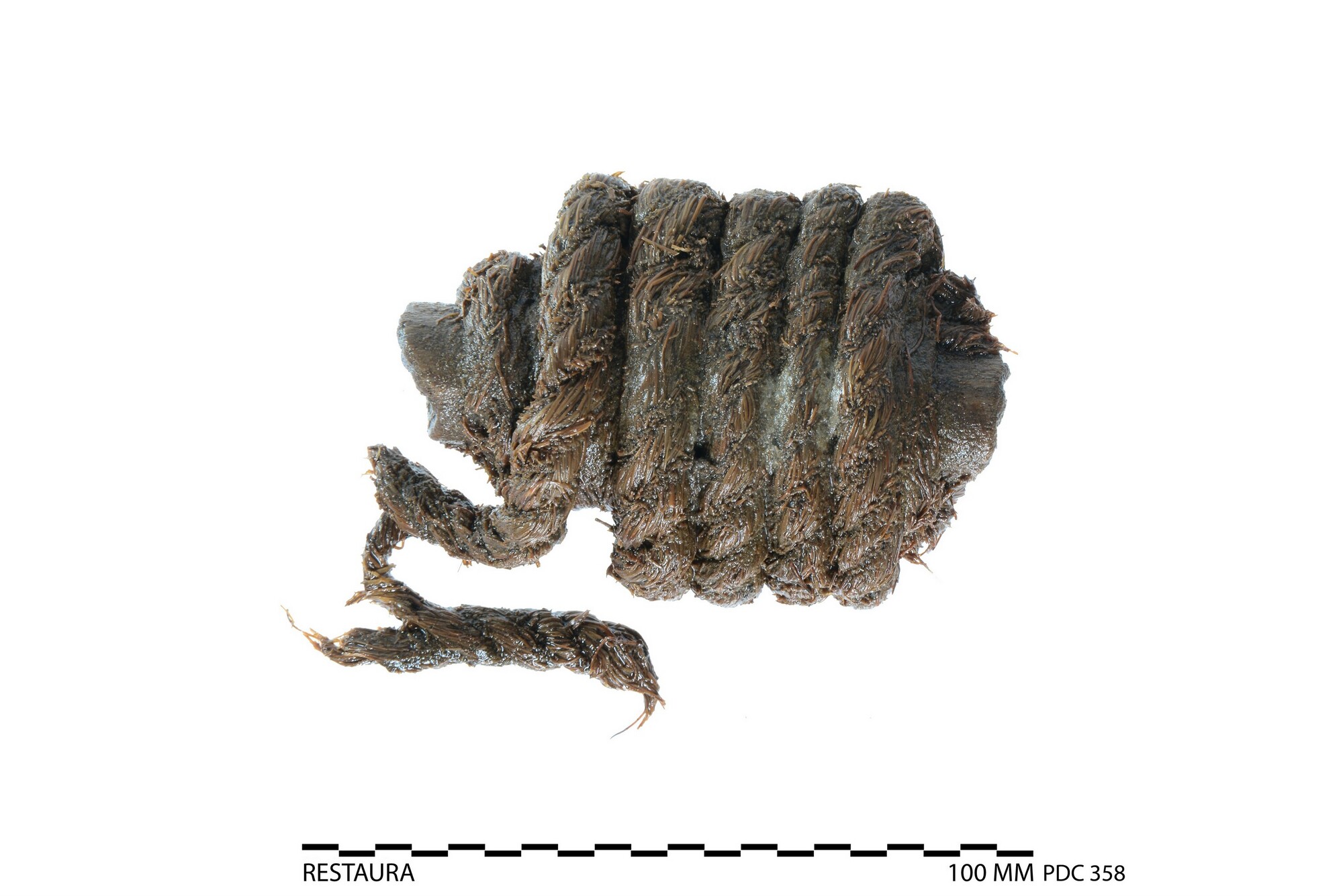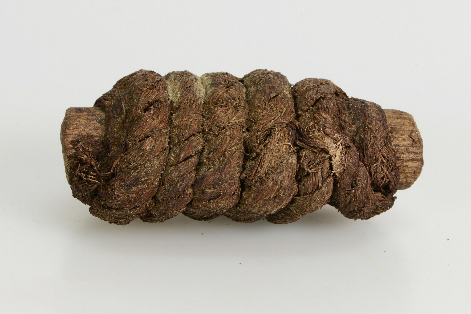Lontstok, fragment van het middendeel, uitsluitend een stuk stok daarvan; de stok is rond: 1.8 cm; hieromheen gewikkeld ligt een restant van twee lagen lont; driestrengs, rechtsgeslagen, diameter=0.7-0.9 cm; nat gewicht: 63 gram